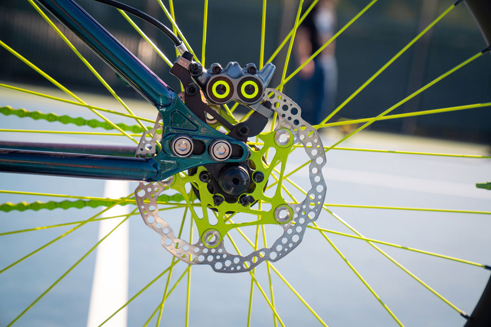I’m pretty sure the only reason Stirling went for the Magura MT7’s was the yellow pops of color. The Hope floating rotor is yet another item that has been custom painted for the build.