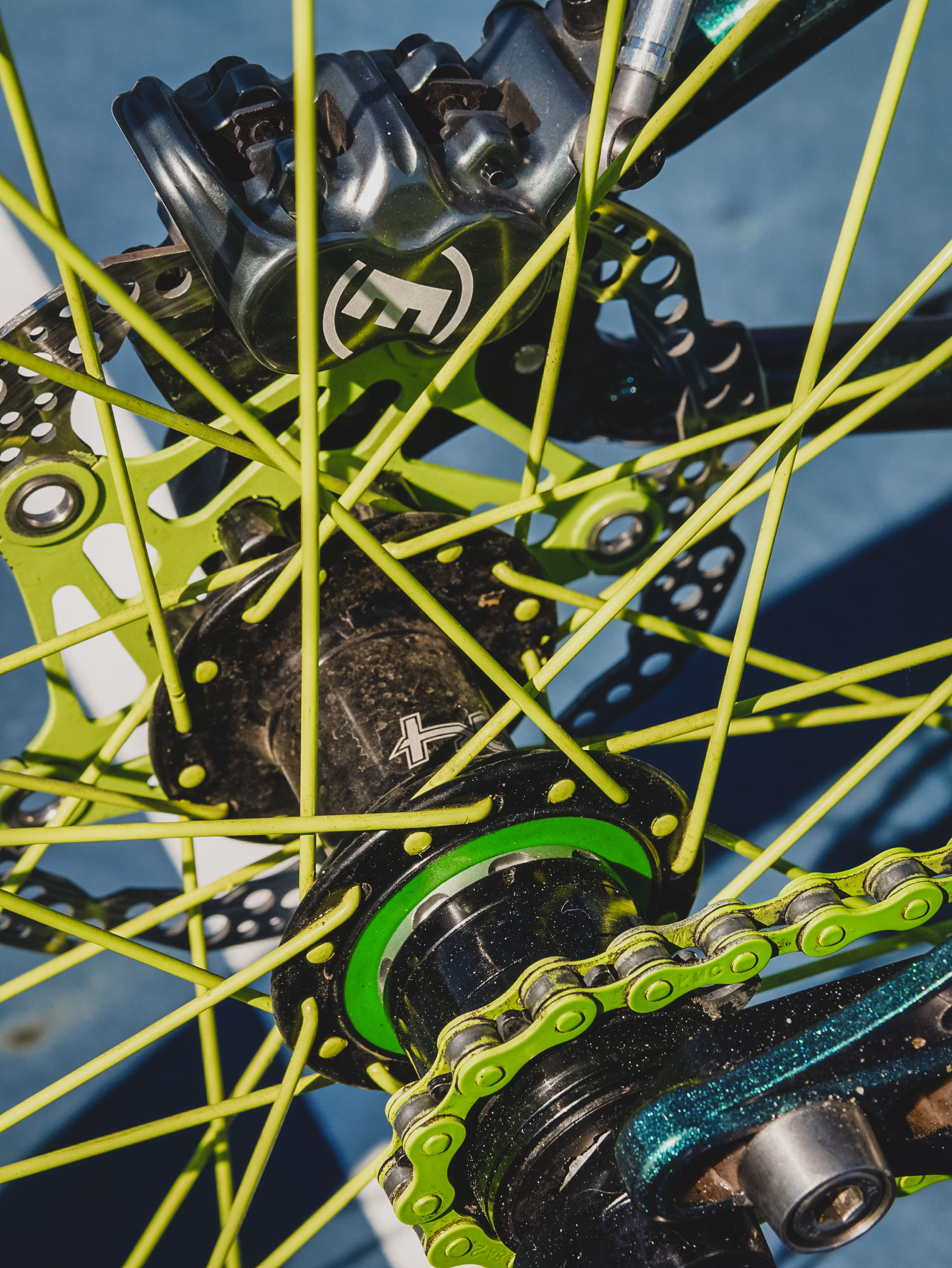 Those Derby rims are laced to Hope Pro 4 hubs with more dayglo yellow via the spokes, the green KMC chain is the perfect match.