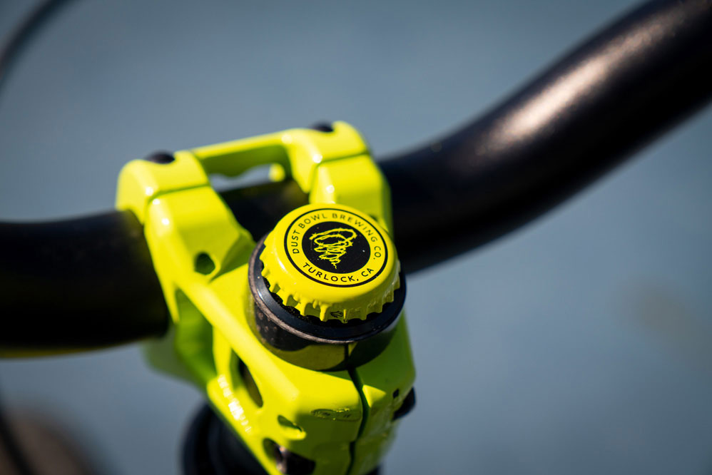 The cockpit is built around a Deity 80mm rise Highside handlebar and custom painted Deity Cavity stem, complete with Dustbowl Brewing stem cap and Deity Knuckleduster grips.