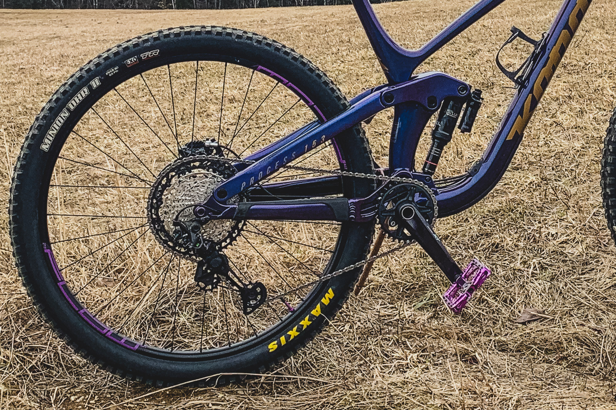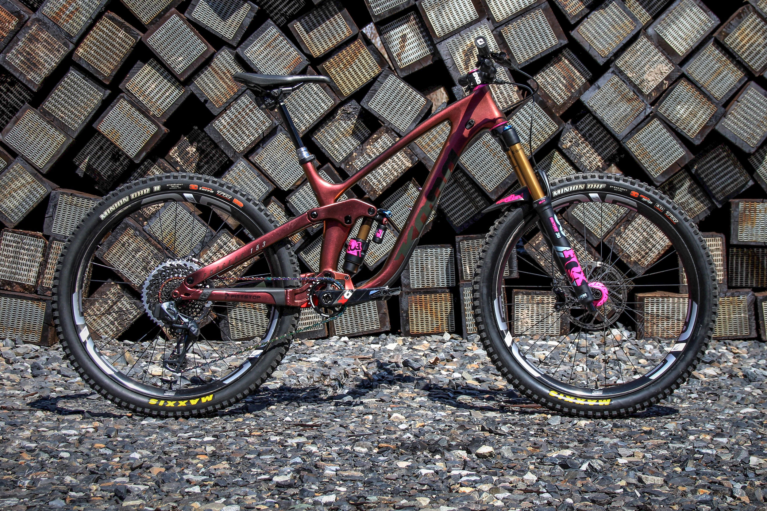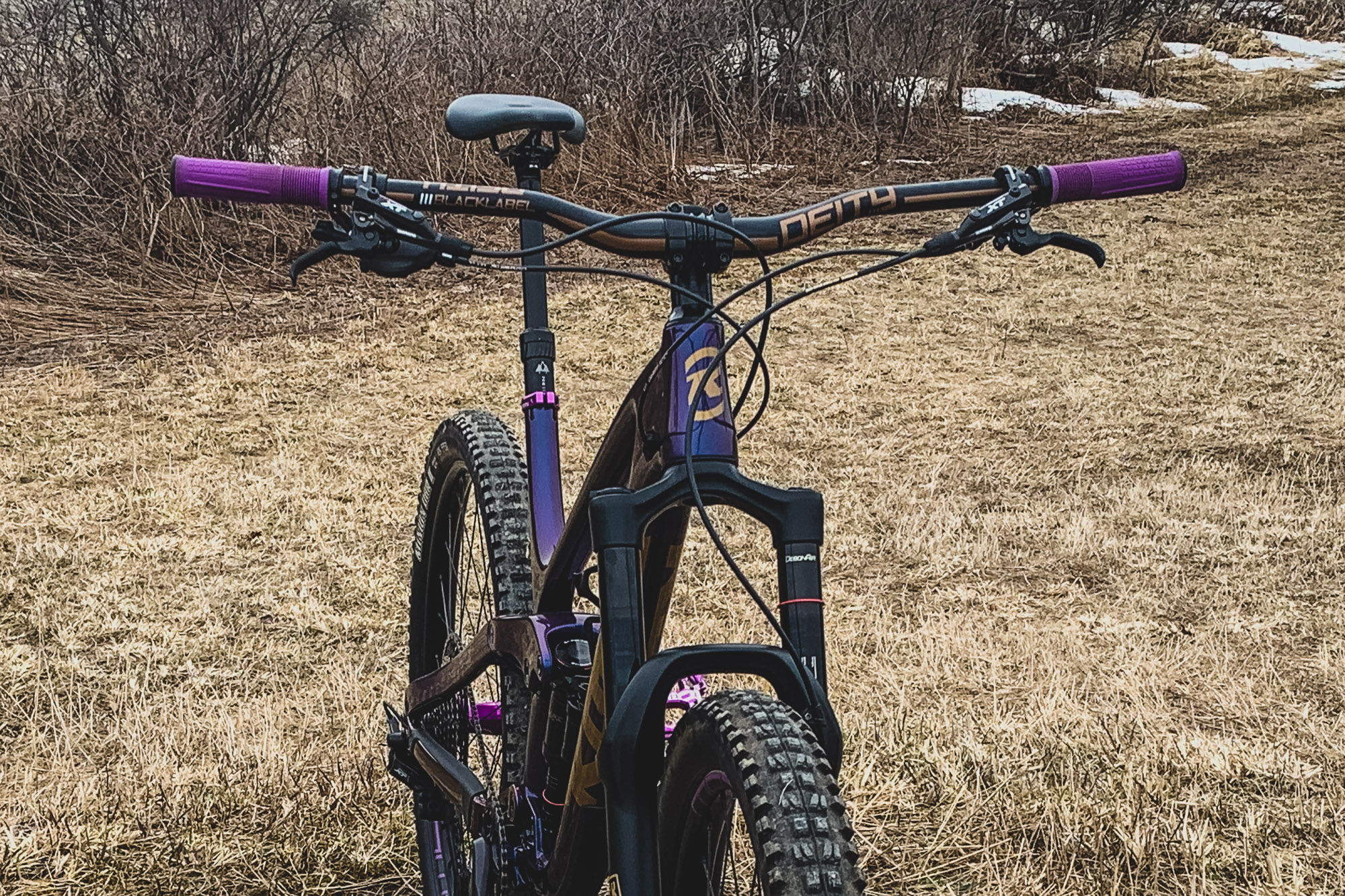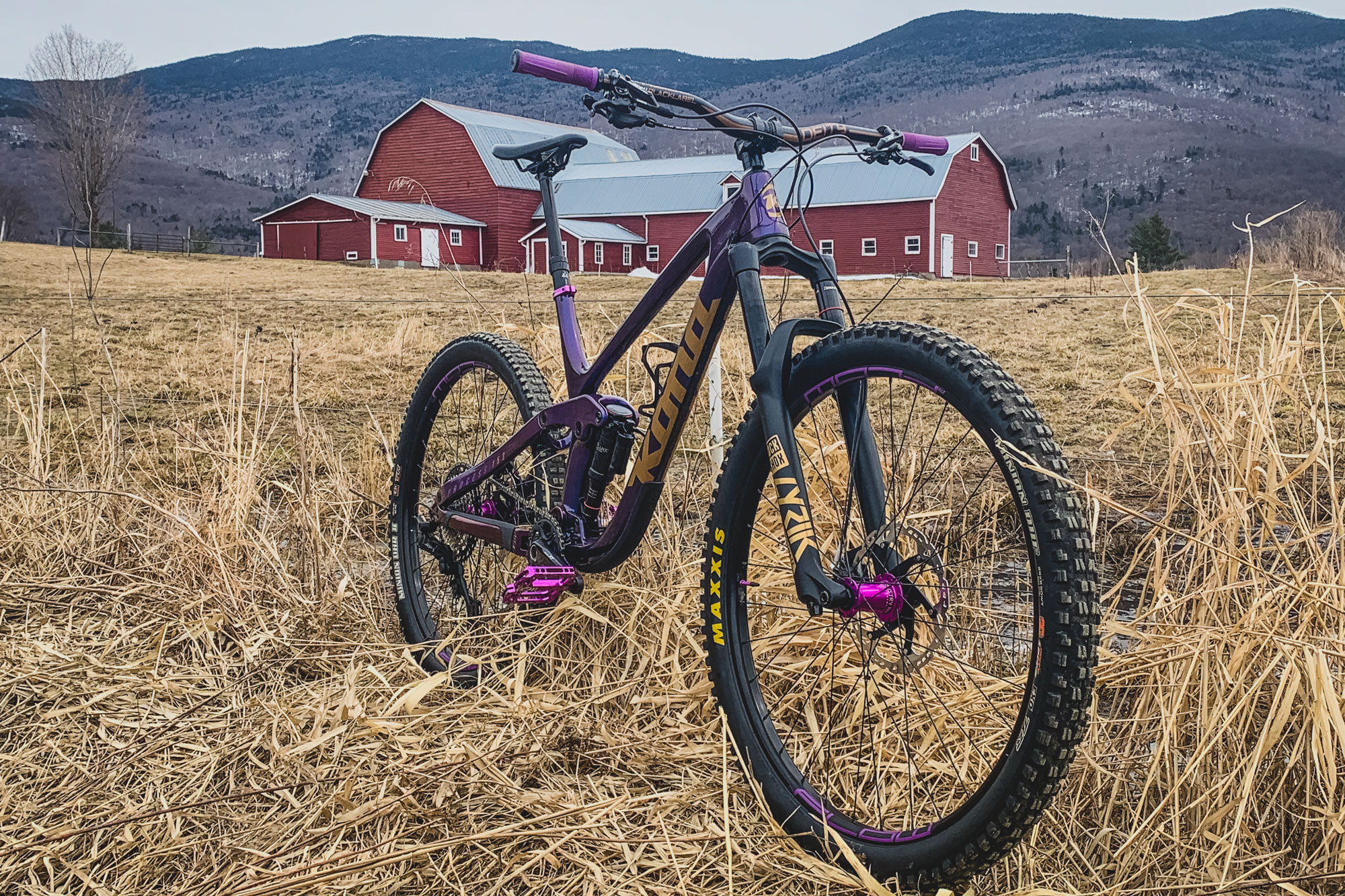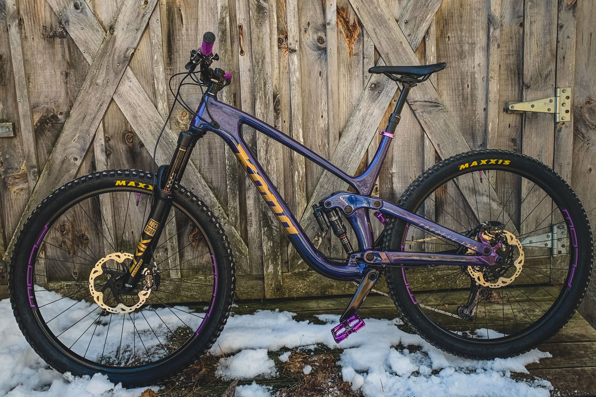 The hoops are Industry Nine Hydra hubs laced to Stan’s Flow MK3’s with custom purple decals.