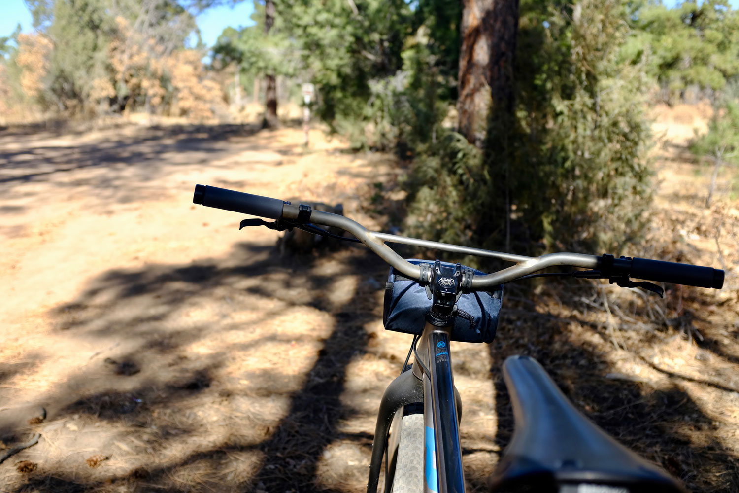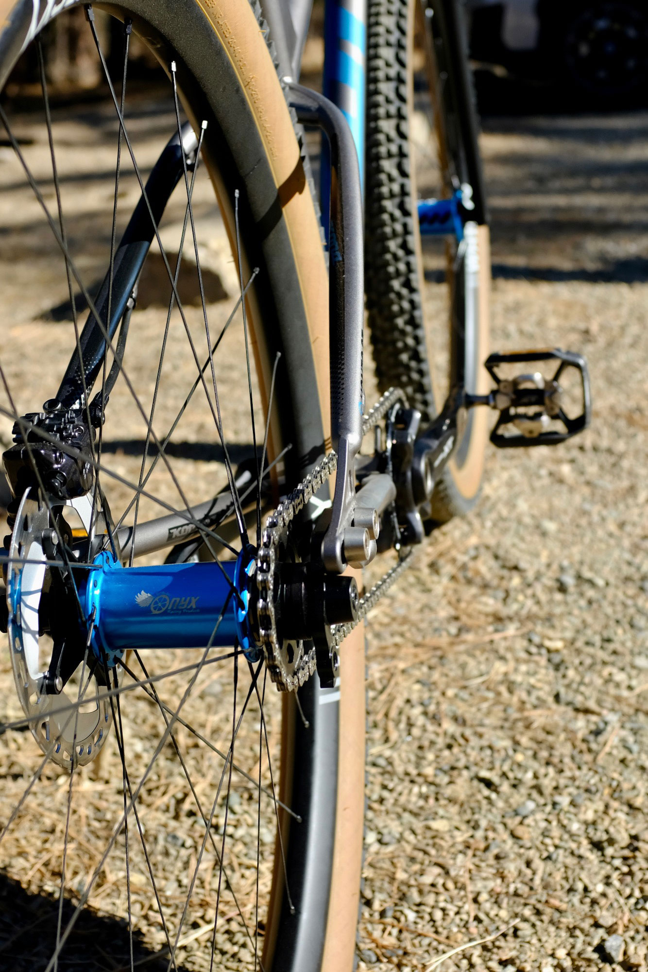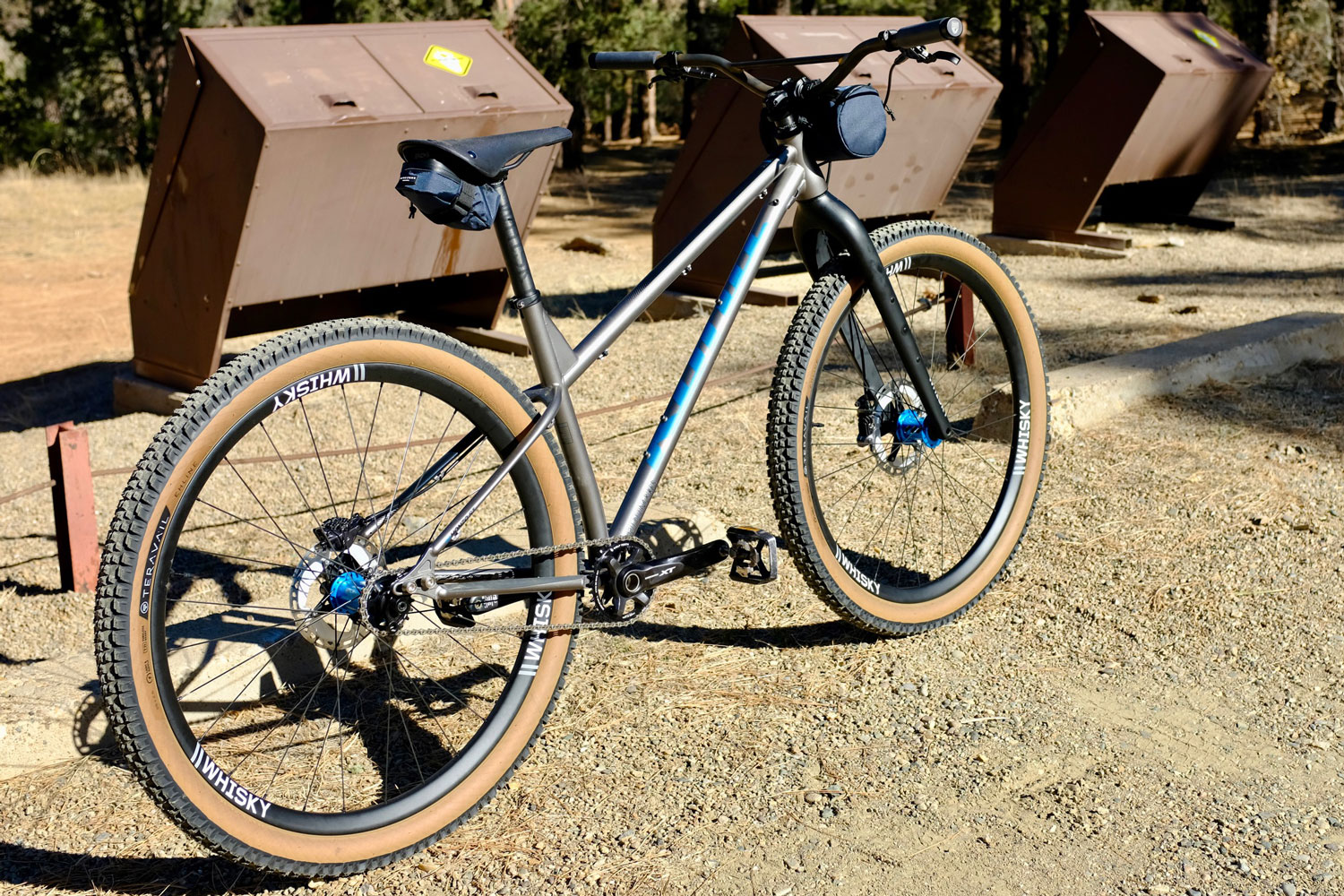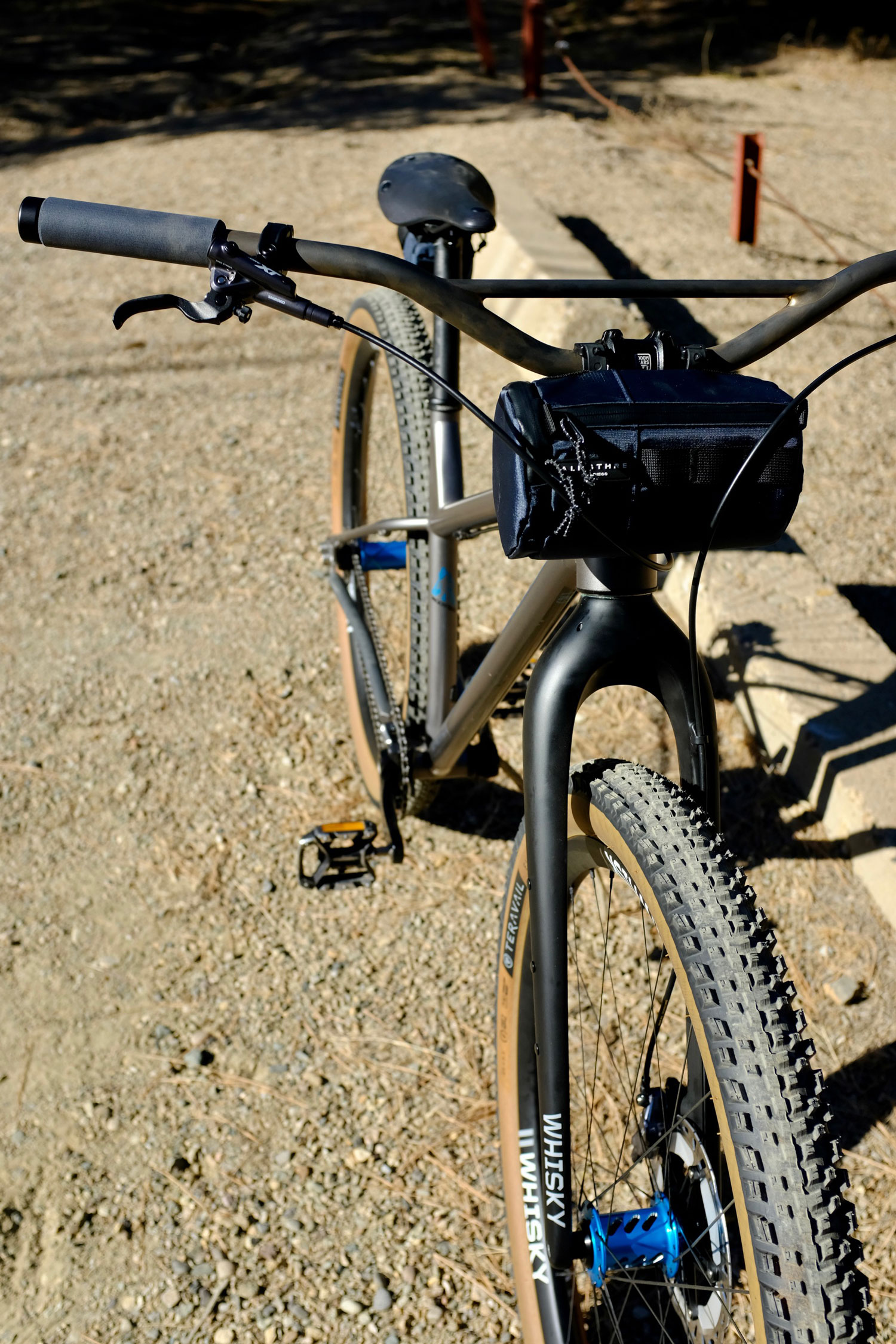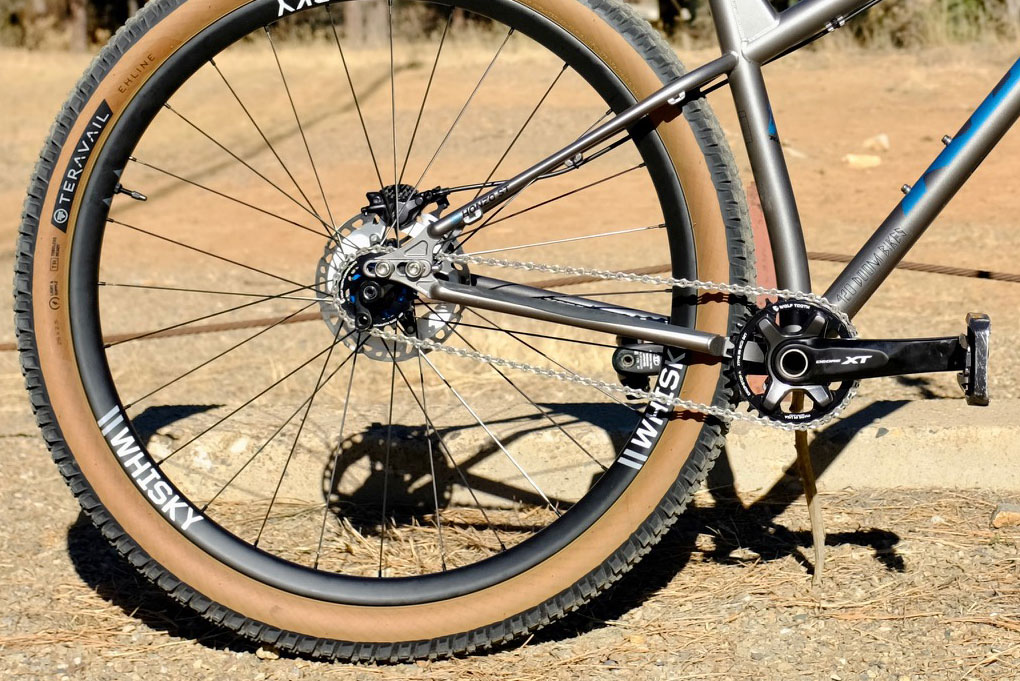 Acceleration and deceleration are handled by Shimano XT cranks, pedals and brakes with the big 4 pistons out front. A KMC chain links the Wolf Tooth chainring and cog. The bike is rolling on 2.5″ Teravail Ehline tires wrapped around Onyx Racing single-speed Helix hubs laced to Whisky #9 36w hoops with 28 Sapim CX-Rays per wheel.