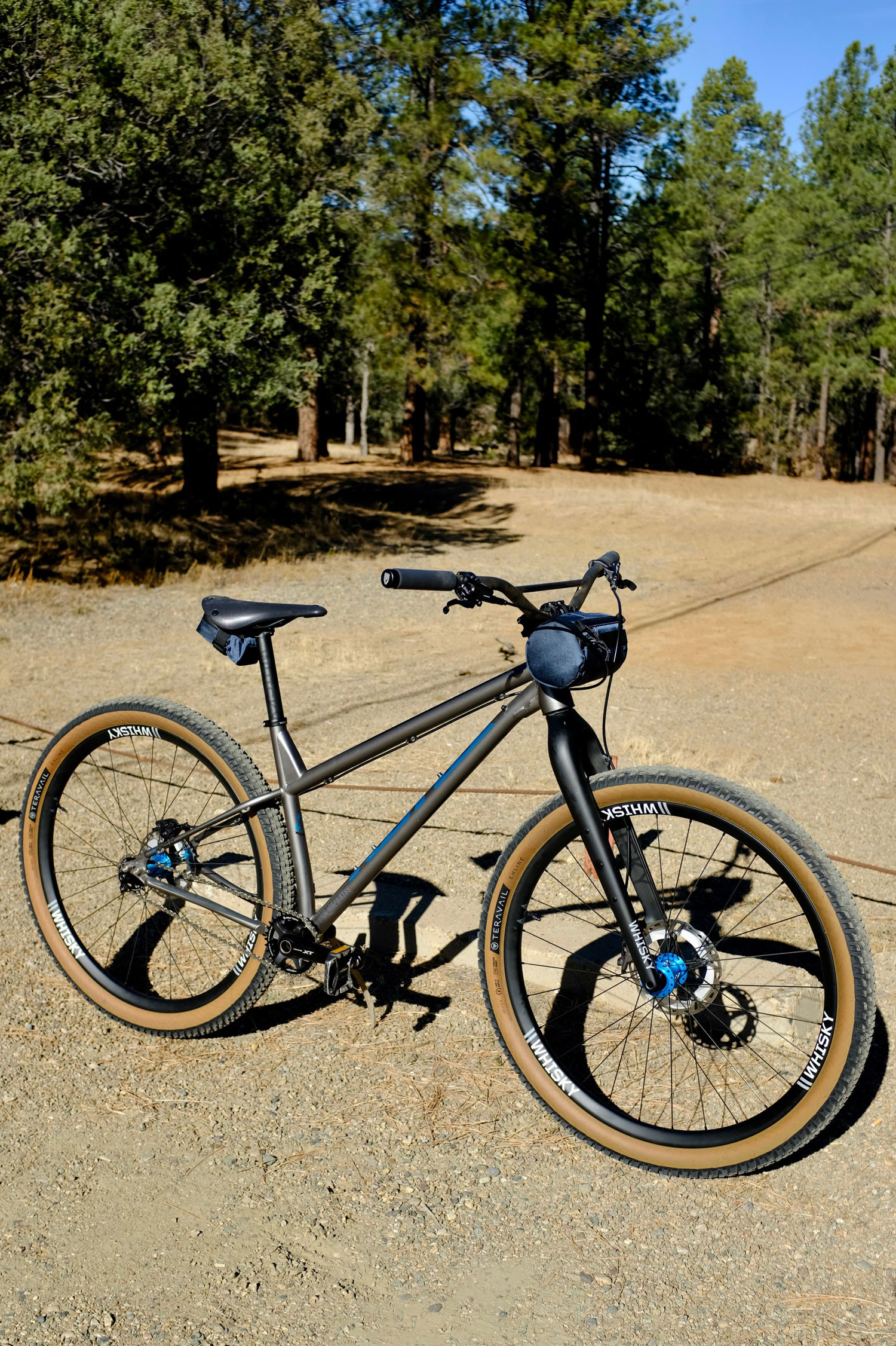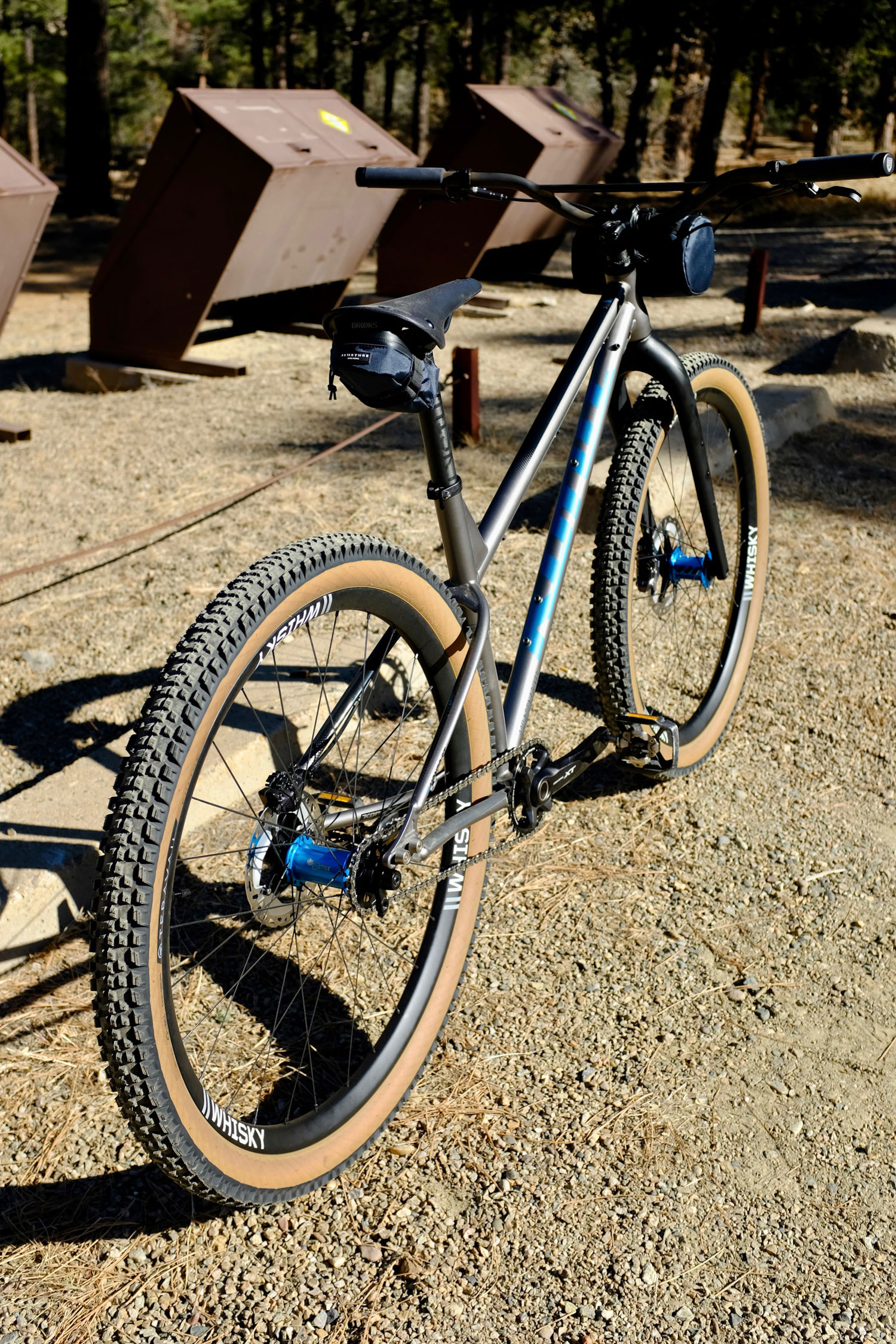A Whisky seatpost holds the Brooks Cambium C15 in place while the navy blue saddle and handlebar bags from Almsthre round out the build.