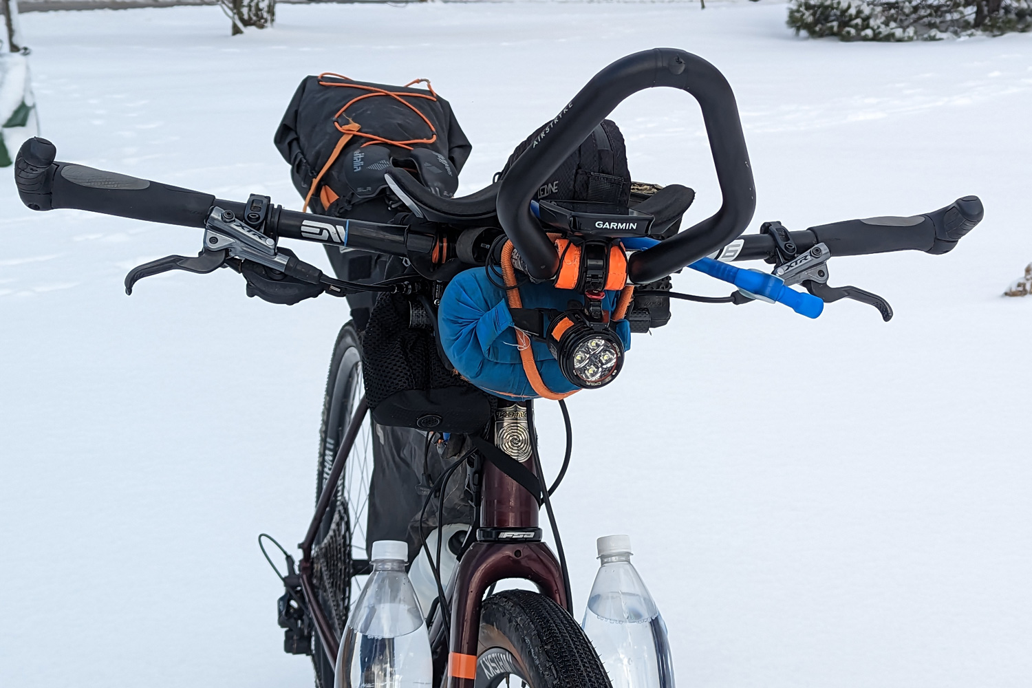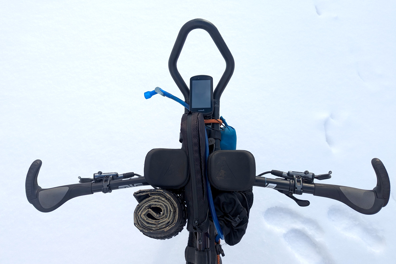 My cockpit was converted from the drop bars to a 760mm Envy flat bar with Ergon GP3. This allows more control on the descents. XTR component’s brake and shifter levers work seamlessly with the stock GRX hydraulic brakes. My Profile Design aero bars allow various hand positions and bag configurations.