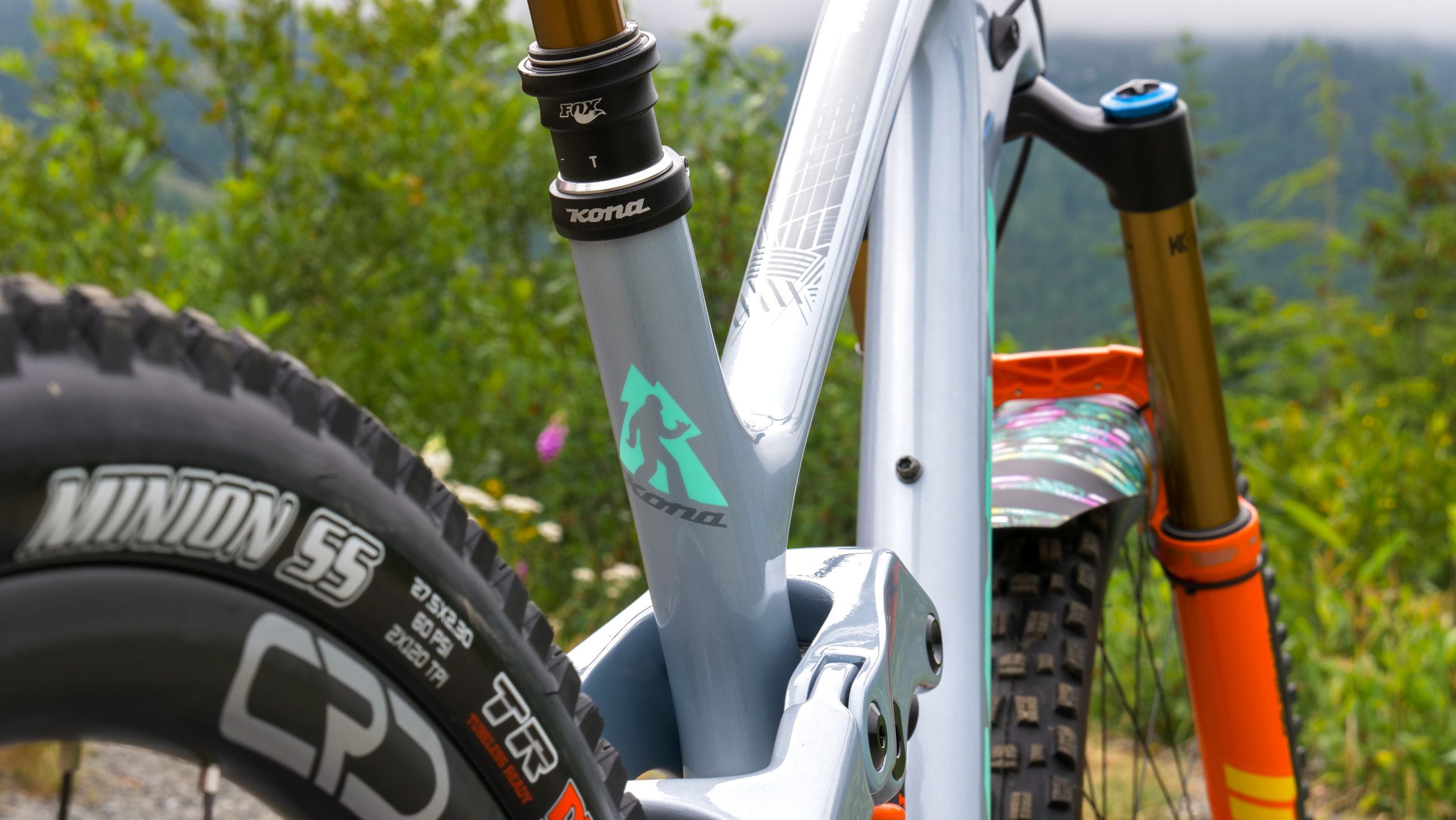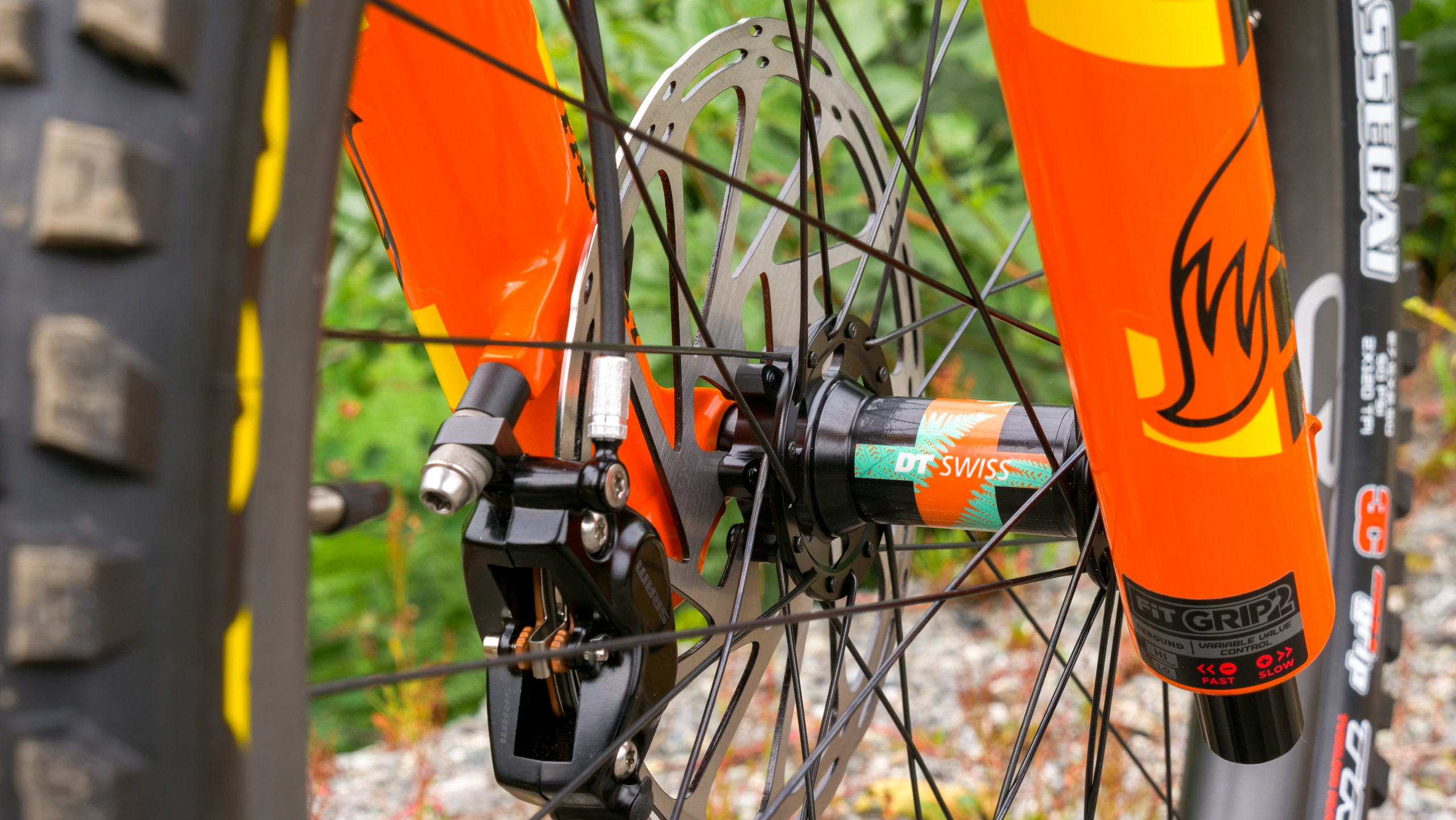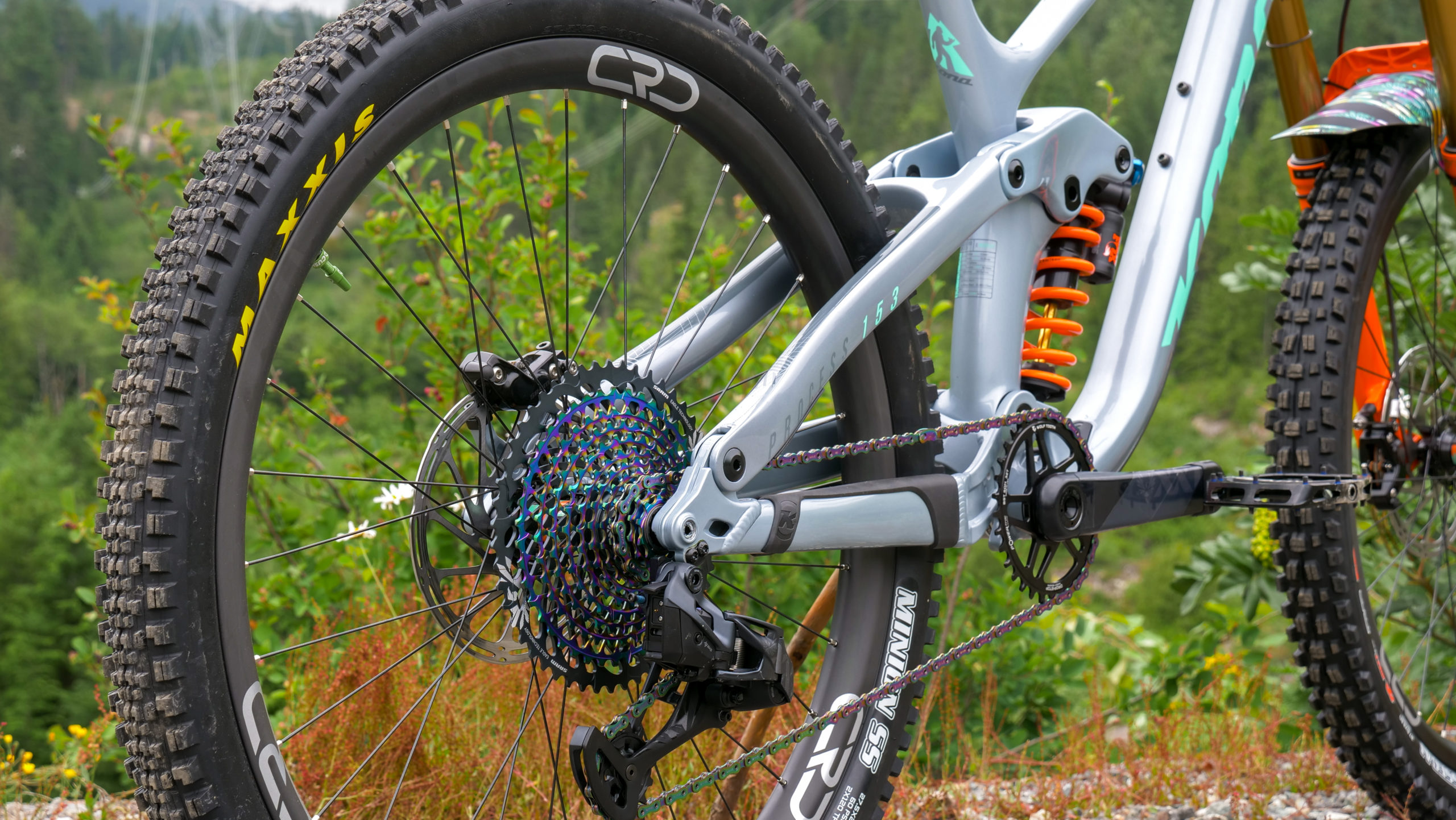 Russ (Lost Co head mechanic) built up Mike a set of burly yet light carbon wheels composed of CRD (Cascade Racing Designs) rims, laced to DT Swiss 240 hubs with Wheelsmith 1.7 double-butted spokes. That rim/spoke/hub combo created a ride that is just the right amount of stiffness and snappy-ness. You’ll also notice Mike slapped some custom hubs decals on to match the rest of the bike with teal ferns and orange logos. Bling Bling!! Wrapped around those carbon hoops are a pair of Maxxis Double Down tires, with the Assegai up front in MaxxGrip rubber and out back there’s a Minion SS semi-slick tire with Dual Compound rubber to keep these rolling fast. The rear tire is stuffed with a CushCore for a little added rim protection in the rocky Canadian trails and provides extra grip since less air pressure needs to be run.