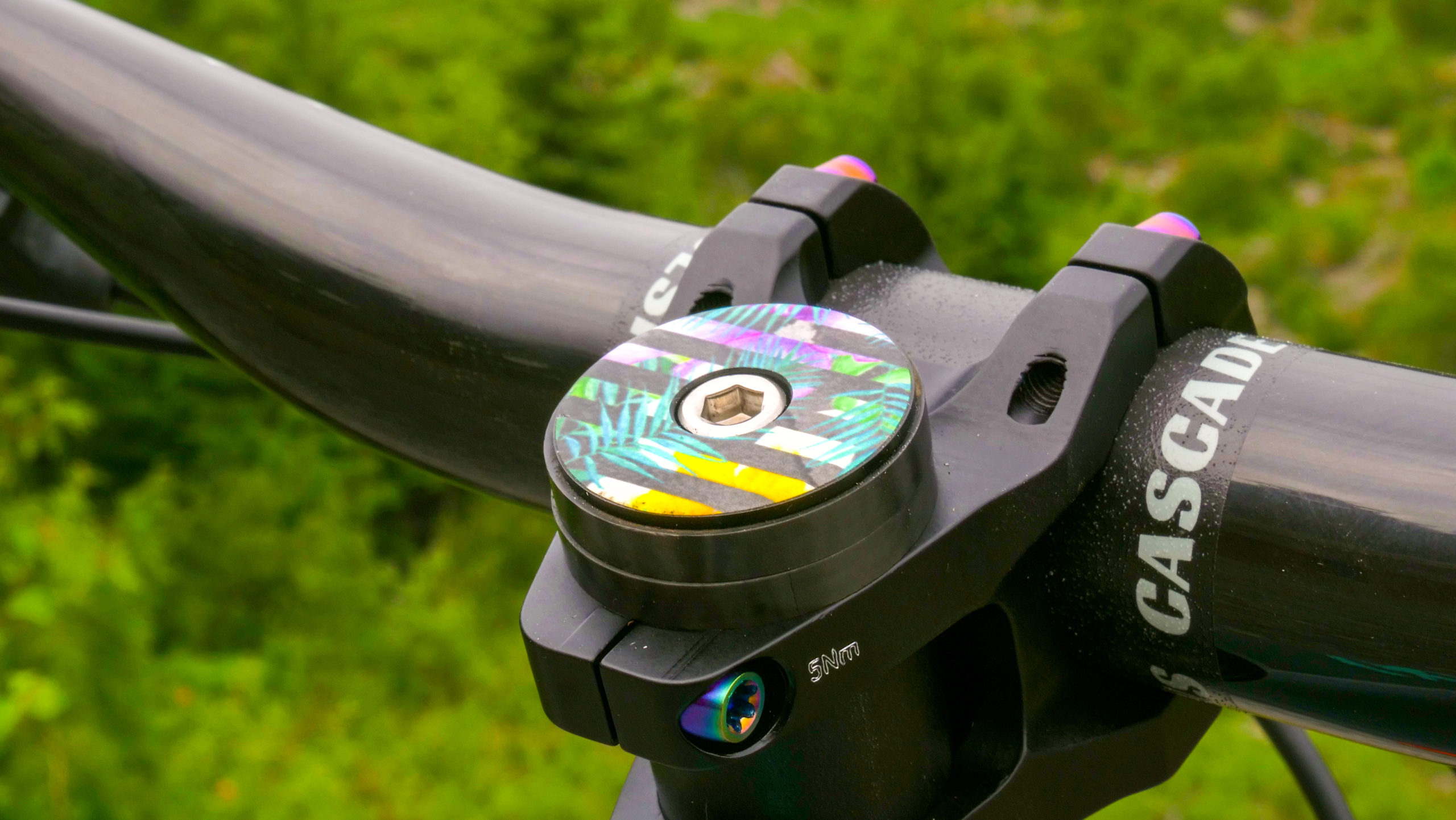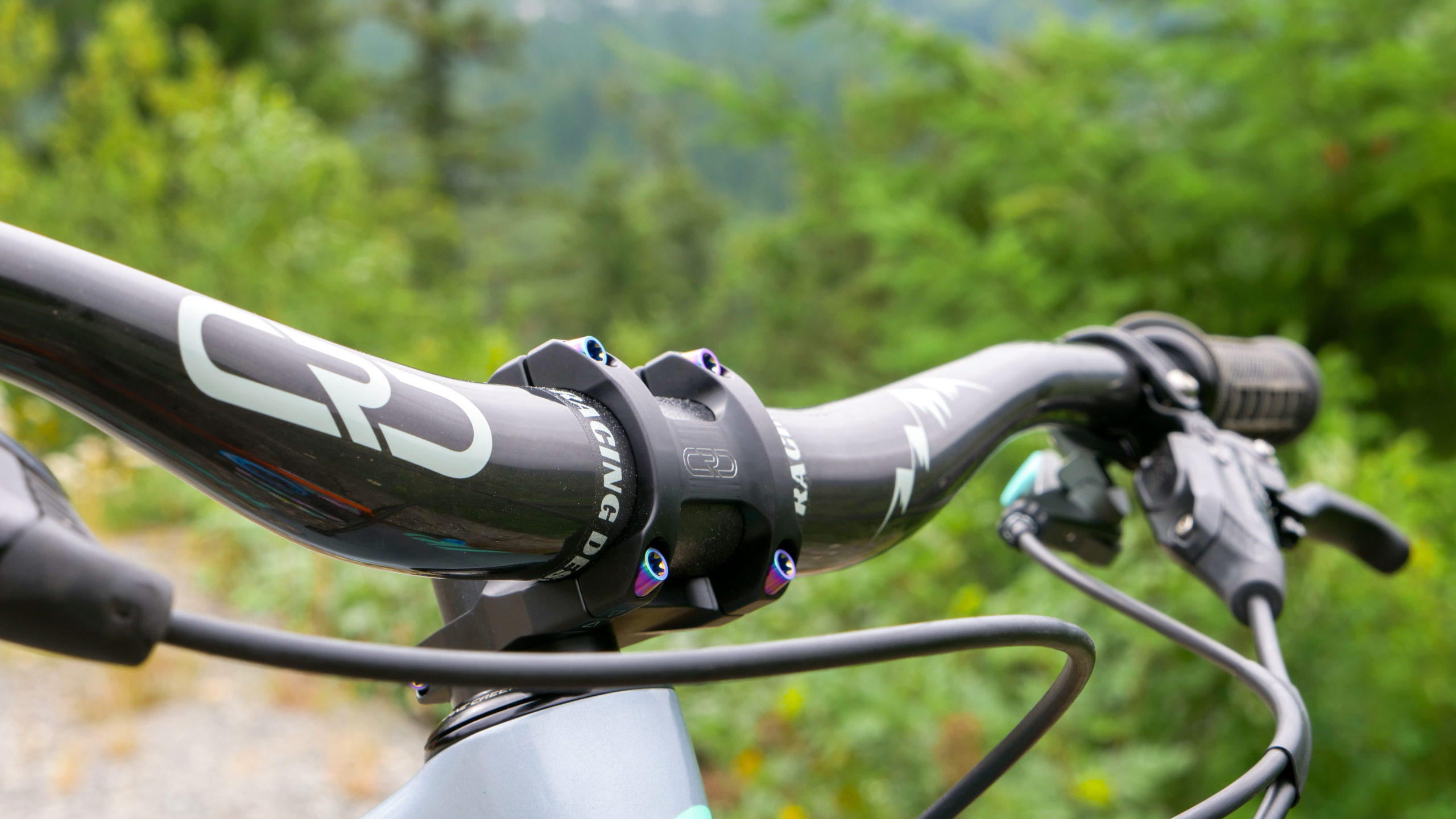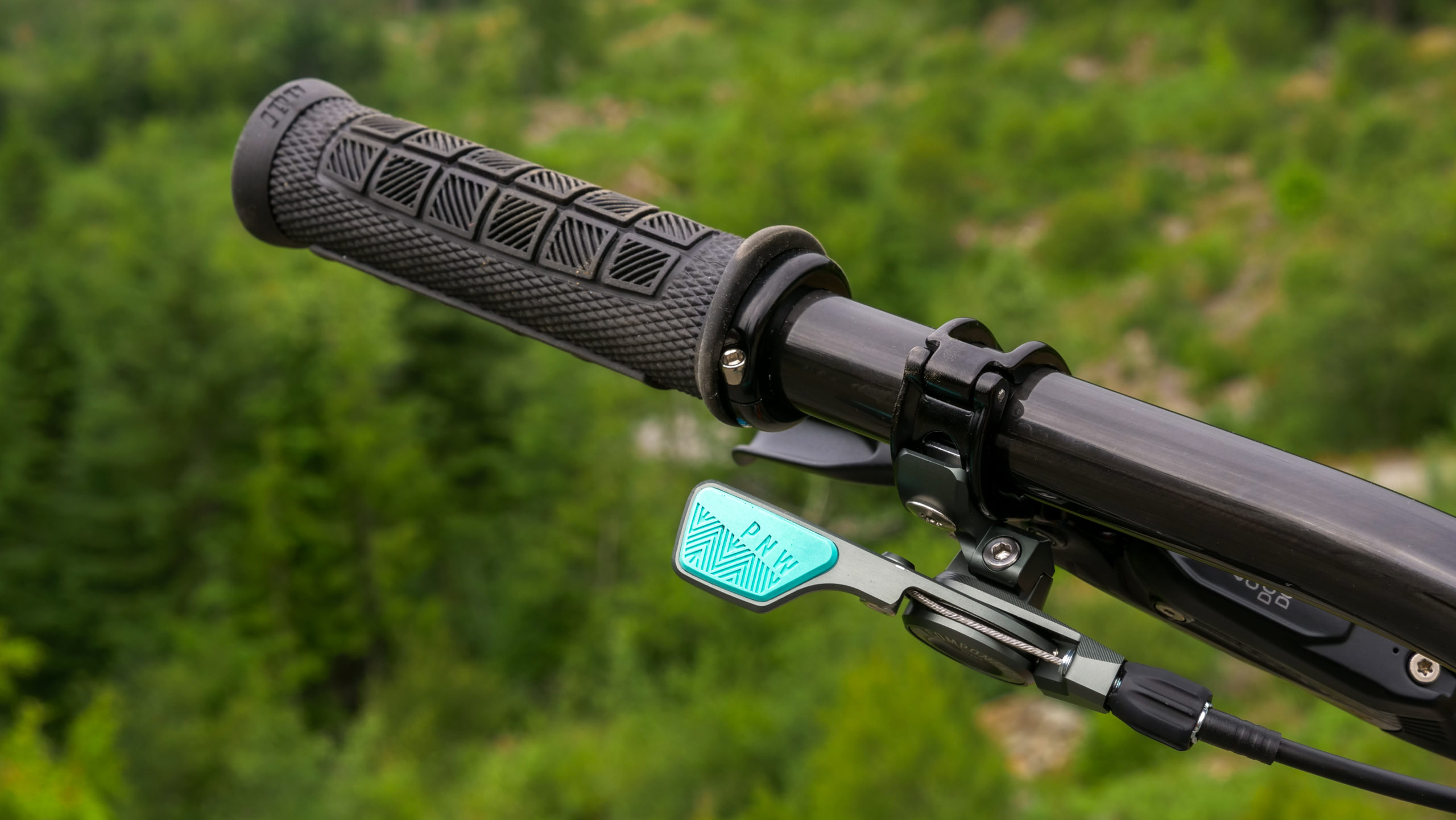 To slow things down, Mike opted for his favorite brakes; the SRAM Code RSC. The rotors are SRAM Centerline with a 200mm disc up front and 180mm in the rear. These brakes seriously stop the bike on a dime which is needed when riding super fast trails in the Whistler Bike Park. Brake levers are attached to a set of CRD Stooge bars, which are carbon and cut down to 780mm and held on by a 35mm long CRD Vagrant stem with rainbow titanium bolts. Mike’s hands hold onto a set of ODI Elite Pro grips in black, and the dropper post is actuated using a PNW Components Loam Lever. The dropper post itself is the Fox Factory Transfer Post. Mike was able to just barely squeeze a 175mm dropper post into his Medium Process, which sits exactly at the right height for pedaling. No joke, it’s scary how perfect it turned out to be!