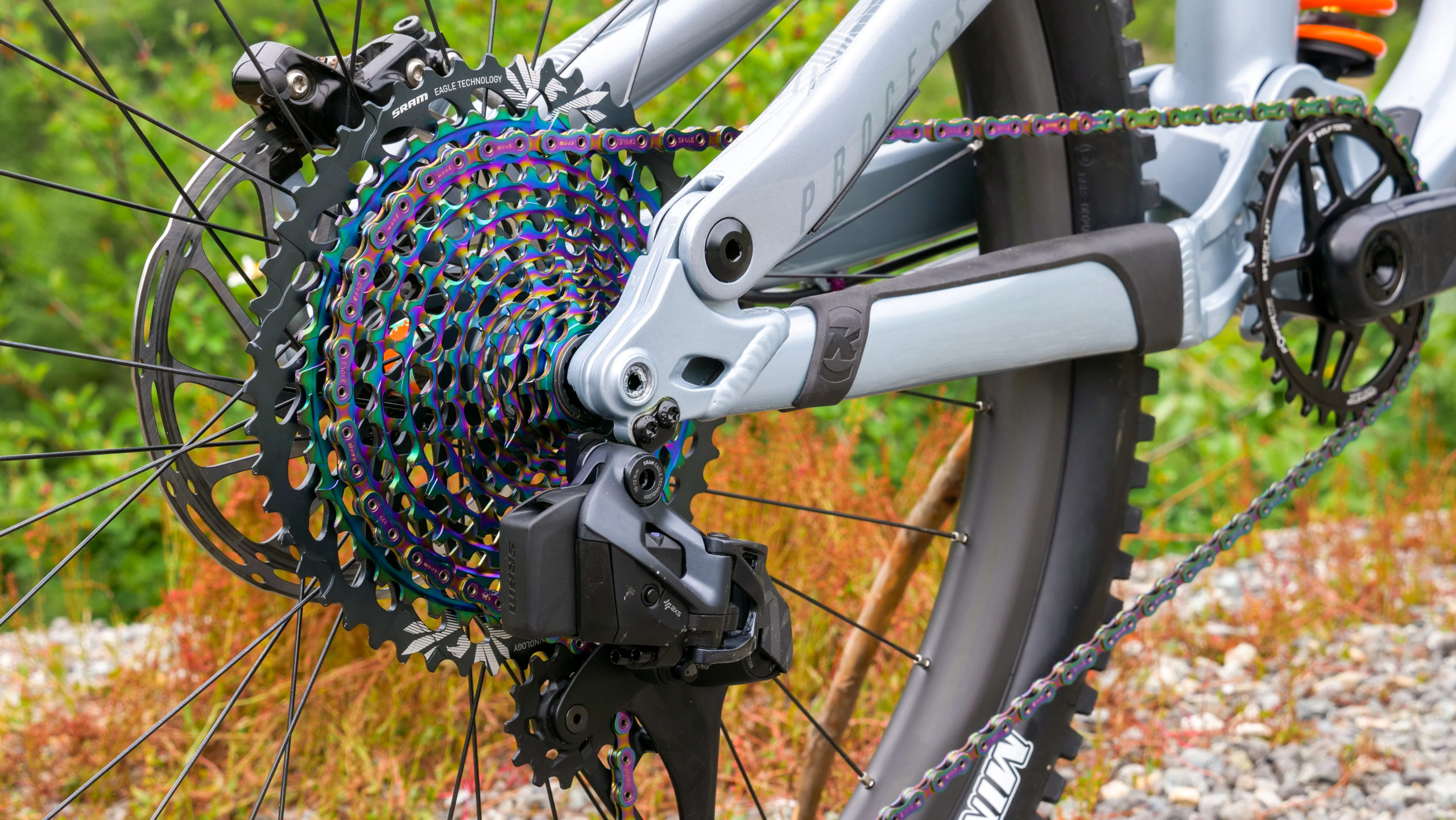 Last but not least, Mike hired some little robots to help shift his gears. He chose to run the SRAM XX1 Eagle AXS groupset and is lovin’ it! That 12-speed drivetrain is not only electronic, but it’s also wireless and shifts extremely crisp. Wireless shifting also means the cockpit is nice and clean, and this bike just straight up looks tidy and simple. The crank is a carbon SRAM XX1 AXS Eagle as well with 170mm crank arms which is attached to a Wolf Tooth Elliptical 32t chainring. Mike freaking loves oval chainrings and won’t build a bike without one. To finish off the overall color scheme of the bike, Mike runs a Ground Keeper fender and topcap, both in the matching Staycation design. This keeps mud out of his eyeballs and makes the bike look just a little more baller.