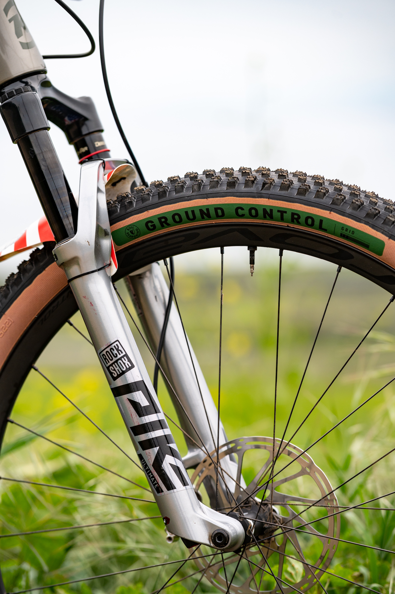 Starting up front, Nate equipped a RockShox Pike Ultimate with a Roval Control Carbon wheel underneath that 120mm of fork travel. The Roval wheelset is wrapped with pair of matching tan- wall, Specialized Ground Control tires (29×2.35).