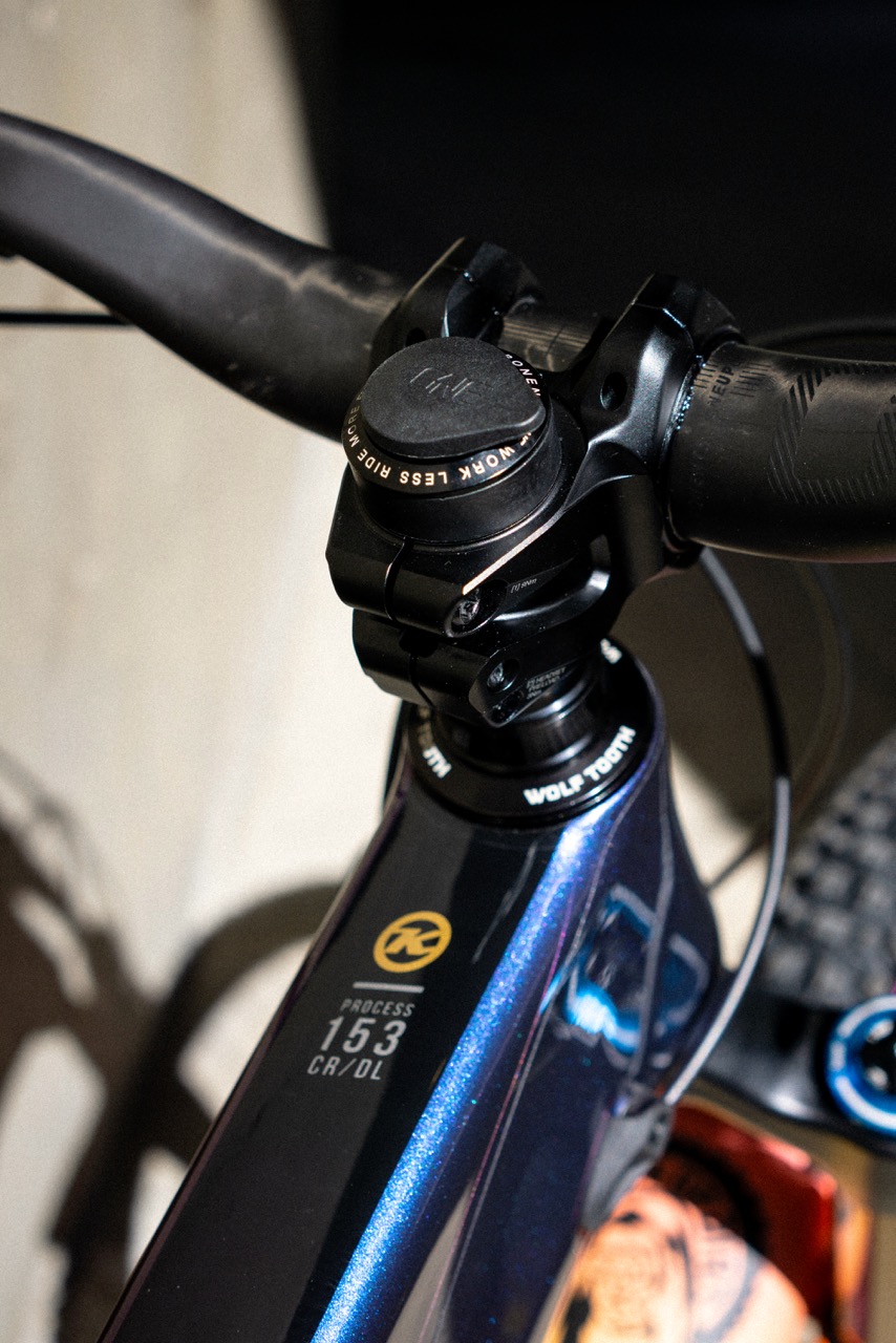 OneUp’s EDC stem houses an EDC tool system and clamps one of OneUp’s compliant 25mm rise carbon bars in place. A Wolf Tooth headset and ESI silicone grips round out the cockpit.