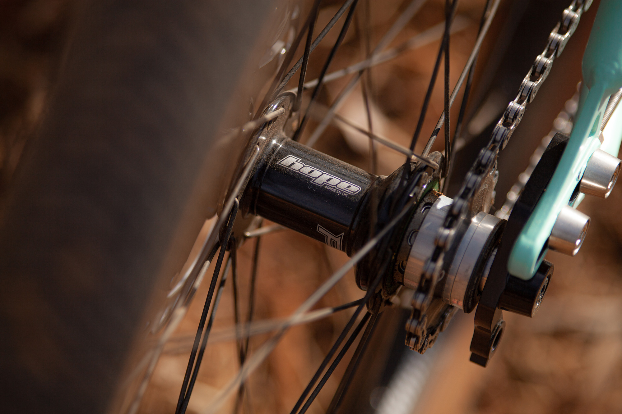 Out back you’ll find an 18t Endless Biking Kick Ass Cog… Mounted to a Hop Pro 4 rear hub slammed forward in the bike’s sliding horizontal dropouts.