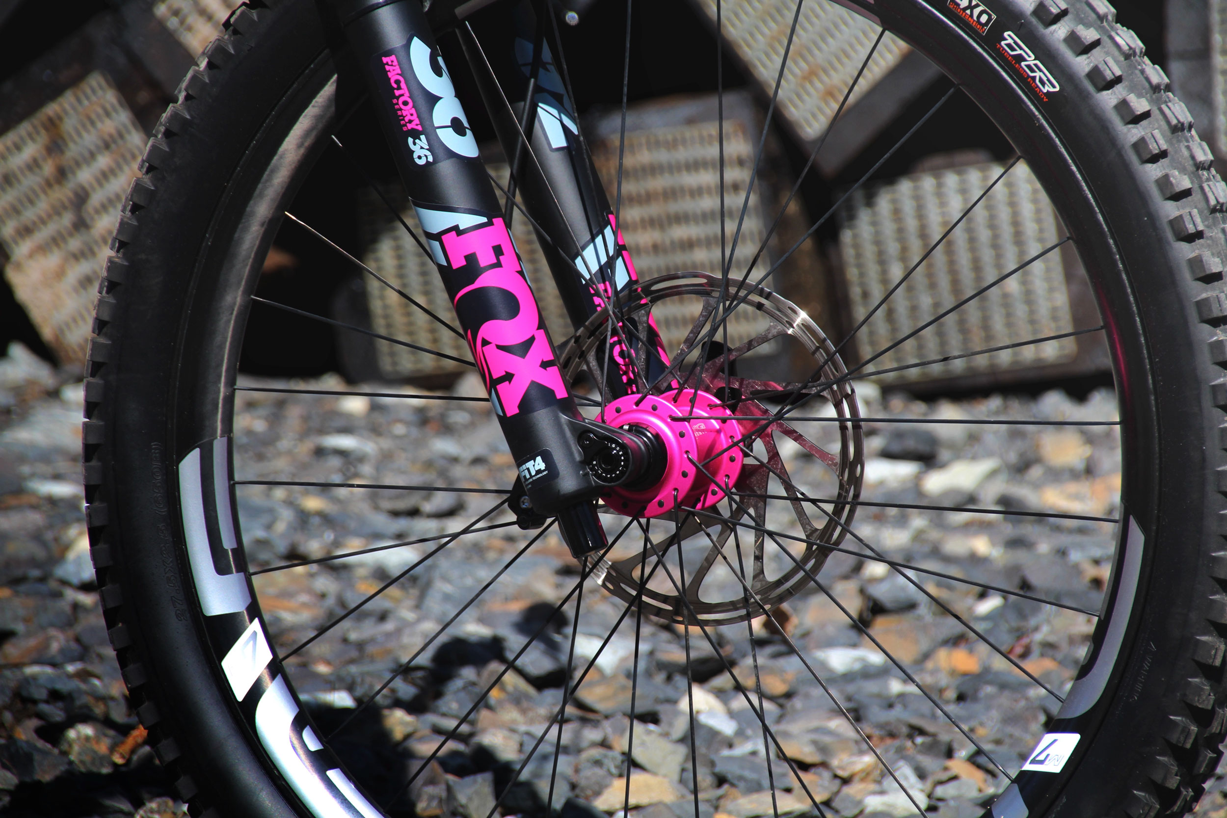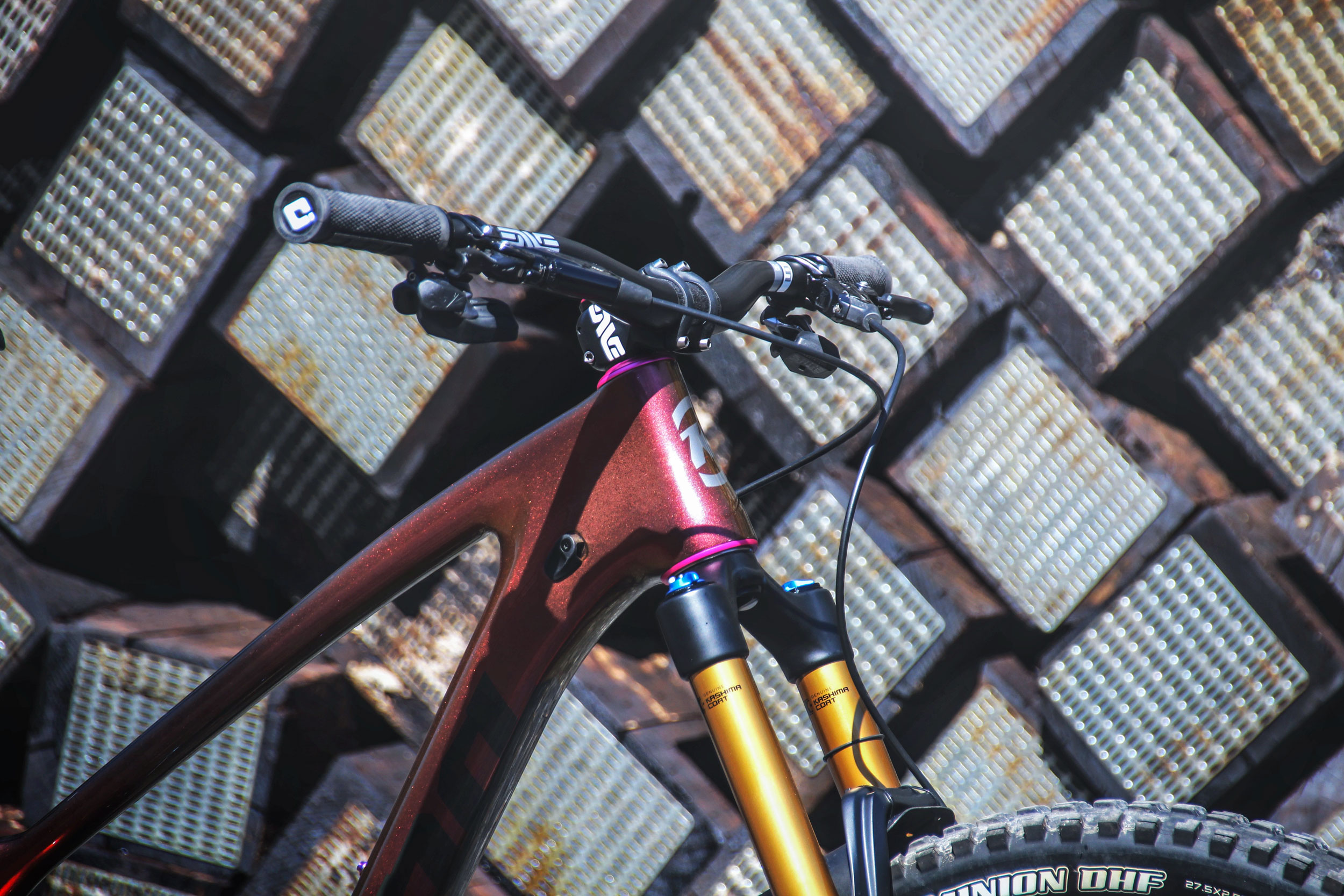 I mean look at the drivetrain, SRAM carbon XO Cranks, an XO1 AXS rear derailleur and matching XO cassette and XX1 oil slick chain. And how do you top a set of Enve M730 wheels laced to Chris King tropical-punch hubs, You don’t! Even the Fox Float X2 features custom hot pink decals to match the King hubs.