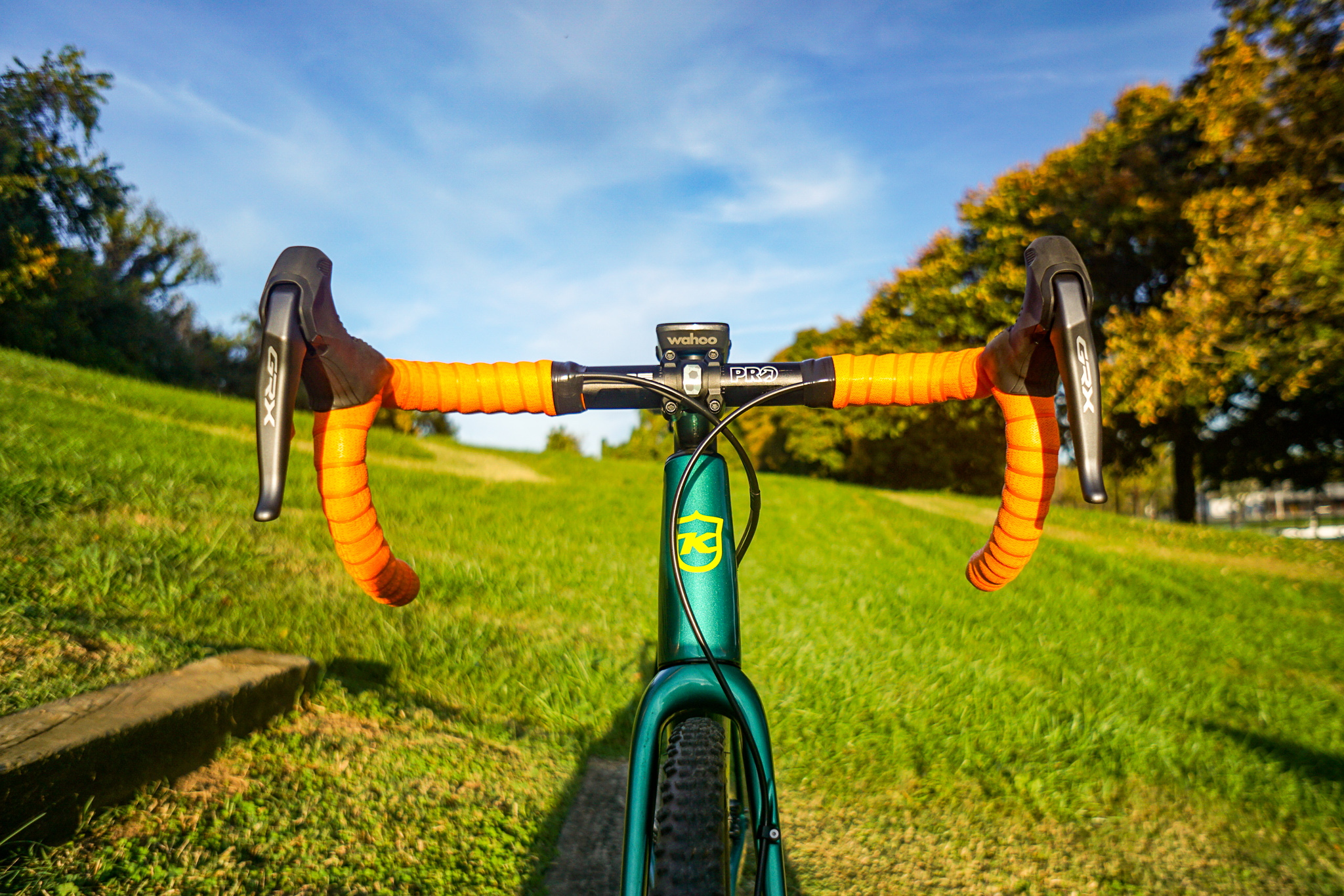 Bright orange Lizard Skin DSP bar tape keeps Kerry in control, while the ergonomically designed GRX levers ensure easy shifting and braking.