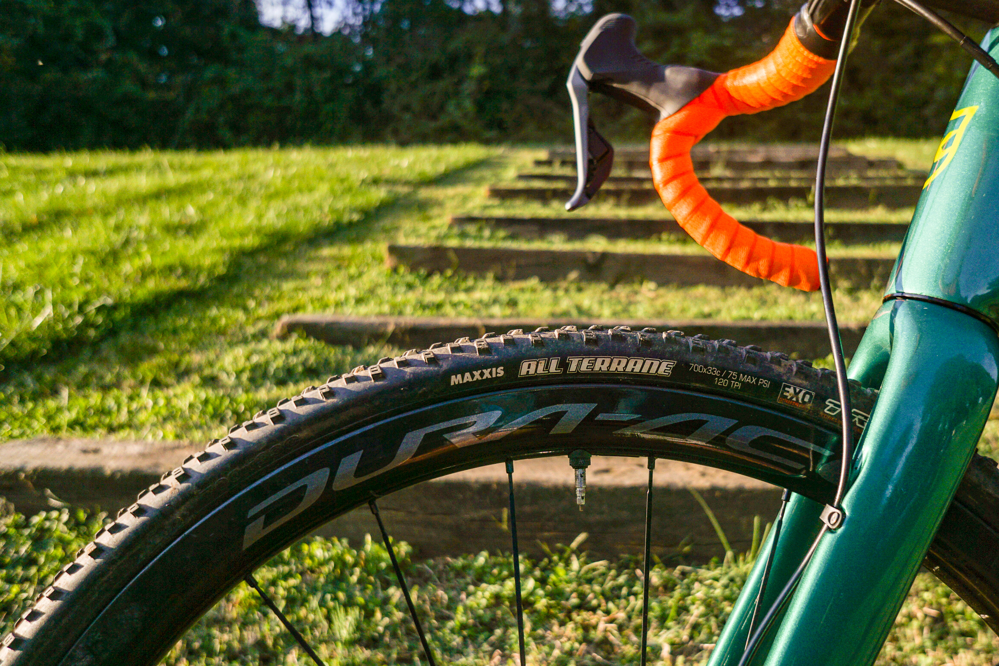 Tire choice out on the east coast for Kerry right now is a matching pair of 33c Maxxis All Terrane’s.