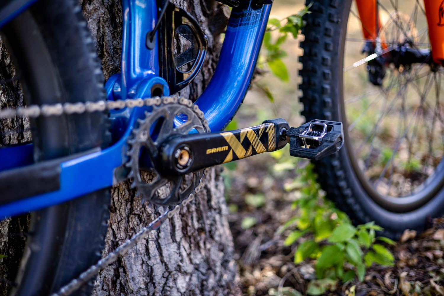 The bike is fitted with SRAM GX Eagle drive train with stiff XX1 carbon cranks matched with Crankborthers Candy 1 Pedals.