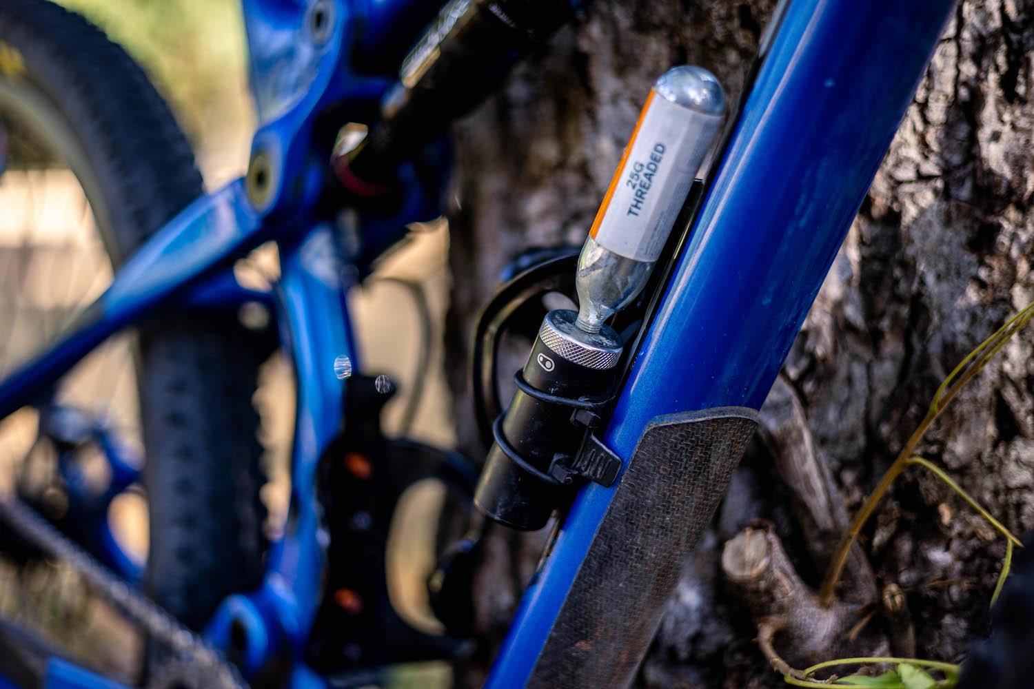 Crankbrothers Cigar Tool Plug Kit and CO2 Head fitted to downtube for quick access to fix flats.