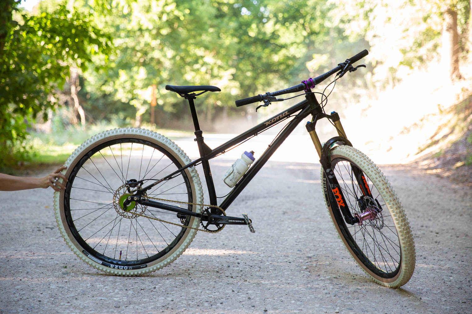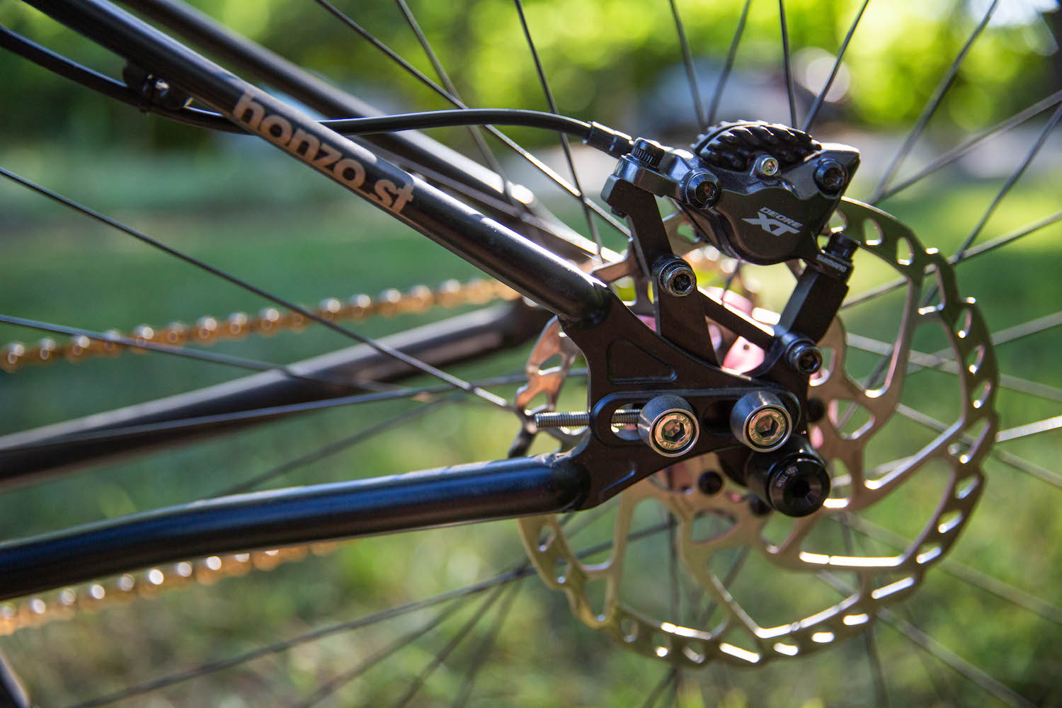 Tennessee Valley Bikes mechanic Sasha Reed built up this machine of a Honzo ST. She opted for a single speed setup that would be an intimidating task for many, but not Sasha. She spent 54 days last year biking accross the country, so a little extra resistance on the uphil is a piece of cake. Lets check out this dreamy piece of art…