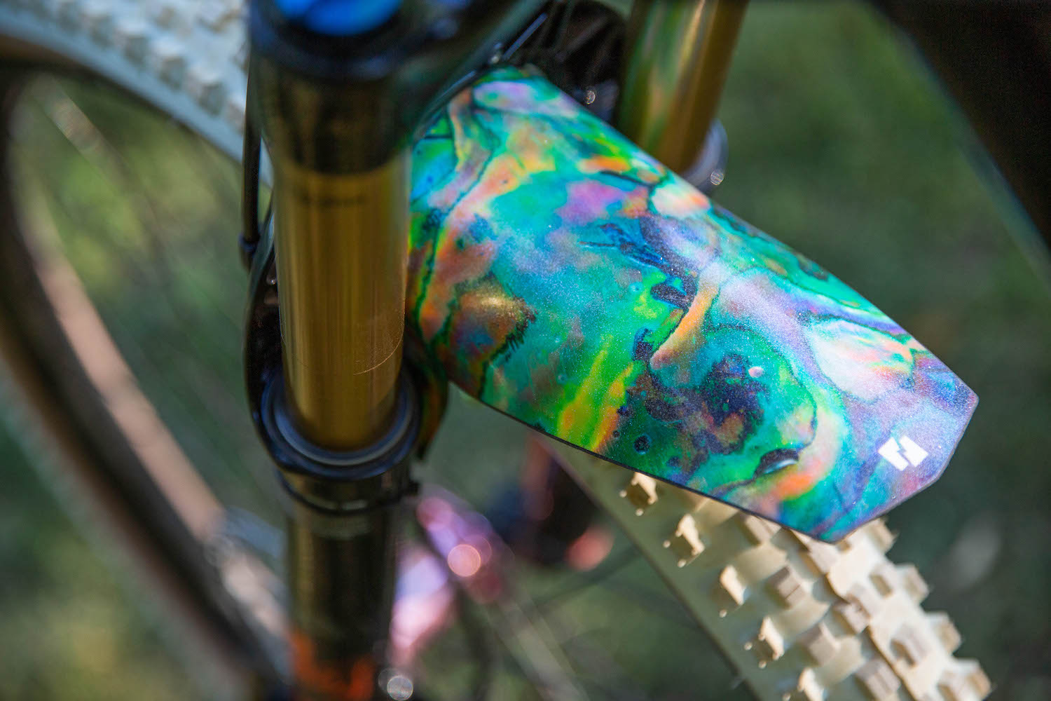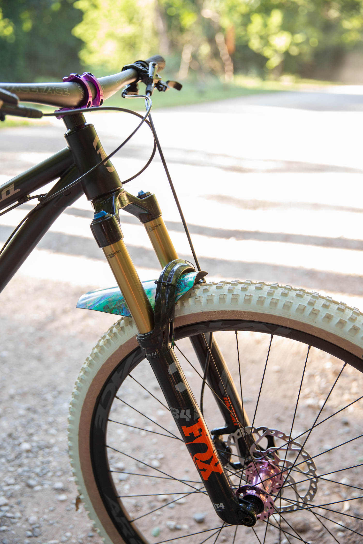 She’s running a Fox 34 factory 140mm fork and you’ll find a pair of Race Face Arc Heavy Duty 32h wheels on the end of it.