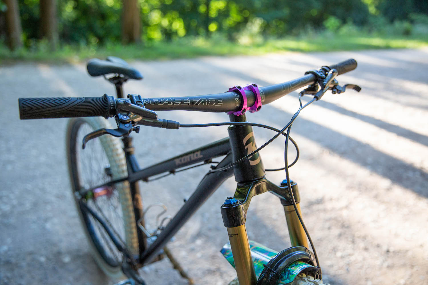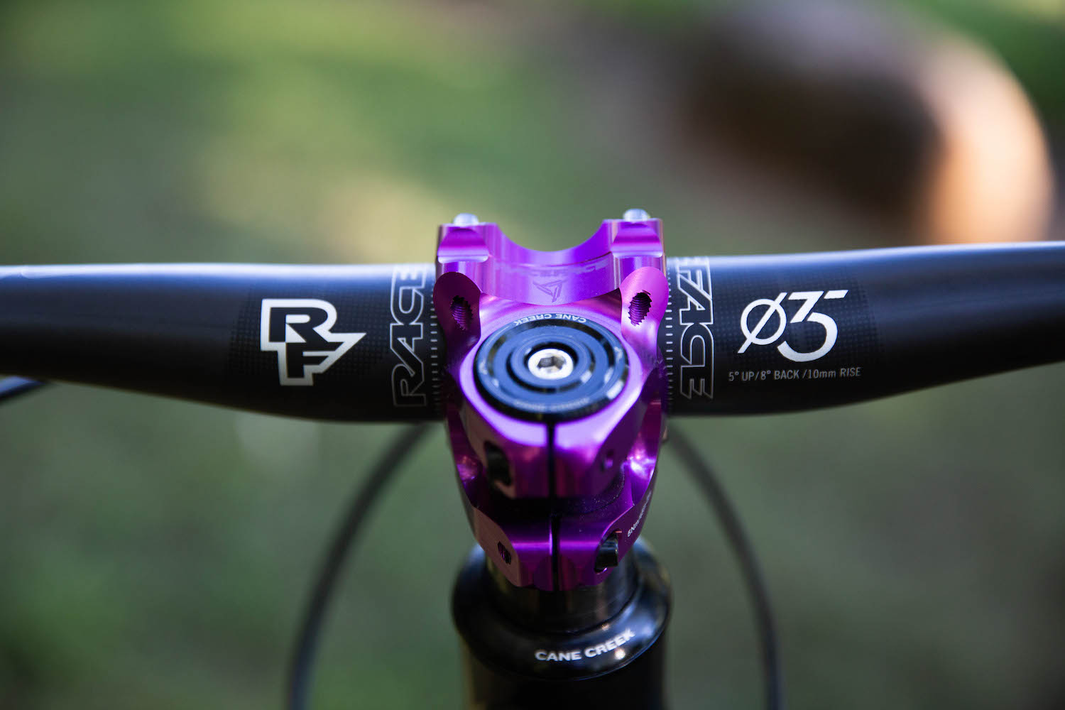 Sasha is running a Race Face Next SL handlebar, Cane Creek Hellbender headset, and a Race Face Turbine stem in purple.