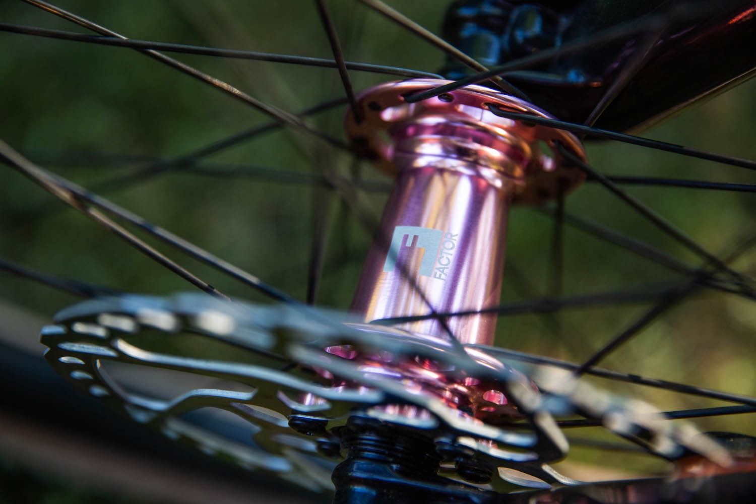 Sasha built up the wheelset herself using Factor hubs in pepto pink for a bit of bling!