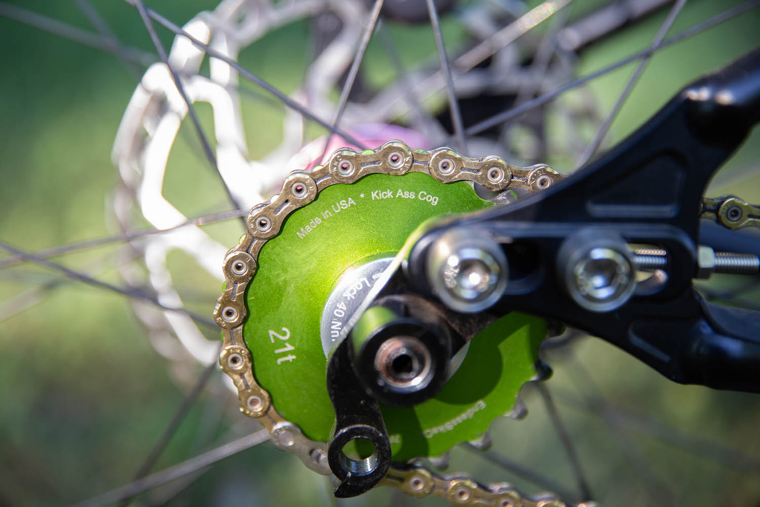 She’s running a Race Face Aeffect 32t chainring paired with a dreamy 21t kickass cog with fibonacci spacer kilt booth in lime green.