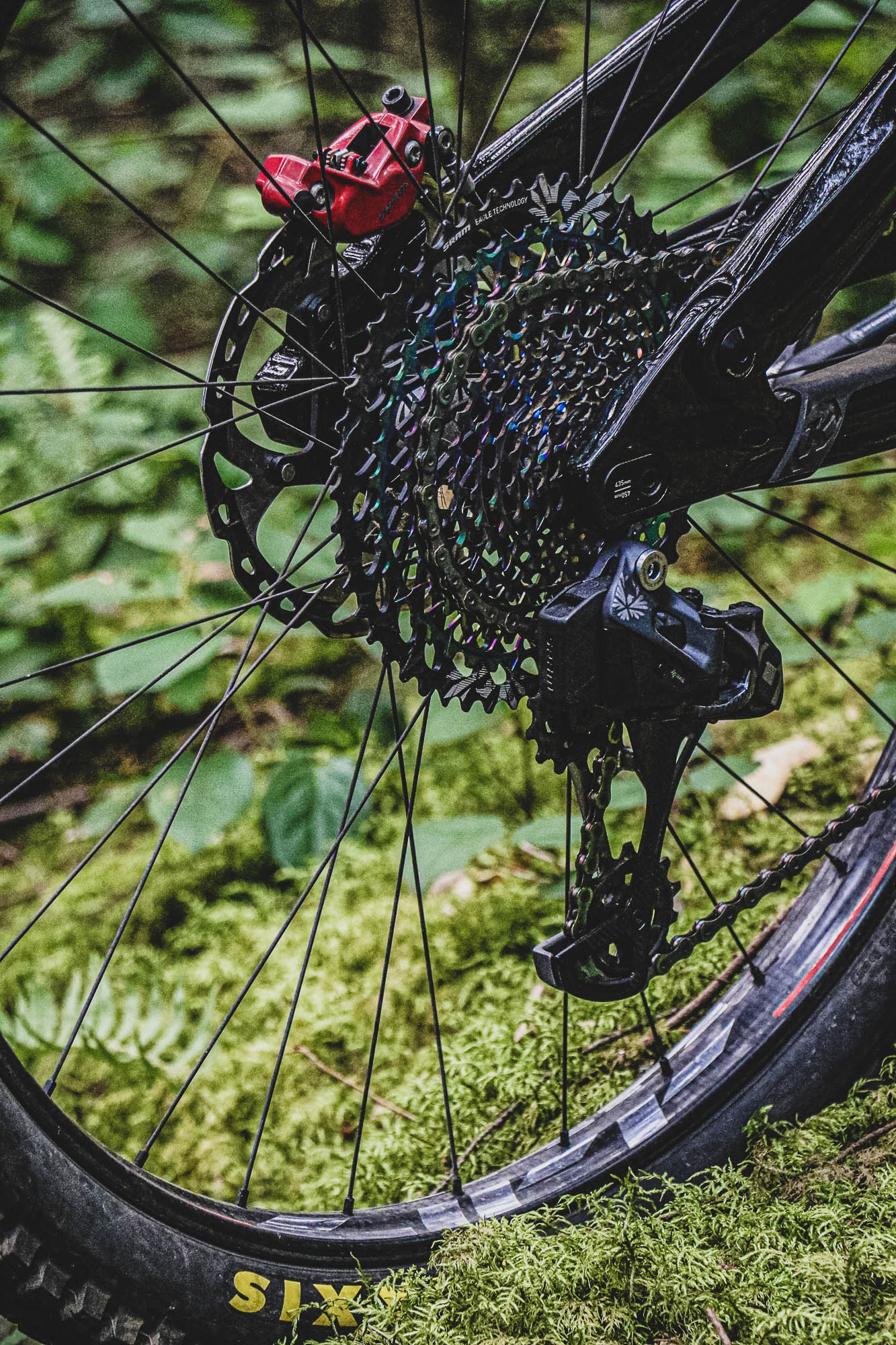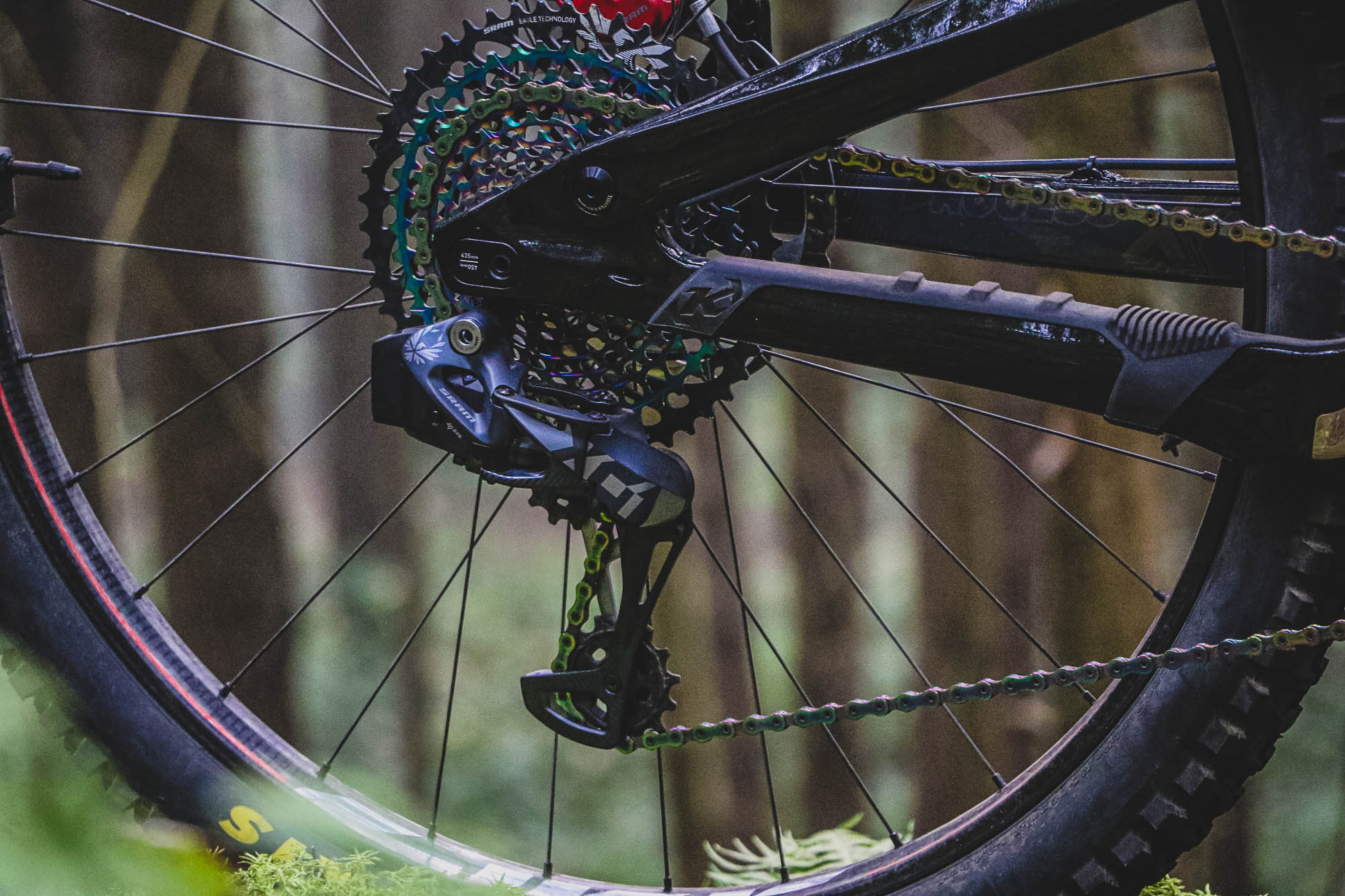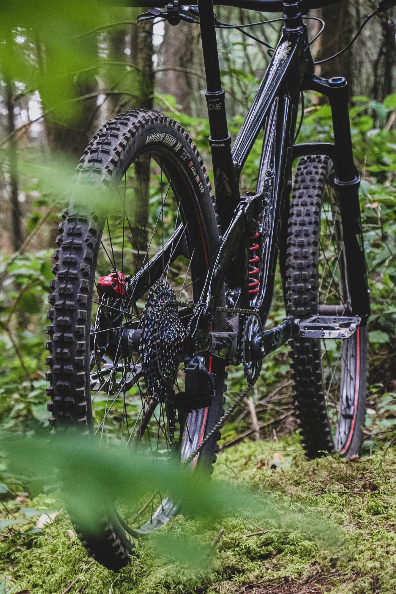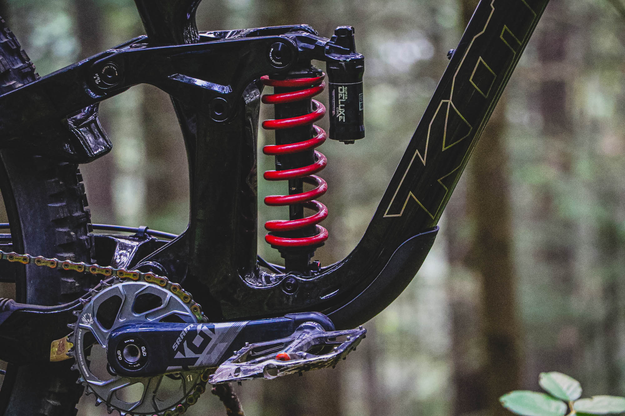 Scott loves a coil and opted for RockShox Deluxe Ultimate Coil with a 450lbs spring. Drive train wise, up front he’s sporting a set of SRAM X01 cranks with a X01 Oil Slick Rainbow chain. Our Wah Wah II pedals round things out.