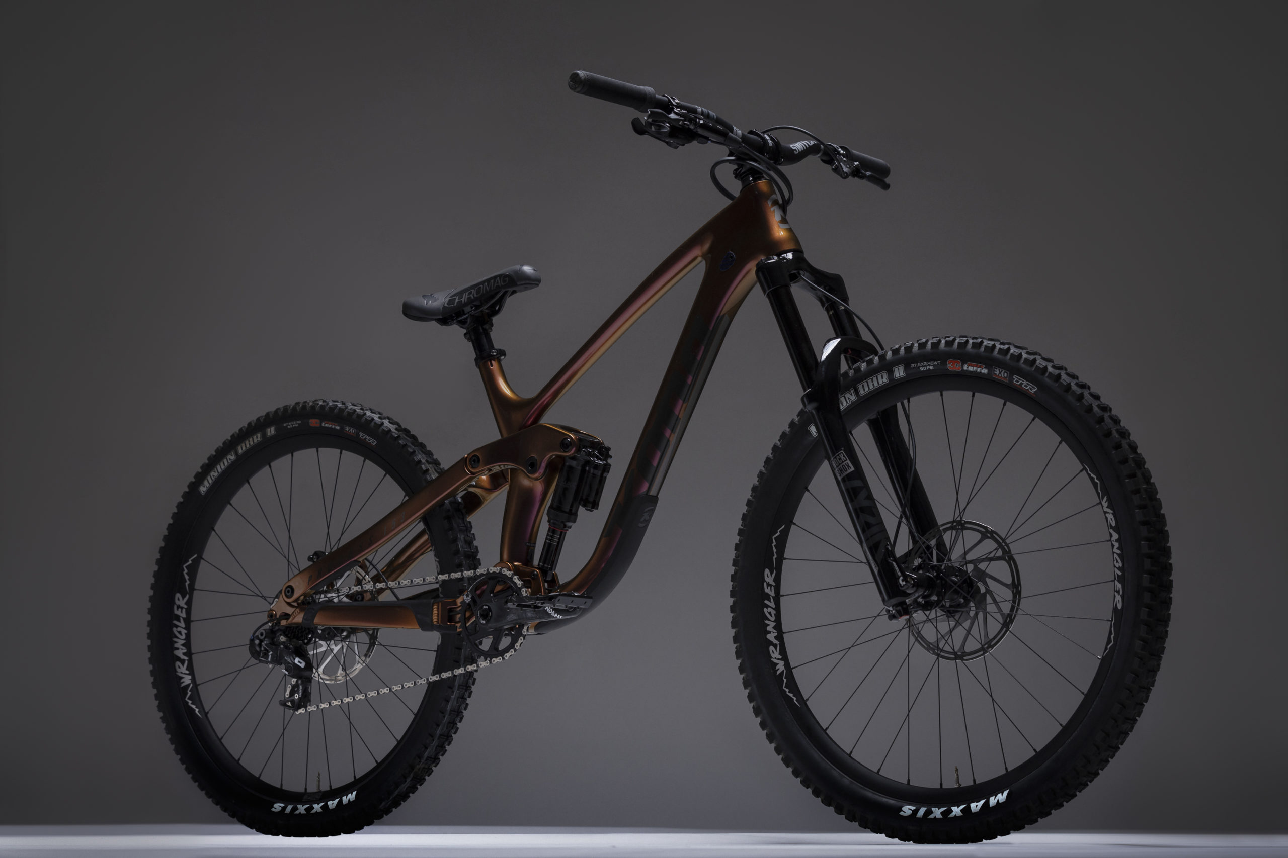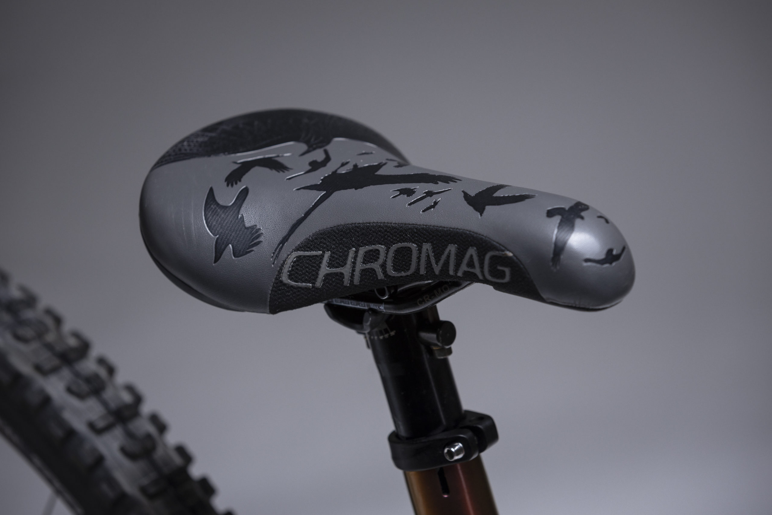 A classic Chromag Overture saddle sits atop a Switch seatpost.