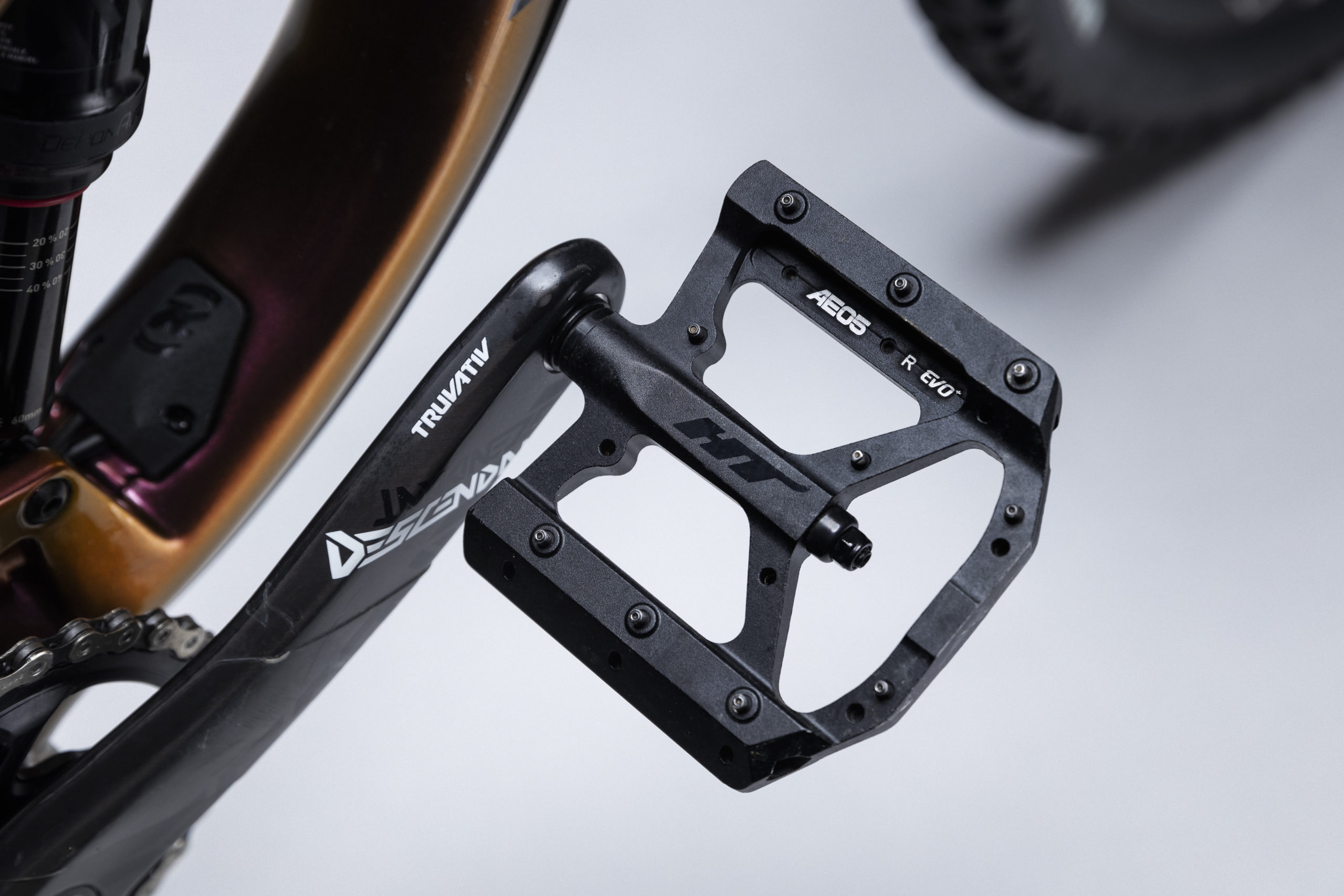 The Rock Shox Super Deluxe rear shock, and SRAM XO cranks remain stock. HT AE05 flat pedals keep the stealthy theme going.