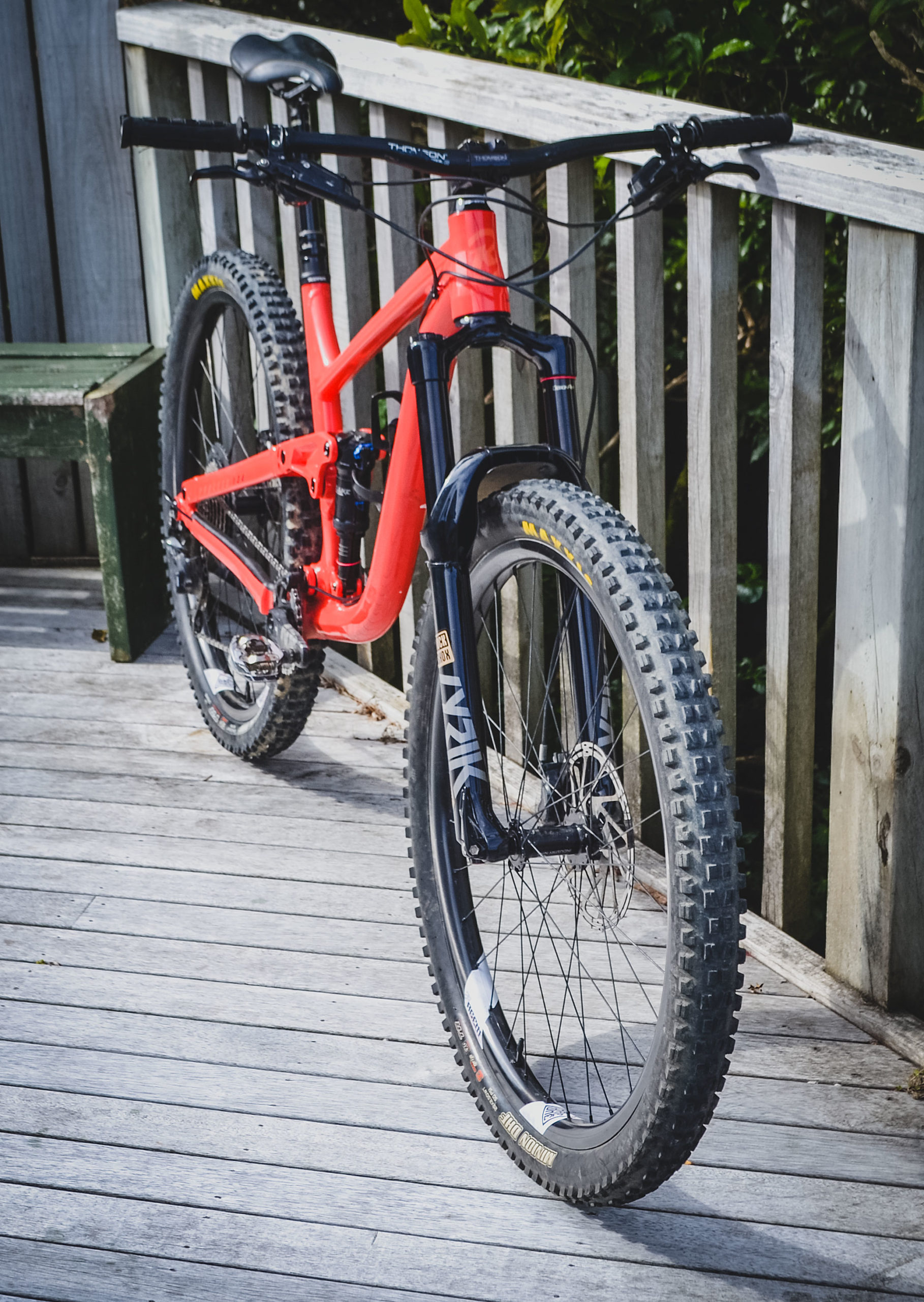 Up front, he’s swapped out the 140mm Pike for a 150mm Lyrik Ultimate. James is not a fan of the 35mm bar standard and to that end is rocking probably the raddest 31.8 bar and stem combo ever. A Thomson Elite stem mated to a matching Thomson Elite handlebar