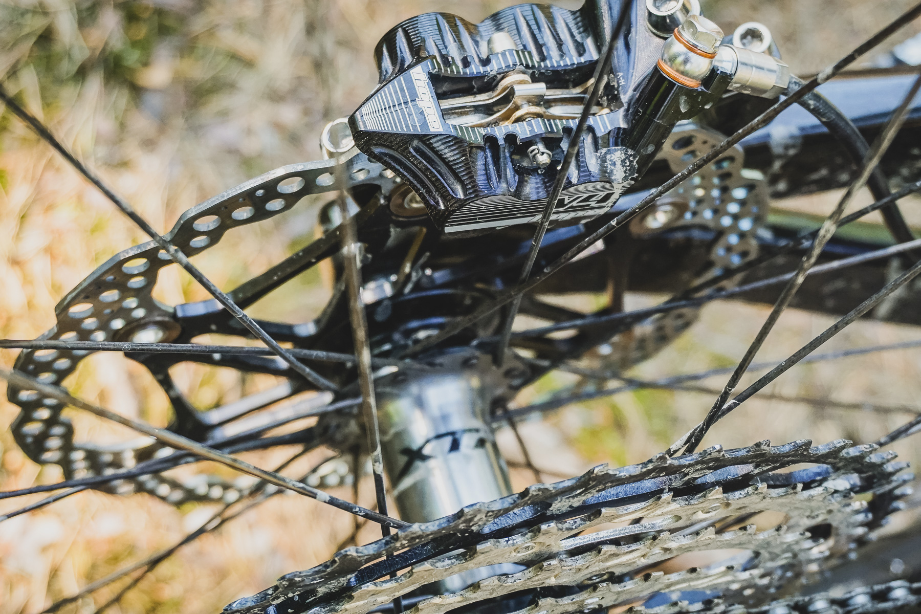 A Shimano XT chain mates up with an SLX 10-51t cassette, and a Shimano XT rear derailleur takes care of shifting. Shimano polymer-coated shift cables are utilized for ultra-smooth shifting action.