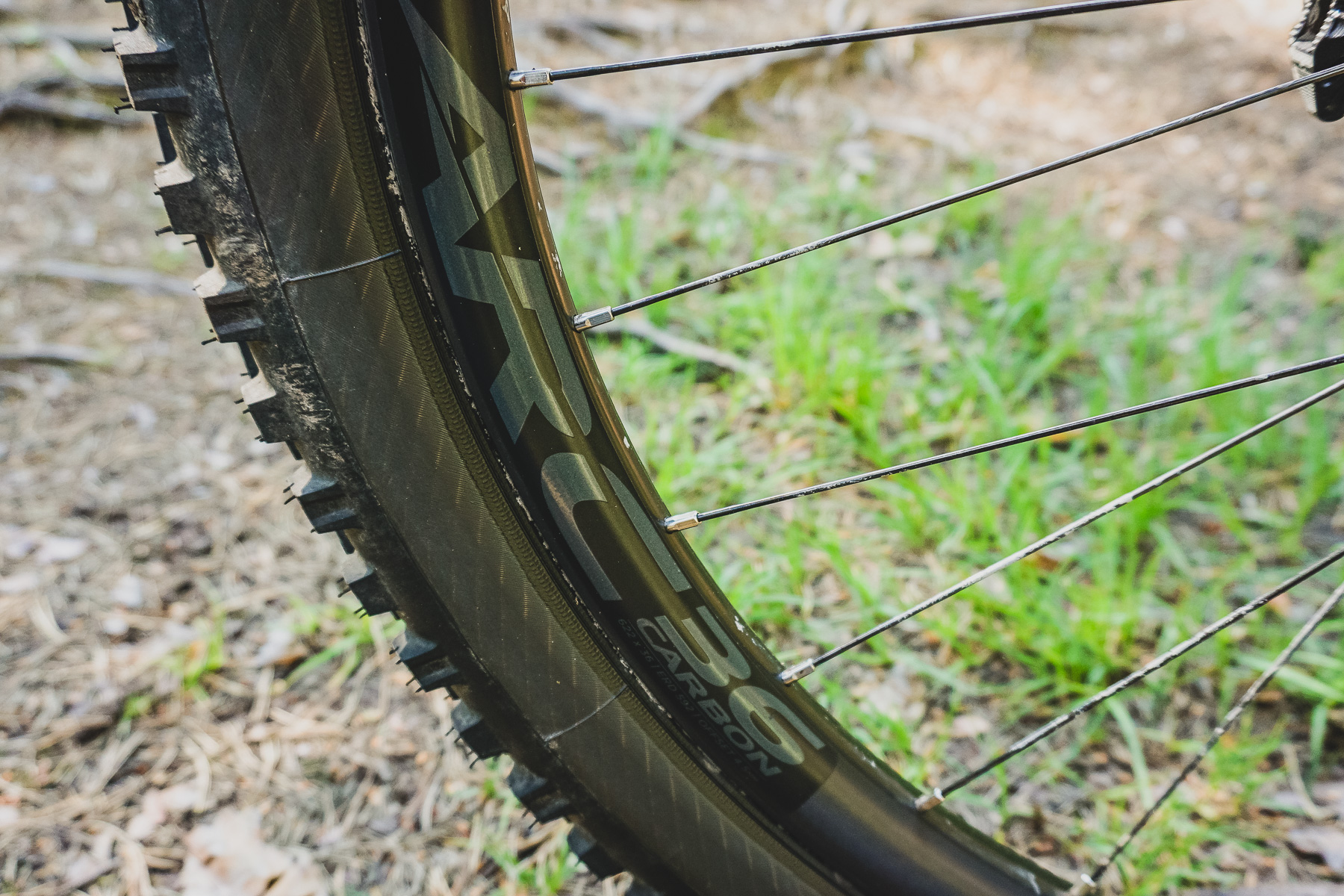 The wheels are Race Face ARC 36 carbon rims laced to XTR hubs with brass nipples and double-butted black Alpina DB1.7 spokes.