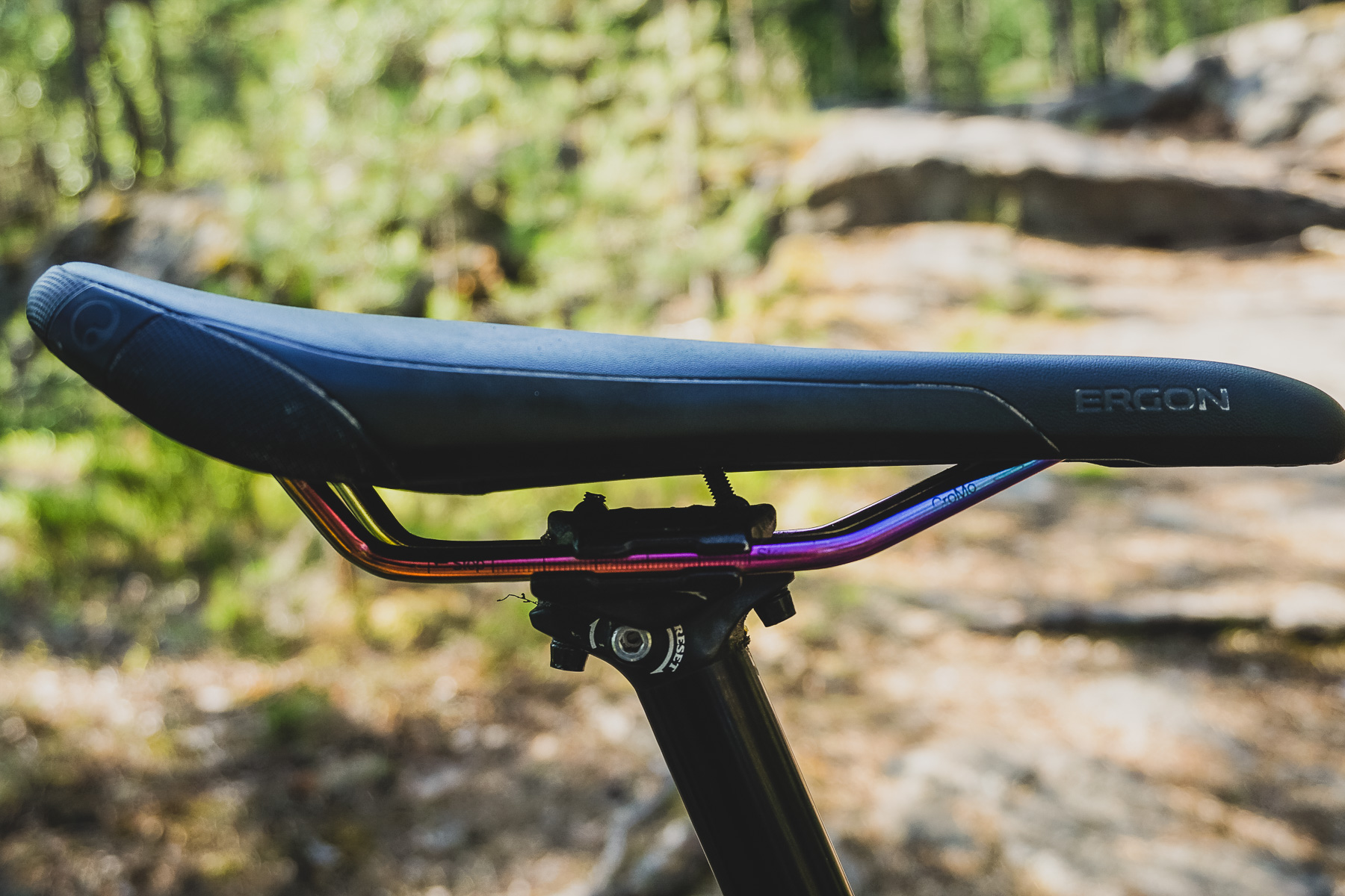 A 160mm Bikeyoke Revive dropper post looks after up/down ness and an Ergon SM Enduro Comp saddle with oil slick rails keeps things comfy.