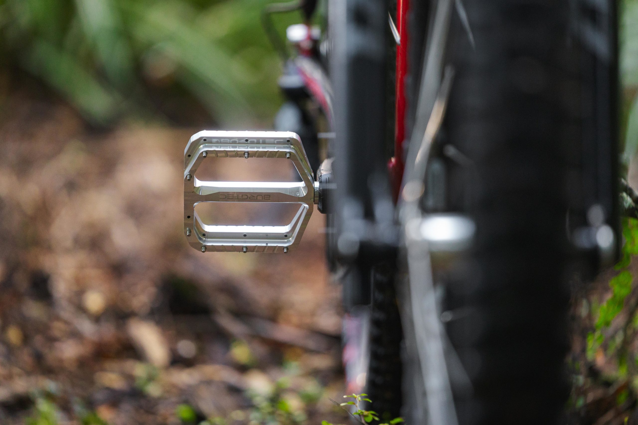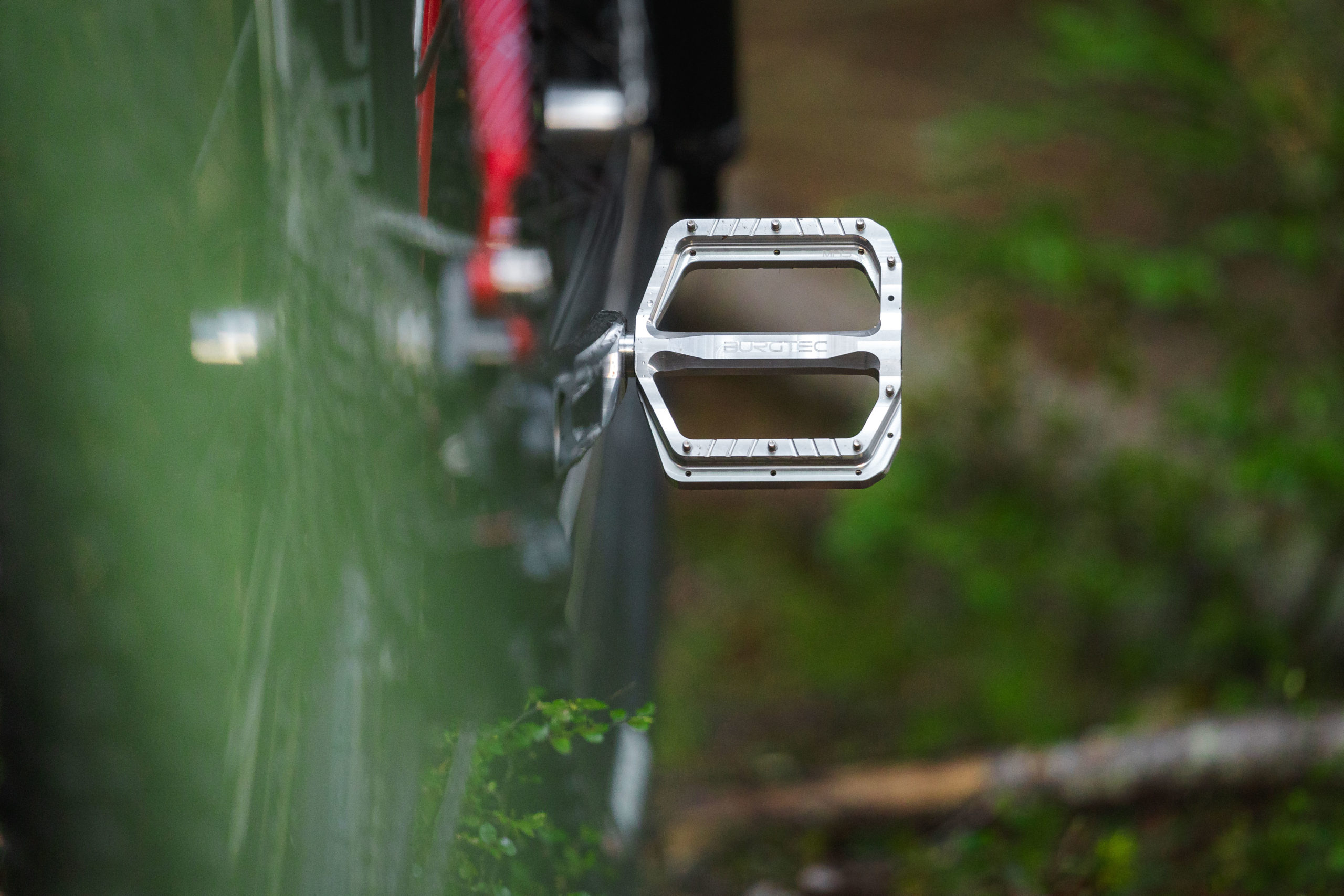 I’m a flat pedal rider out and out. I think I tried clips twice in my life but they aren’t for me. I’ve run so many different types of flat pedals. You name it, I’ve probably ridden it. This time I’m giving the Burgtec MK 5 a go. After a few rides, I can say they are super grippy and have a pretty good shape to them. Not wide.