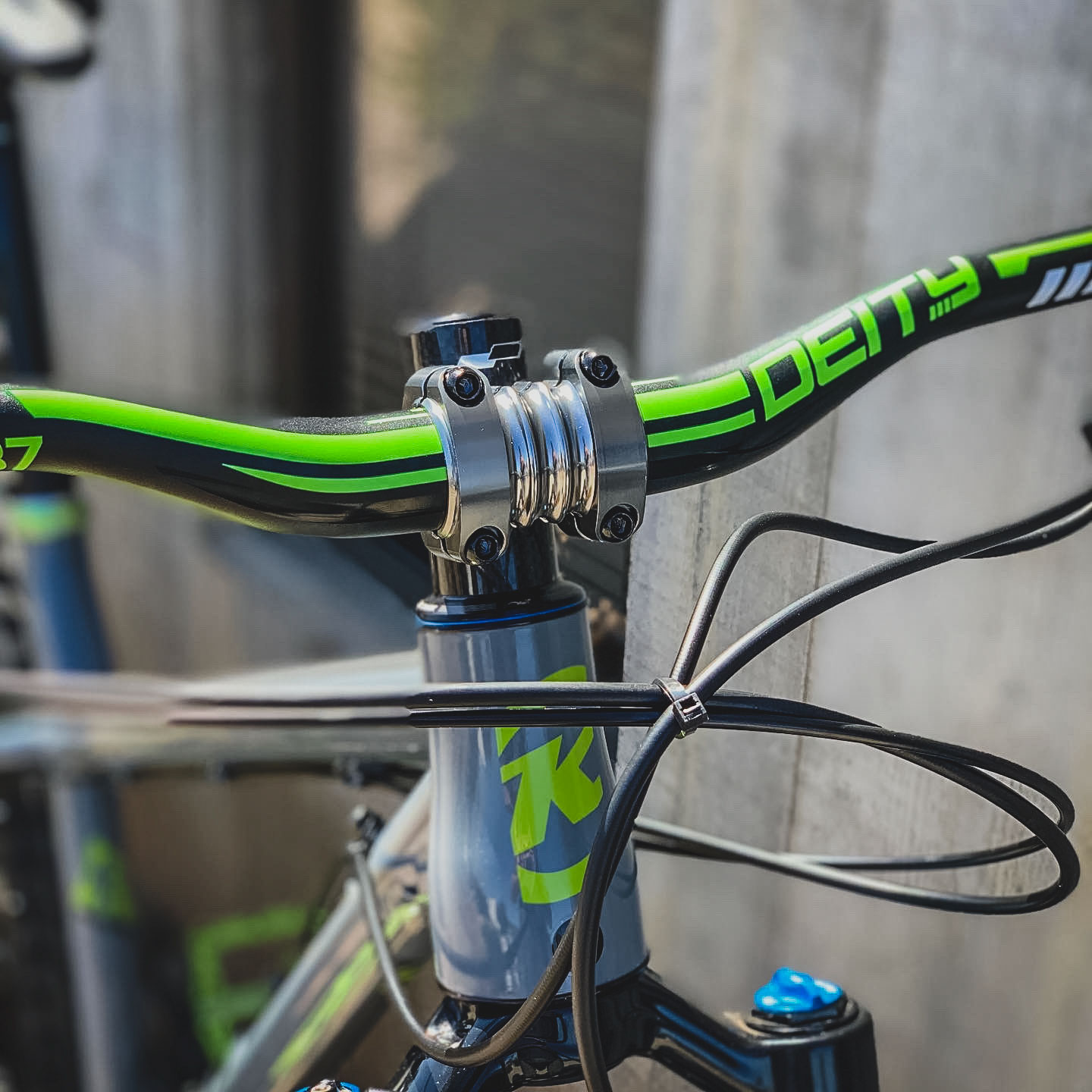 Deity’s 787mm Skyline bar is mounted up on chrome finished Deity 31.8 Copperhead stem with TRP Quadium brakes.