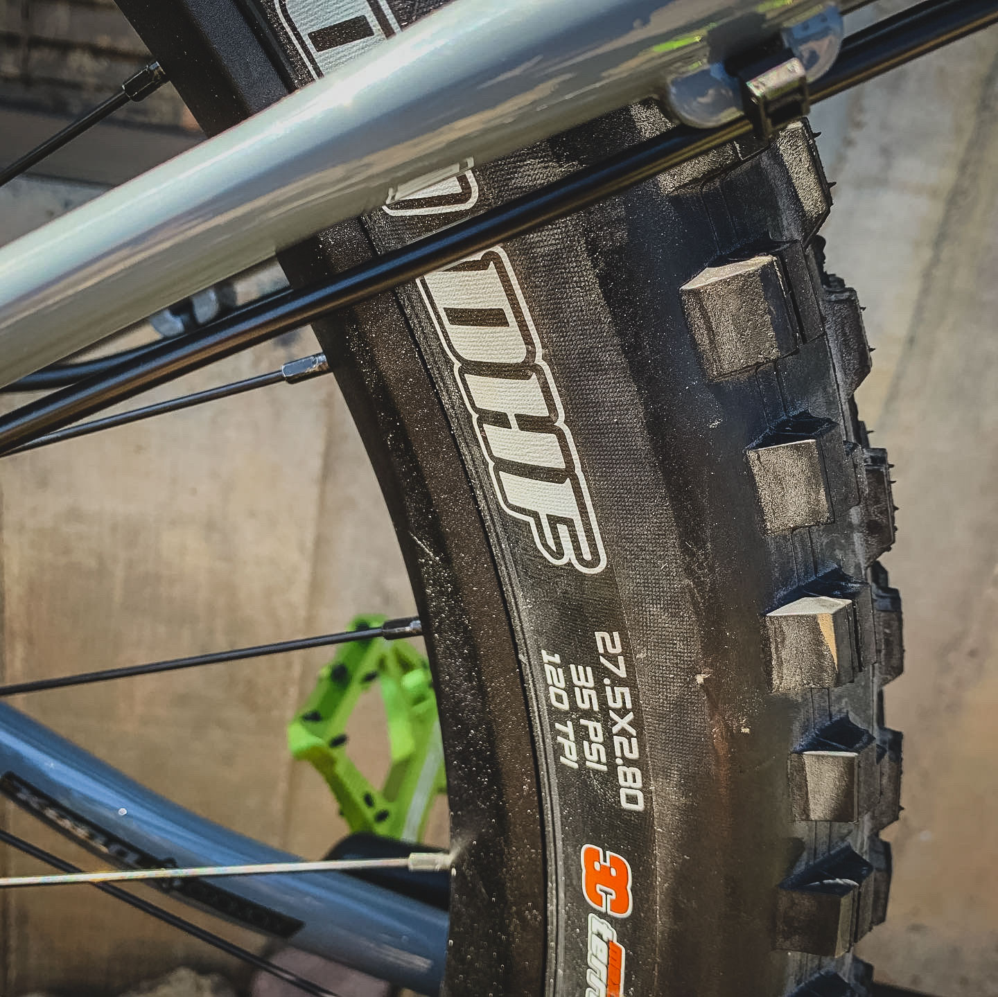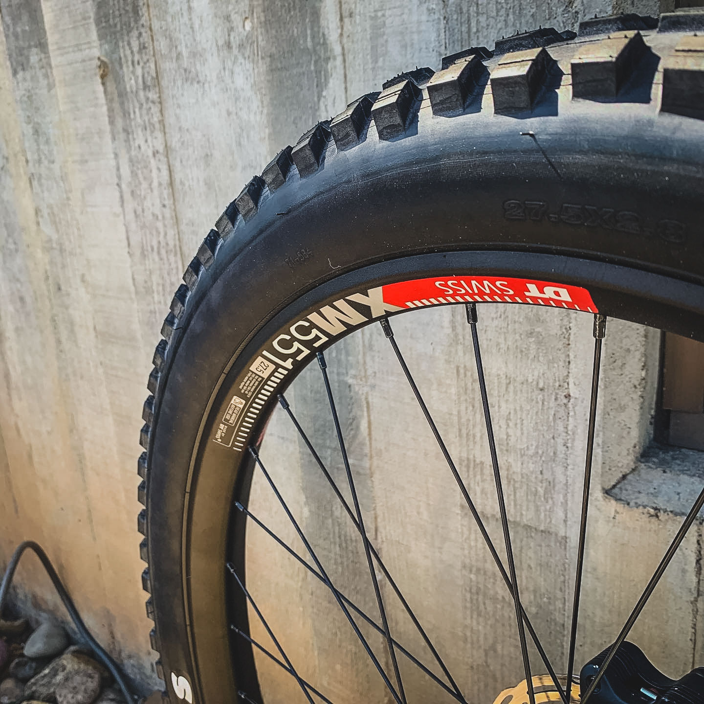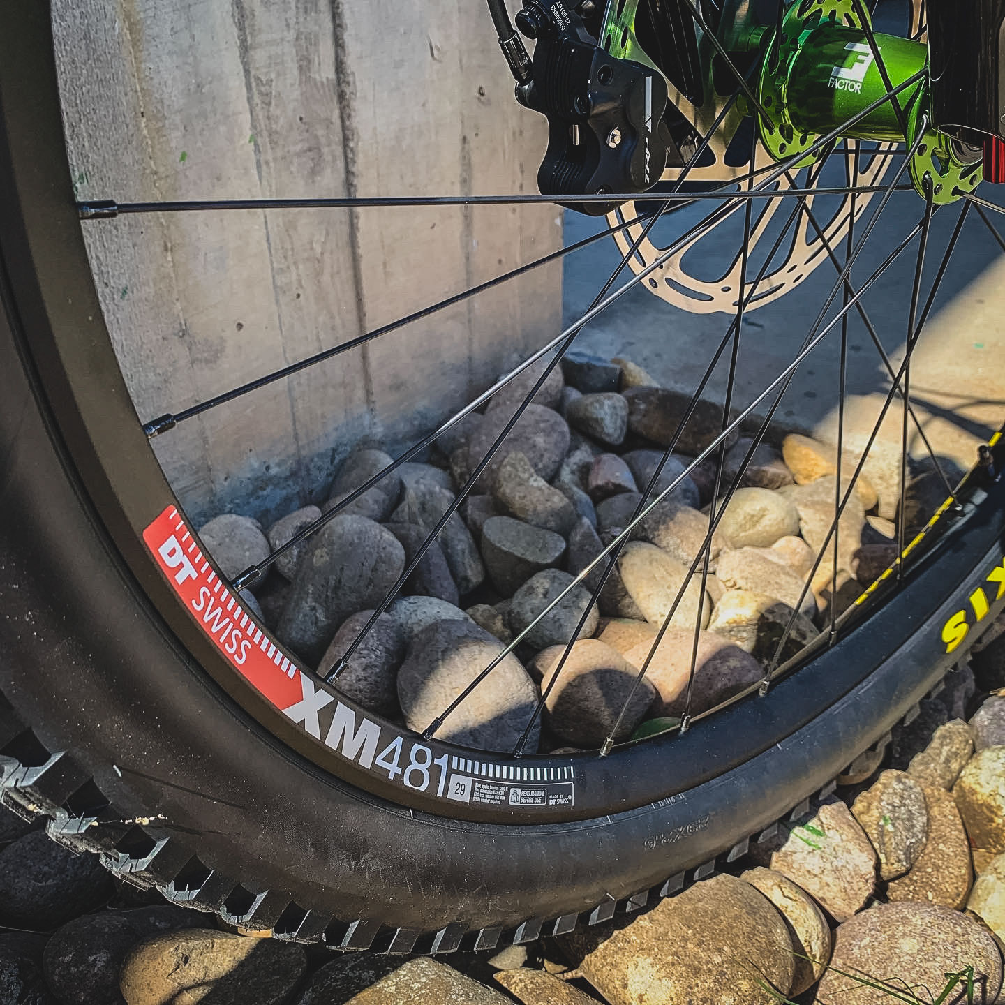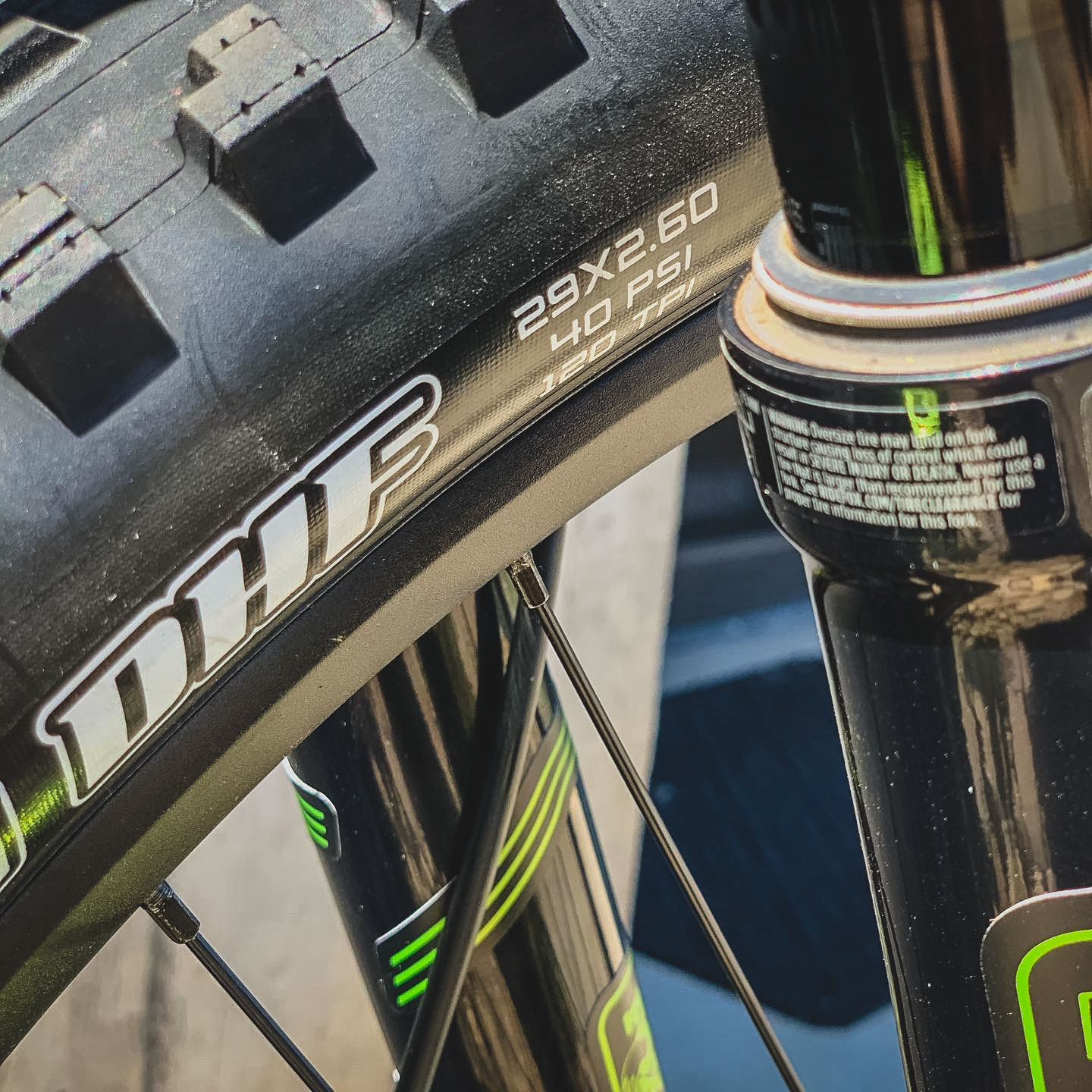 Up front you’ll find a similar combo, the wheel is build around the green Novatec Factor hub again but this time laced to DT Swiss XM481’s. The front wheel is rocking a 29″ x 2.6″ Minion DHF.