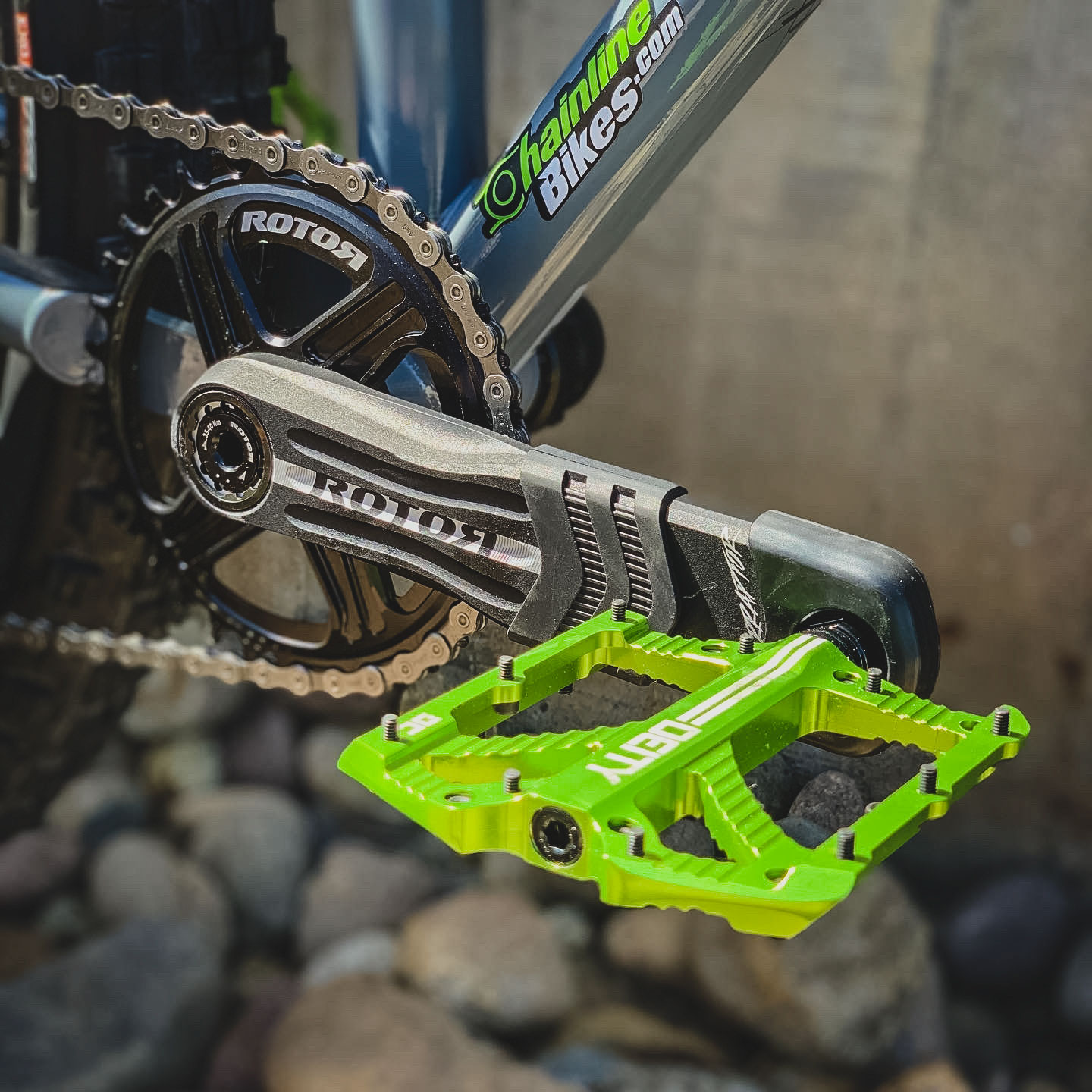 The build has picked up on the 2020 Honzo ST’s green highlights and really run with them, Deity’s Blade Runner pedals kicks things off, the custom decal’d Fox Factory 34 Grip 4 fork keep things rolling and a few little Deity components highlights in the handlebar and seat collar repeat the green radness. The drivetrain is a mix of Rotor’s all mountain R-Raptor Crankset and SRAM XO Eagle rear derailleur and cassette.