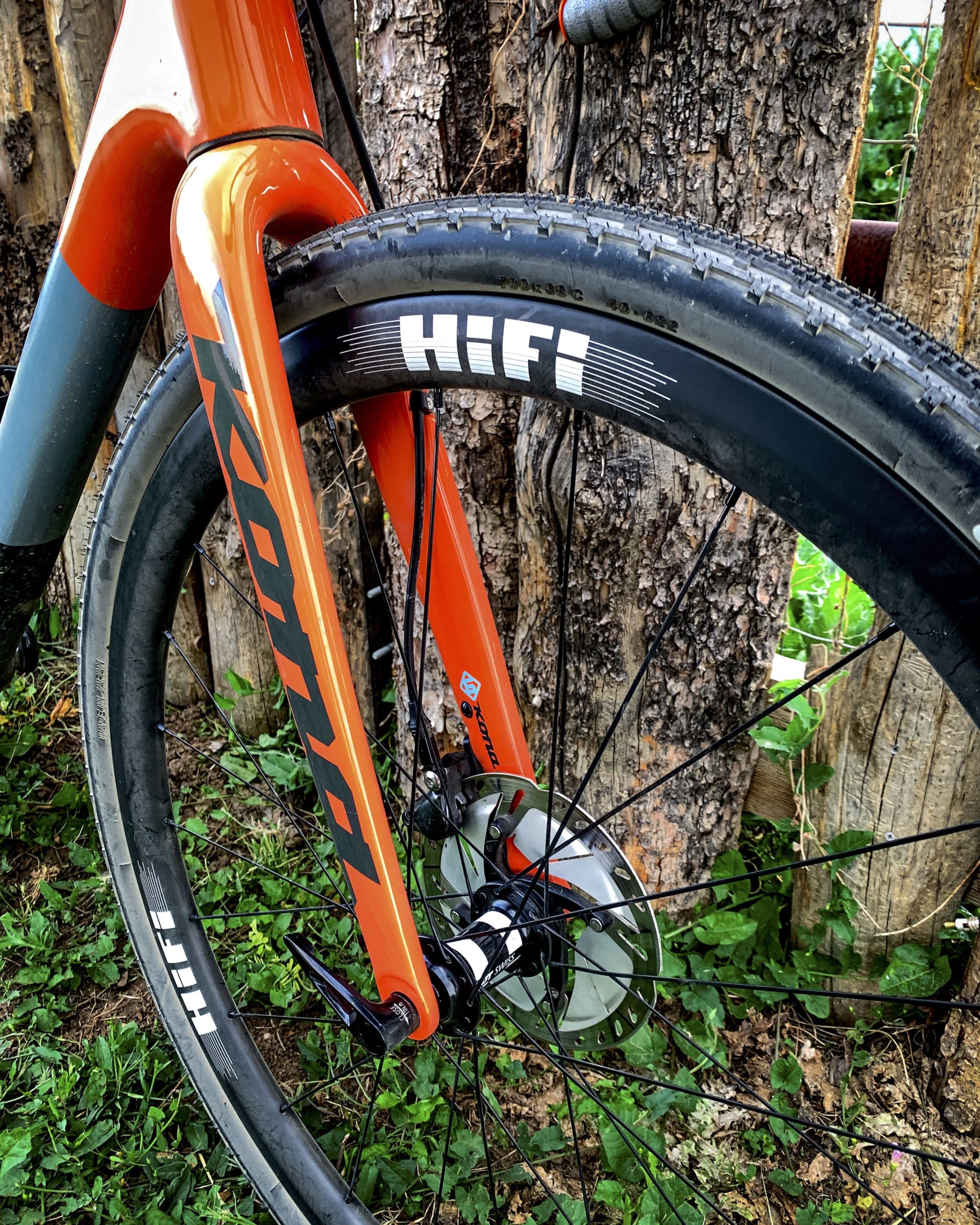 The carbon wheels are from HiFi and are 38mm deep and 25mm wide, they are laced to DT Swiss 350 hubs. The wheels are shod with 700×38 Panaracer Gravelking SK+ tires. Braking comes courtesy of more SRAM Force goodness, mixed with some Shimano rotors.