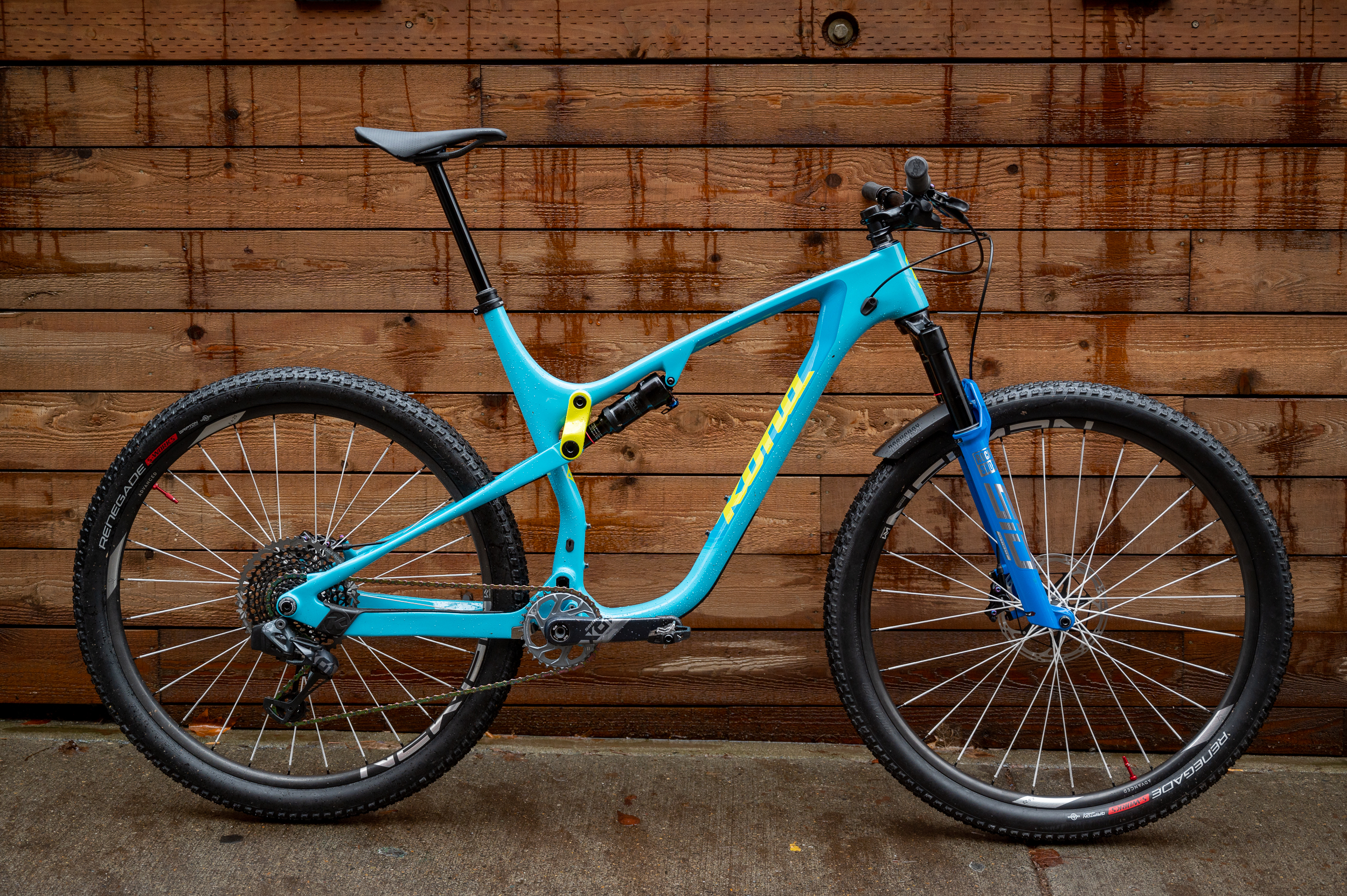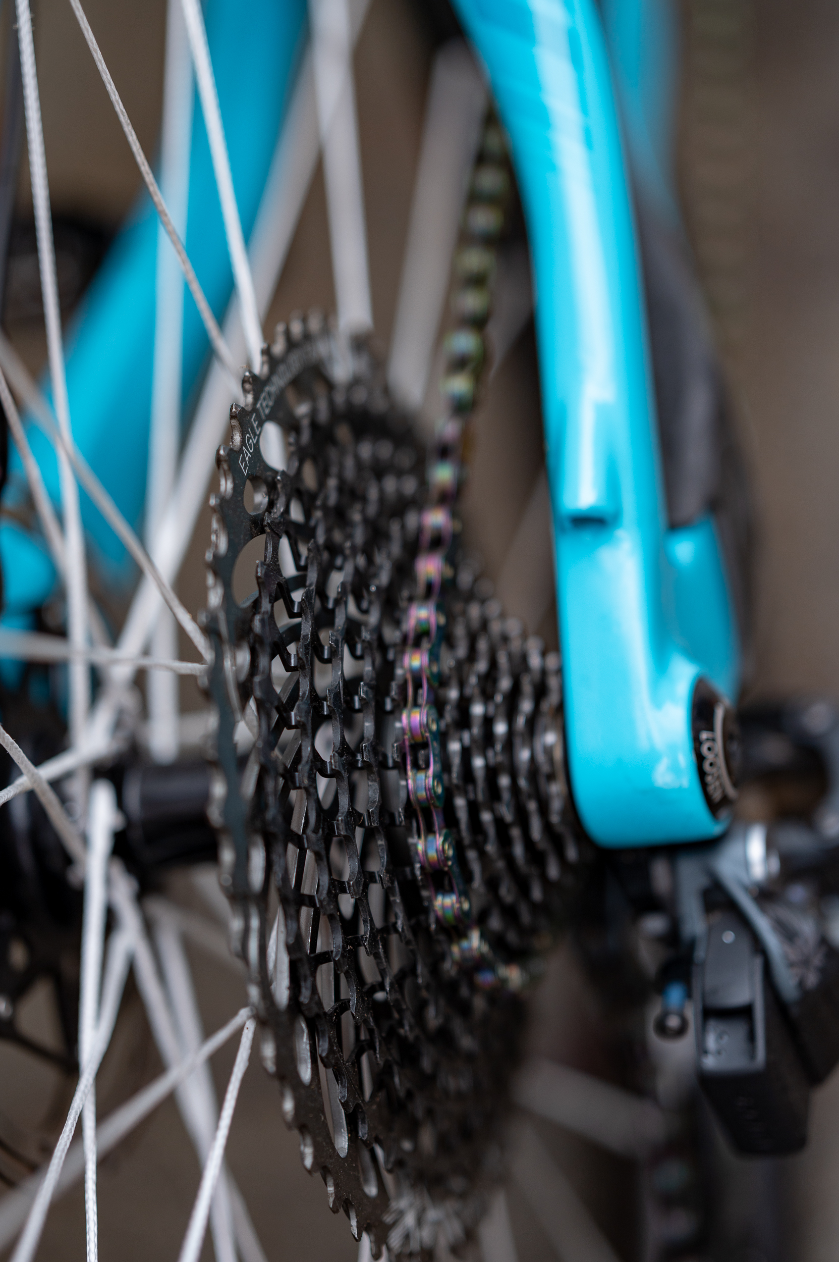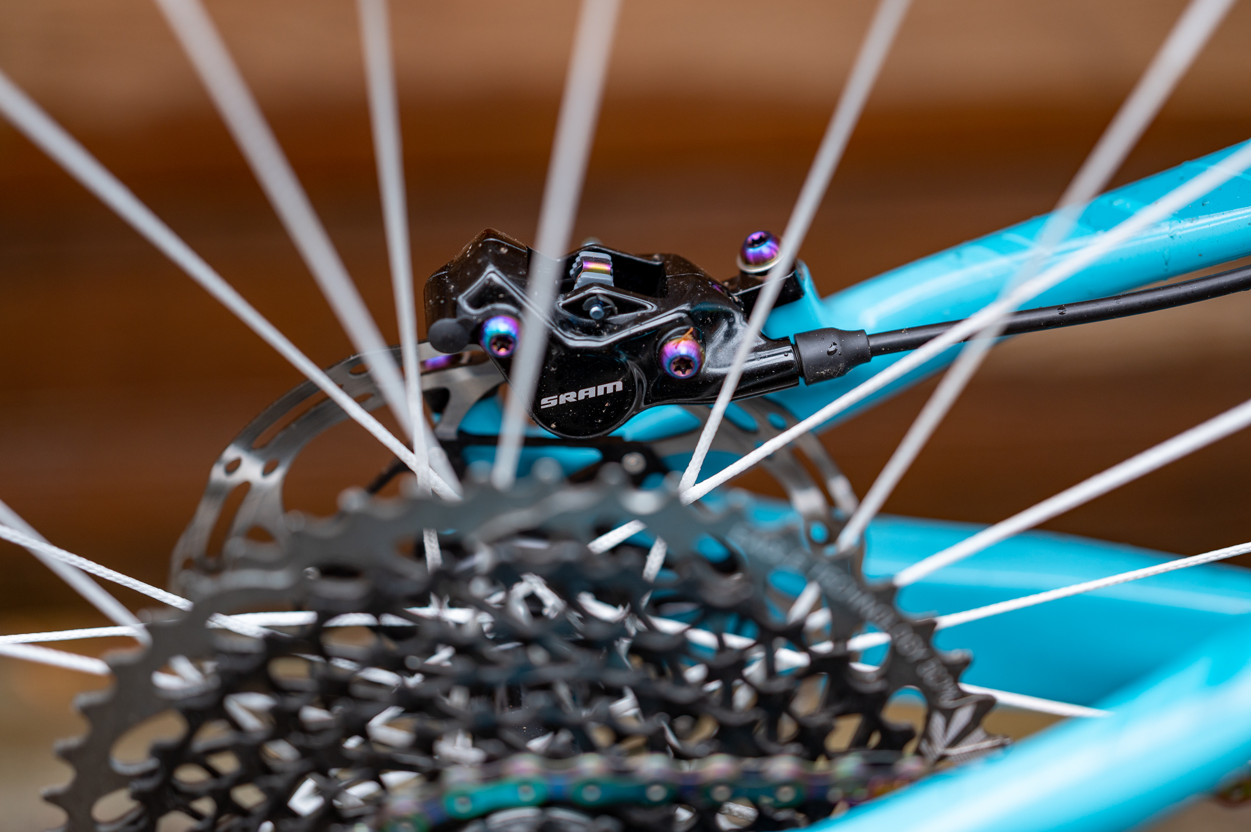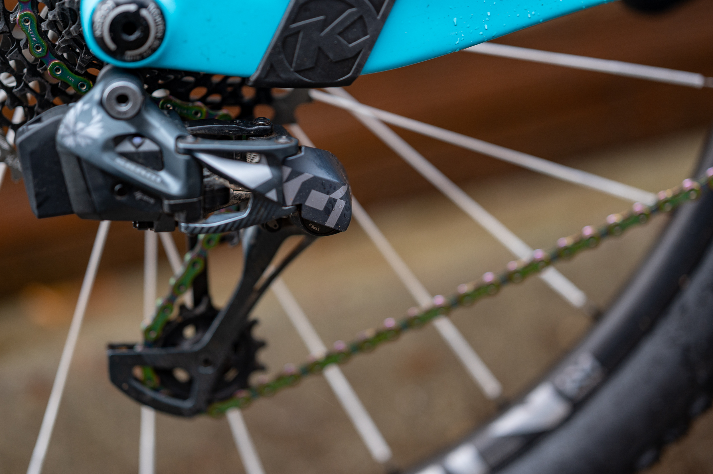 An oil slick rainbow SRAM XX1 chain mated to an X01 rear cassette completes the drivetrain.