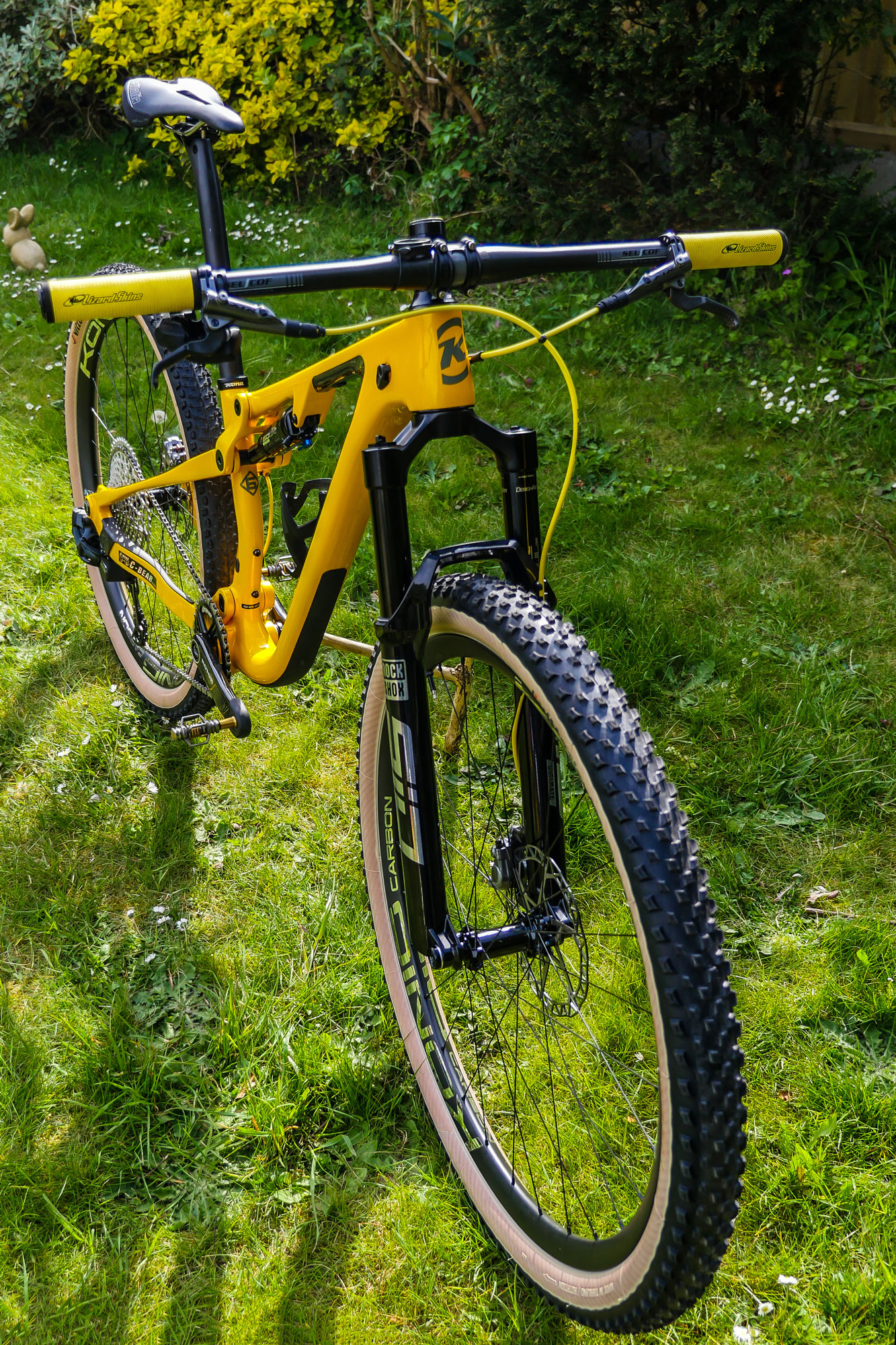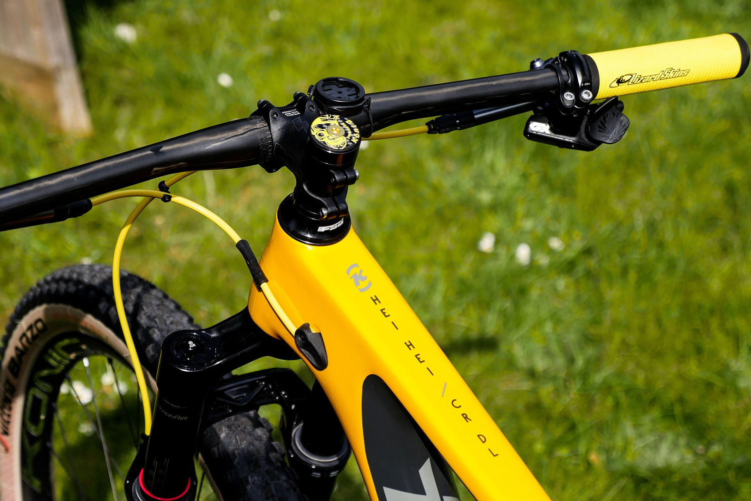 Valerio likes simplicity and the Hei Hei cockpit reflects that; the yellow beast is controlled by a super lightweight 60mm (-17º) stem from MtZoom connected to a Selcof Italiana carbon flat bar (720mm), fitted with some cool Lizard Skin DSP grips. The machine is stopped by the Shimano XTR 9000 brakes upgraded with the Jagwire Pro Hydraulic Hose and quick-fit system, and KCNC rotors.