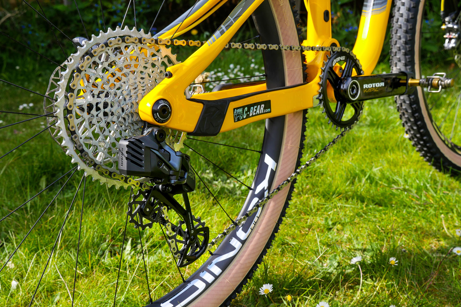The drivetrain is upgraded with Rotor Kapic carbon cranks that allow for a quick chainring change and power meter add-on. Valerio rides a Rotor 34T Qring chainring with the cranks smoothly spinning on a C-Bear ceramic bottom bracket. The rest of the drivetrain gets an ultralight Garbaruk 10-52T cassette shifted up and down by the Sram GX AXS that has been upgraded with a carbon inner cage and bigger pulley wheels.