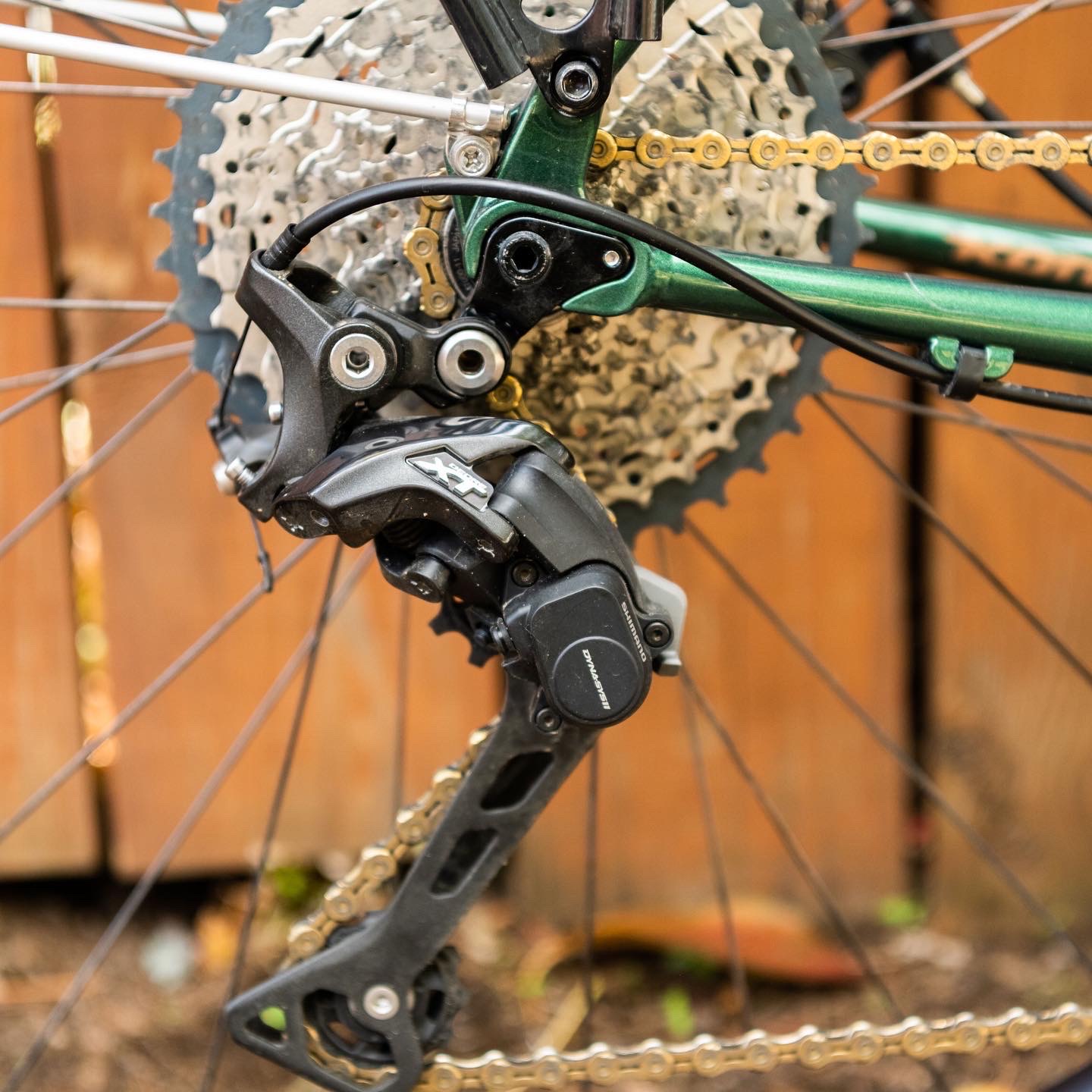 Shifting duties are performed by a Shimano XT M8000 rear derailleur, you’ll notice there is no Wolf Tooth adapter for the MTB specific rear derailleur, instead…