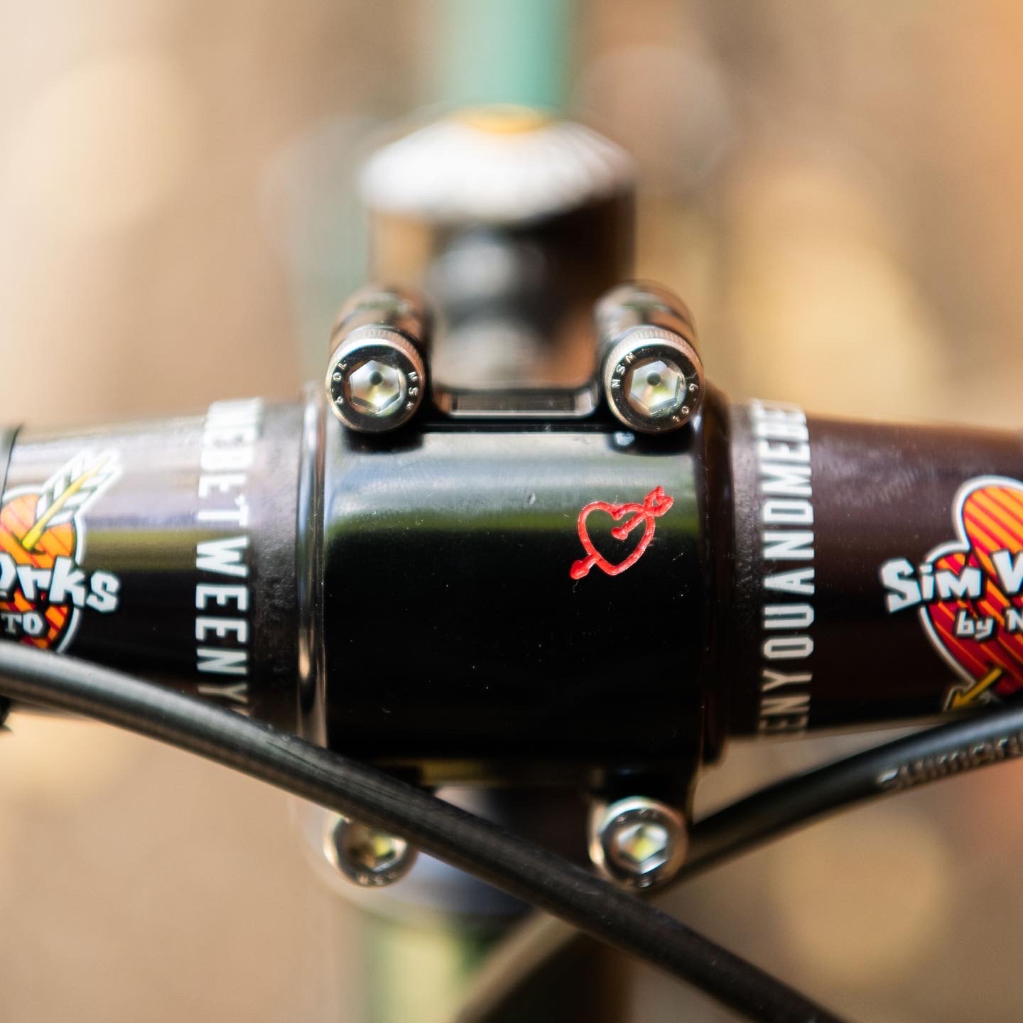 The cockpit is just a whole bunch of Sim Works goodness. From the hand-etched Rhonda stem to the flared Wild Honey handlebar, this build is as unique as they come.