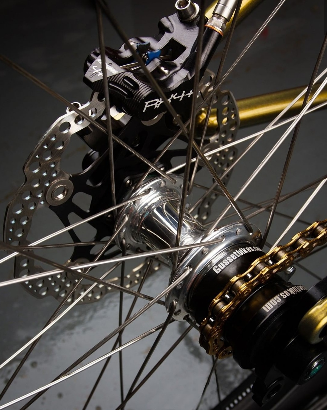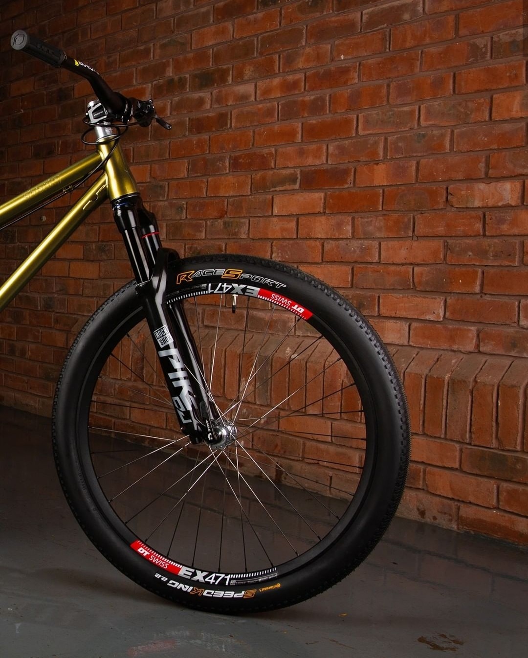Will has opted for the tried and true Rock Shox Pike DJ fork up front and some rad DT Swiss ex 471 built onto White Industries CLD hubs. Using some custom DT Swiss comp black to polish fade spokes. He threw a couple Continental Speedkings on the wheels too.