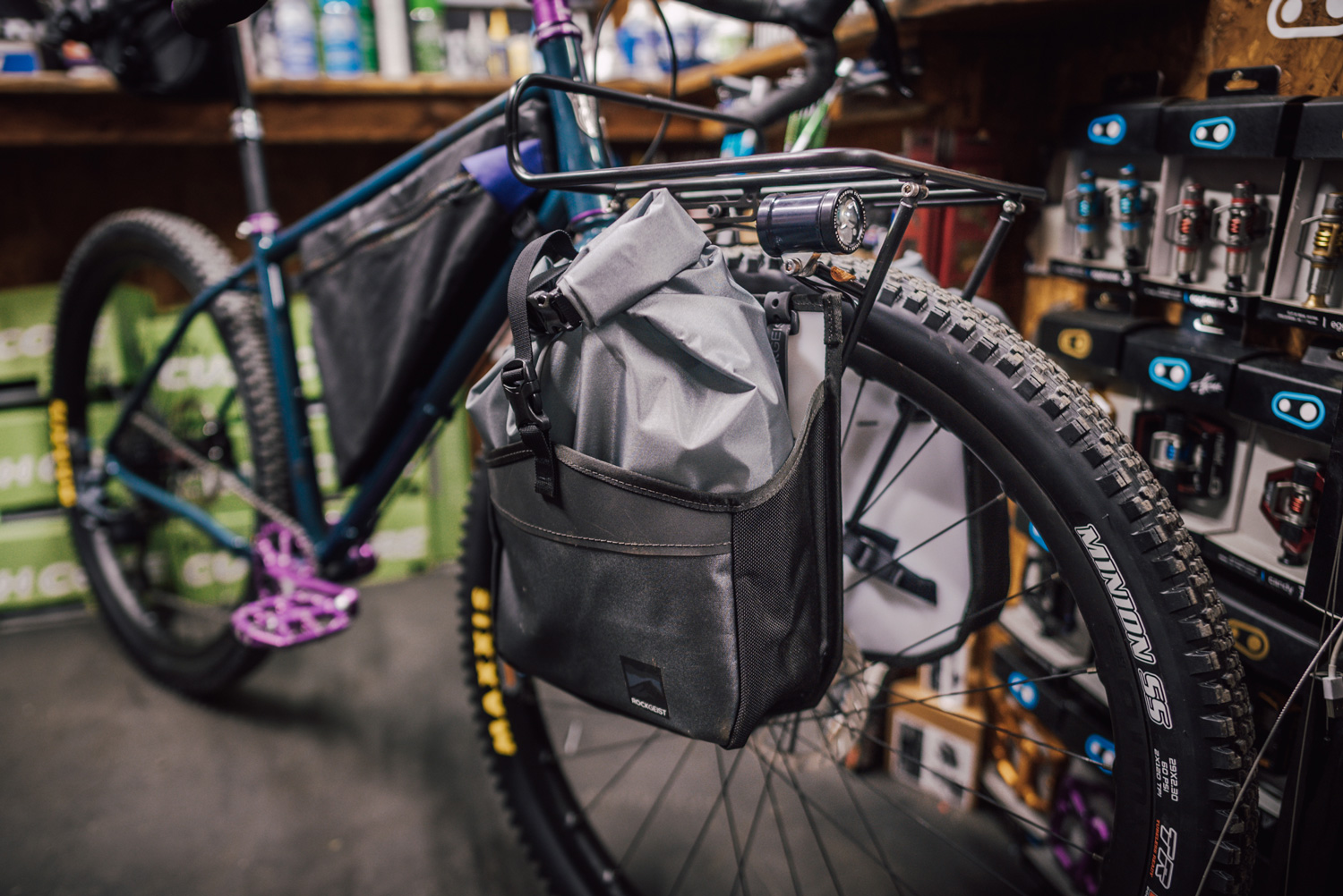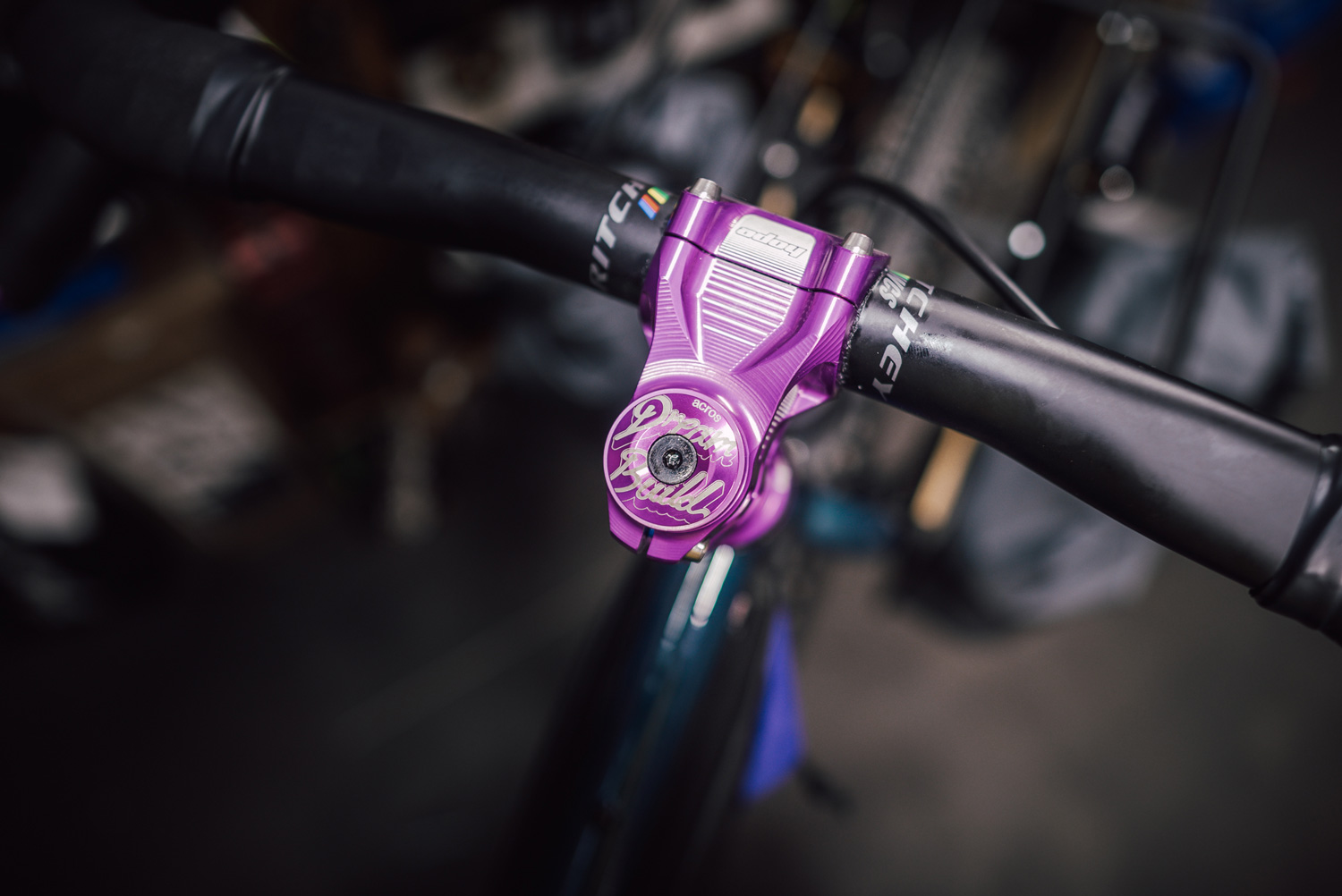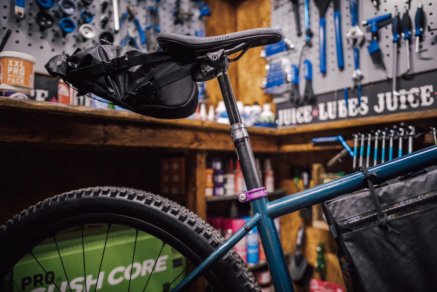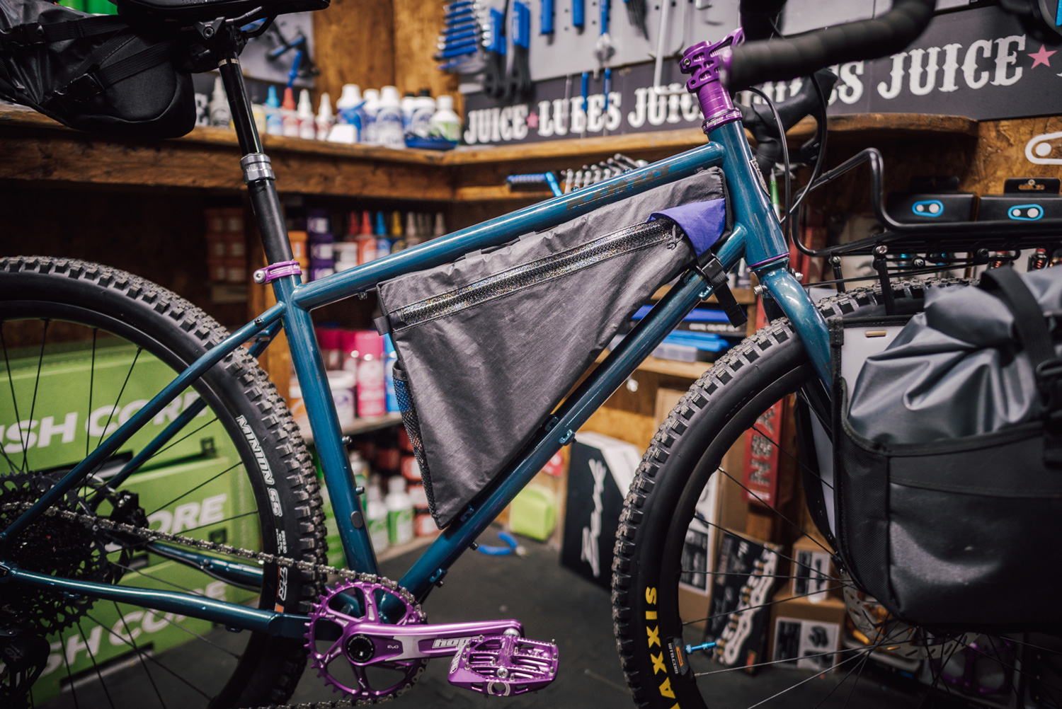 All other components were chosen to be durable and fuss-free while riding – tough WTB CZR i30 carbon rims, Maxxis Minion SS 29 x 2.3 tires with dual 120 TPI casings, beautiful purple ano Hope parts, and a tough as nails Pass and Stow Five Rail rack. We finished things off with Rockgeist’s fine bags – Microwave Panniers, a Custom Wedge frame bag, and a Gondola dropper bag allowing for plenty of storage space but a nice and maneuverable setup with the ability to get the saddle out of the way.