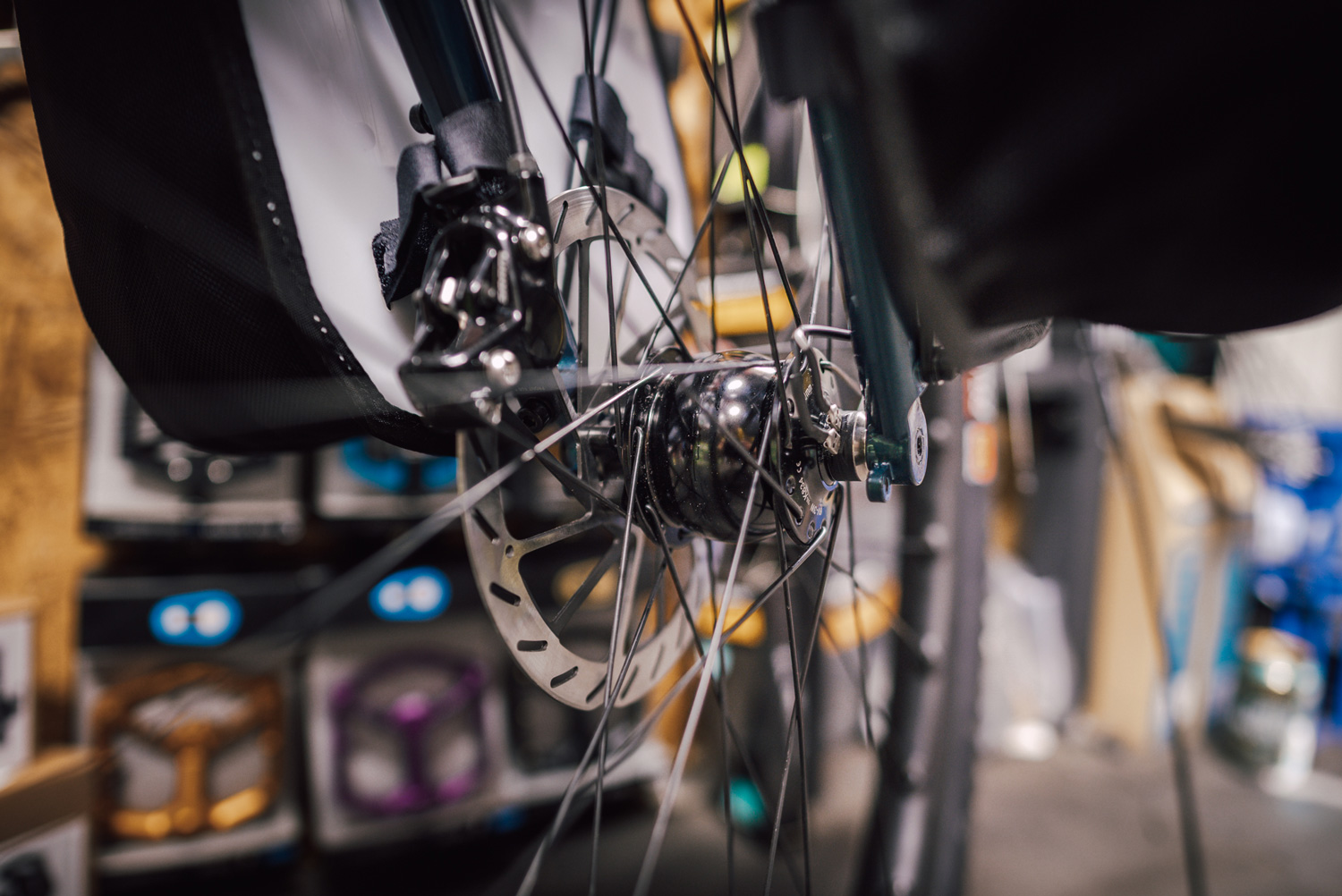 With this Dream Build by Gee Milner, we tried to play off the Sutra LTD’s go-anywhere, rugged touring nature while providing a bit of a modern twist. We went with SRAM’s wireless electronic AXS components, which are refreshingly simple to pair together, allowing for a SRAM GX Eagle AXS mountain rear derailleur paired with SRAM Rival AXS shifters and a Reverb AXS post. A Schmidt SON 28-12 ISO front hub connected to a Sinewave Beacon front light with USB charging, a Goal Zero Flip 36 10,050 mAh battery with pass-through charging technology, and two spare AXS batteries with a charger allows for charging on the fly while touring.