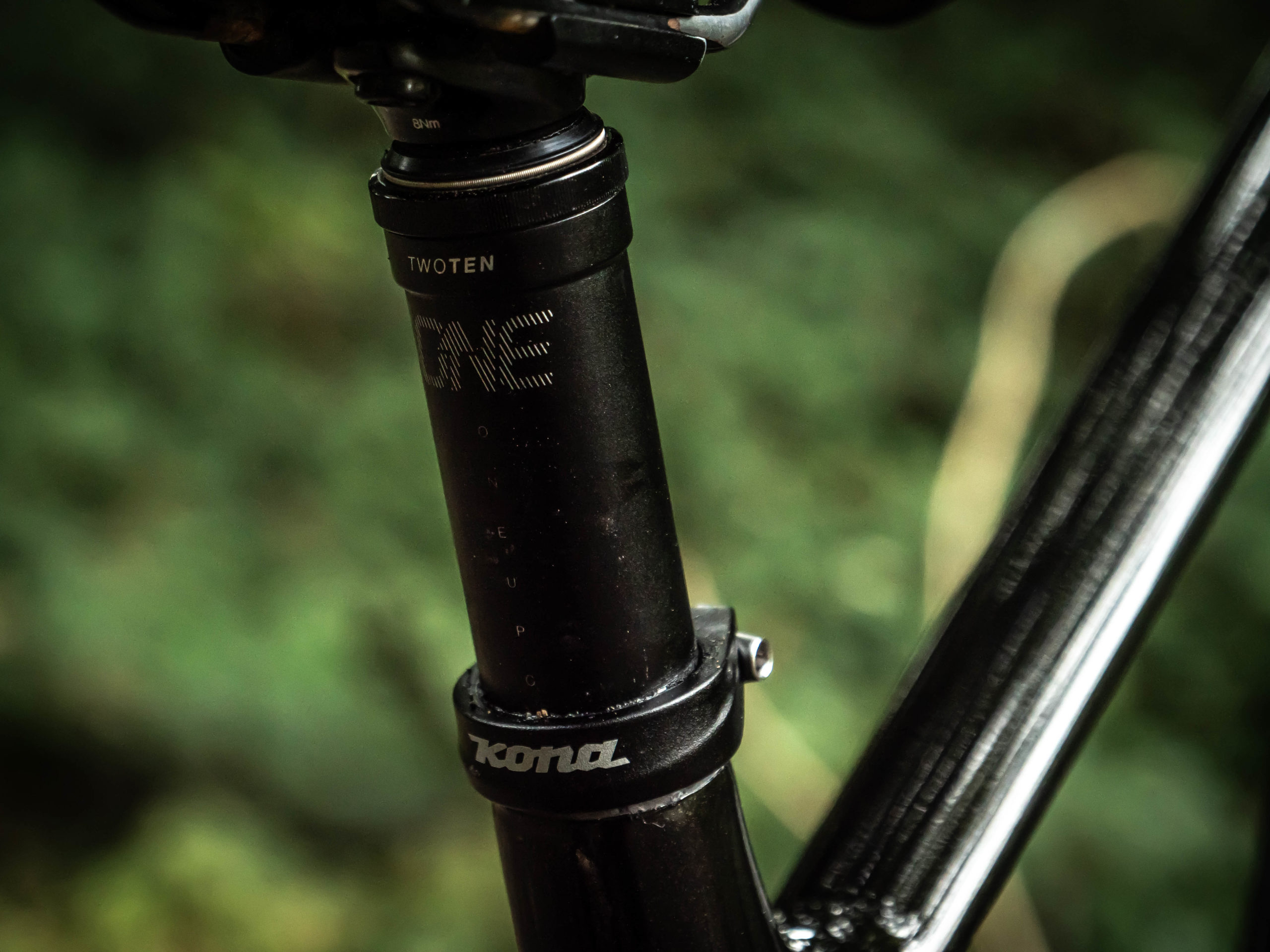 OneUp Components 210 V2 Dropper post gets Ben’s saddle way, way out of the way.