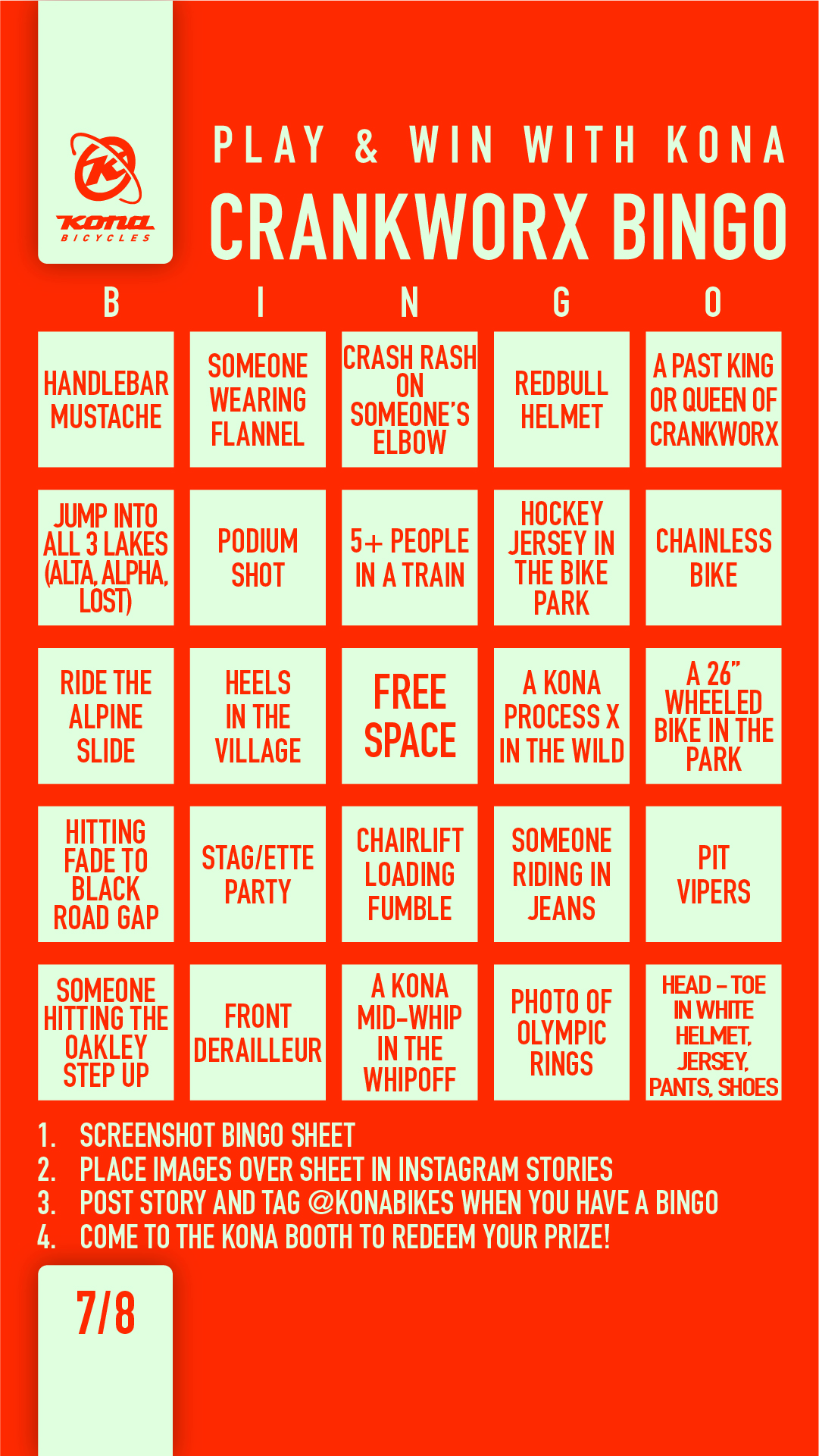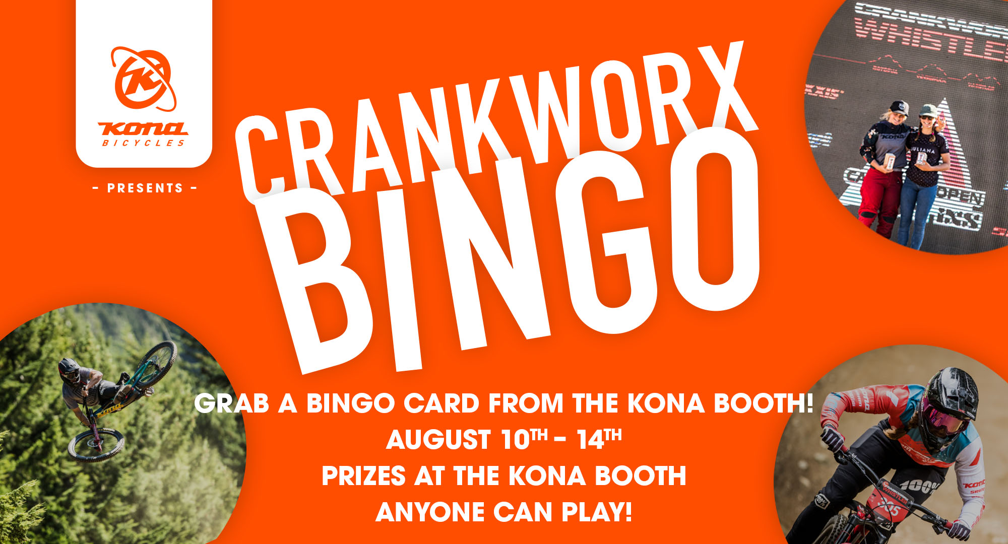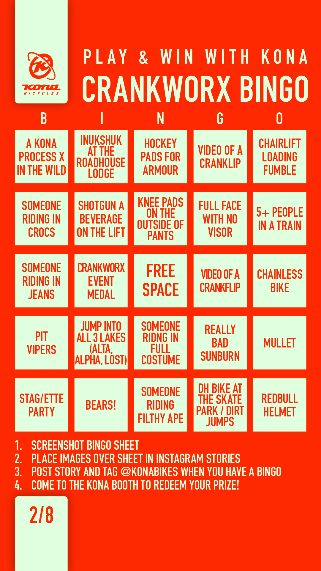 Crankworx Bingo is here! This is your chance to win some sweet Kona prizes! Simply download our digital bingo card and play on your phone or stop by the Kona booth for a physical card! To play on your phone you’ll need to post photos of tasks on your card in an Instagram story and tag @konbikes. When you hit your bingo, stop by the Kona booth near the Blackcomb Gondola and we’ll hook you up with some swag. Bingo is open to everyone attending Crankworx and you’ll need to hang in the village and up in the park in order to win! Be on the lookout for Kona athletes, certain Kona bikes, Kings and Queens of Crankworx, stag/ette parties, bears, dogs and so much more!