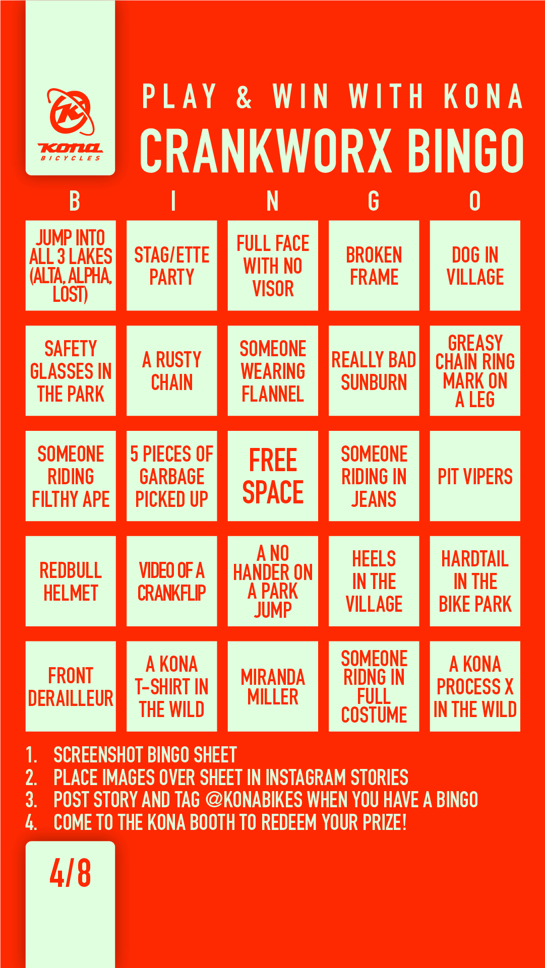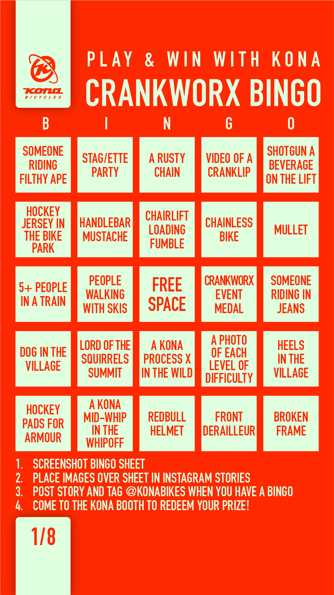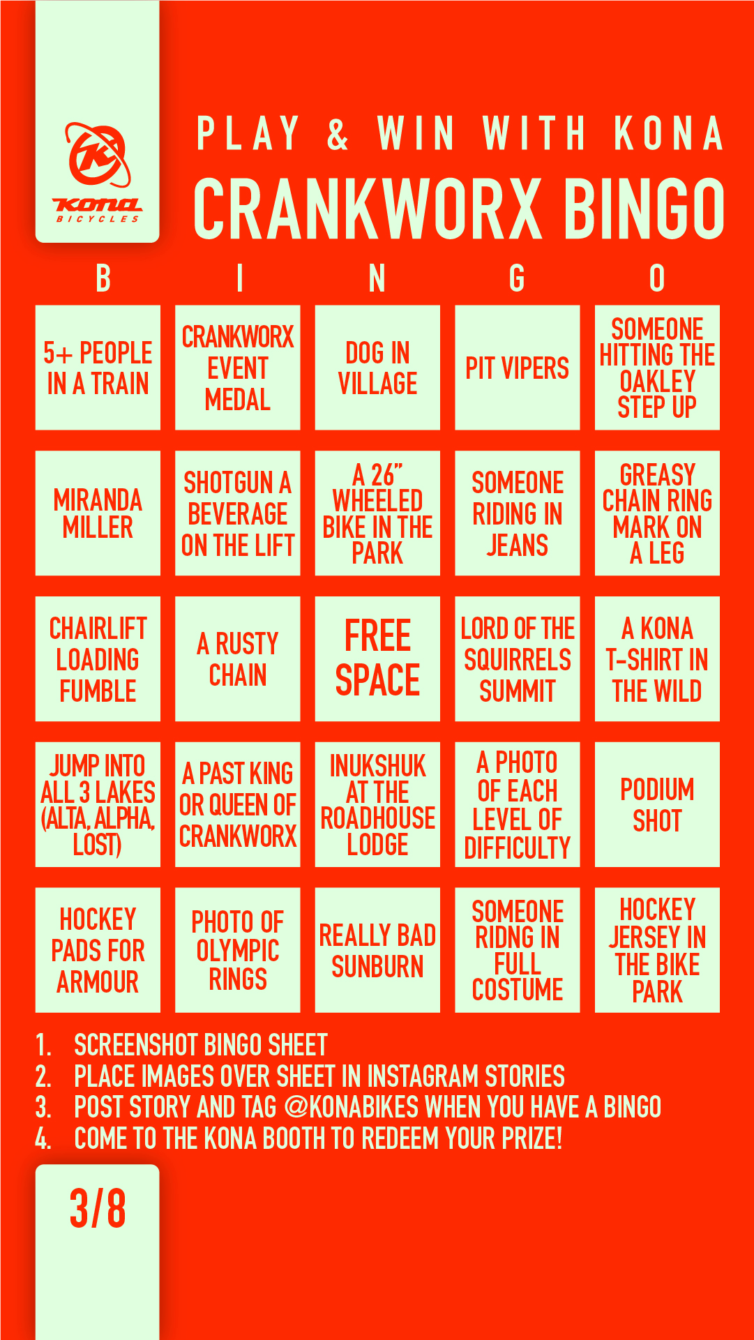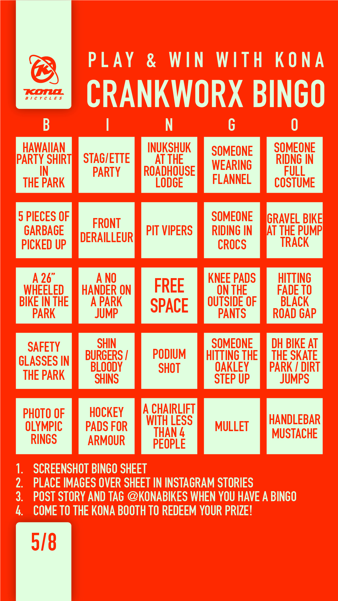 Crankworx Bingo is here! This is your chance to win some sweet Kona prizes! Simply download our digital bingo card and play on your phone or stop by the Kona booth for a physical card! To play on your phone you’ll need to post photos of tasks on your card in an Instagram story and tag @konbikes. When you hit your bingo, stop by the Kona booth near the Blackcomb Gondola and we’ll hook you up with some swag. Bingo is open to everyone attending Crankworx and you’ll need to hang in the village and up in the park in order to win! Be on the lookout for Kona athletes, certain Kona bikes, Kings and Queens of Crankworx, stag/ette parties, bears, dogs and so much more!