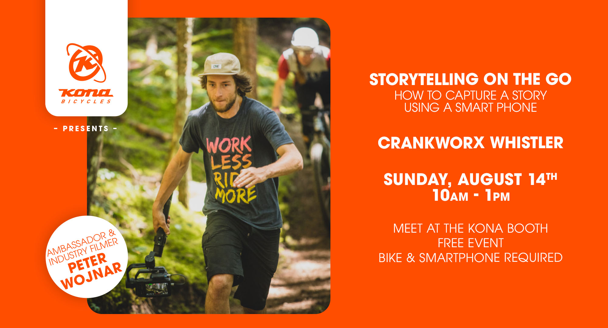 Everyone knows that content is king (or queen) these days. We ride around with the perfect tool to capture incredible content: our phones. But how do you lace together photos or video clips into something more than just a shredit? Join Kona ambassador, storyteller, and Dirt Diaries filmmaker Peter Wojnar in this free-flowing, interactive discussion about shaping a story in any medium. Bring your bike, your phone or camera, and your curious storytelling eye for a ride that’s part discussion, part workshop, and part shoot—and see what comes of it! Whether you want to focus on photos, videos, or writing, you should expect to ride a moderately challenging trail in the Whistler Valley.