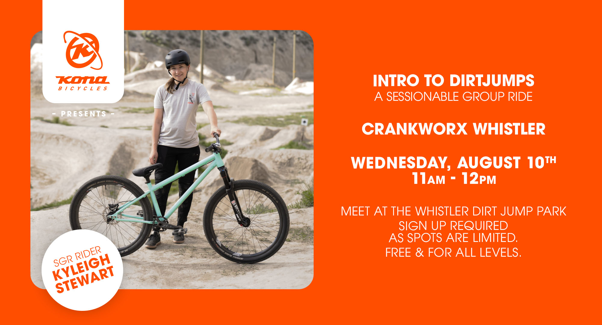 Super Grassroots rider Kyleigh Stewart is the buddy we all want to session dirt jumps with! Her effortless style and simple pointers inspire those around to get after it! This ride is from 11:00AM to 12:00PM and we’ll be meeting at the Fitzsimmons Creek bike skills park!
