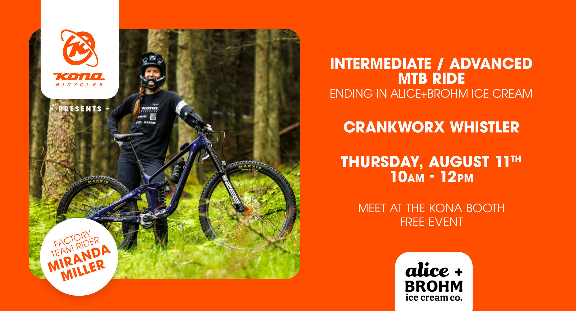 Ready to get out for a rip? So is Factory Team Rider Miranda Miller! Join her for an intermediate/ advanced ride. We’ll meet at the Kona booth in the Village at 9:45. You will need a lift ticket for this ride as we will be going into the Bike Park. Photographer Caleb Smith will be with us to capture the magic and you’ll be able to download your photos after the event.