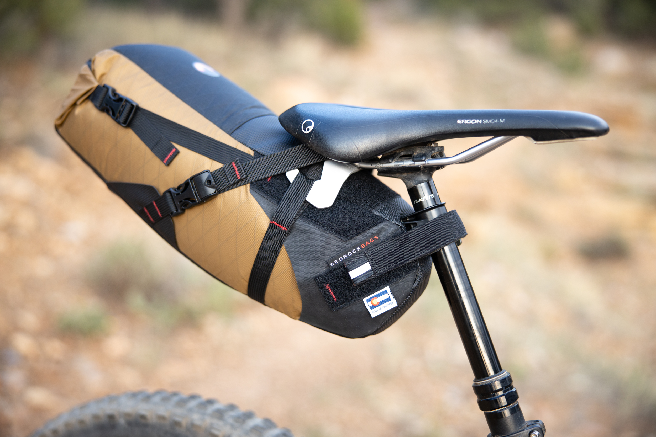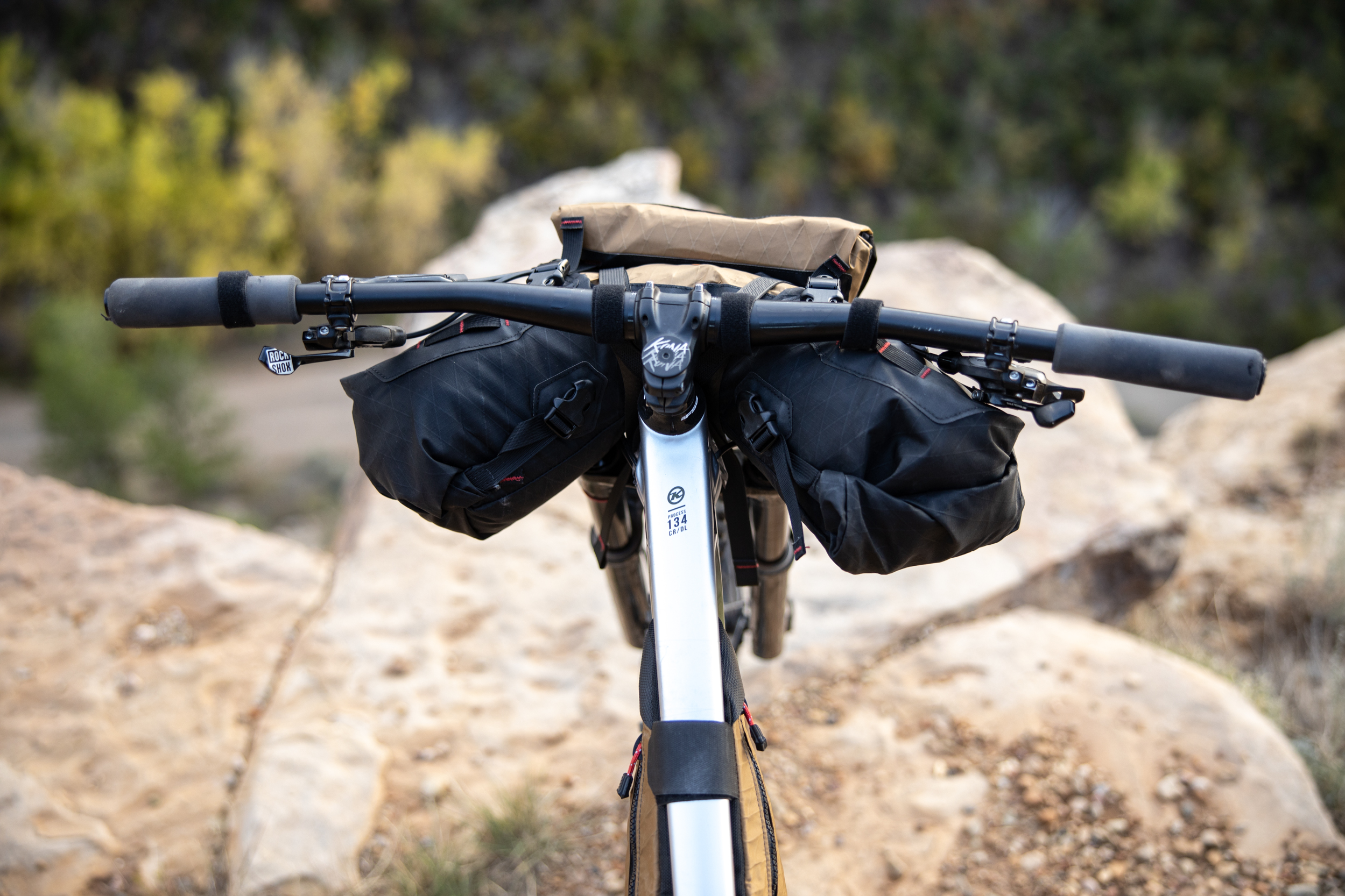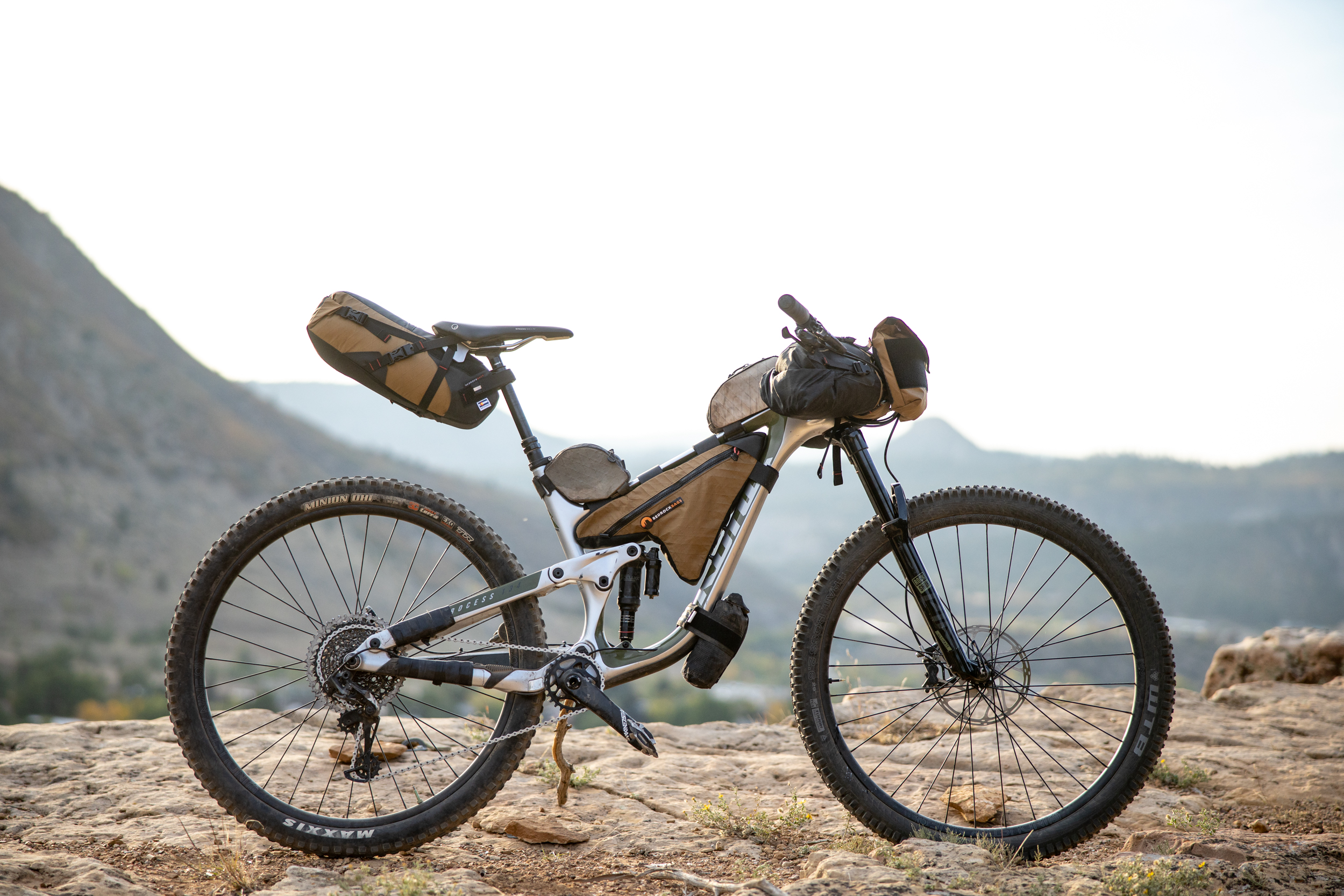 The Process offers plenty of frame space for a custom bag and no one does custom bags better than Bedrock Bags located here in Durango. Additionally, Bedrock Bags has revolutionized bikepacking bags intended to be used in technical singletrack terrain. Their Moab handlebar bag wraps around the headtube to keep weight centered. Their Black Dragon seat bag is designed around dropper posts. The slim configuration and integration with the Wolf Tooth Valias clamp enables you to drop your seat (most of the way) when the descents get techy. All of their bags are the most rock-solid bags I’ve ever used. No seat bag sway, the handlebar bag stays put, which helps increase the handling tremendously. Gosh, how about that Coyote brown colorway and desert tower stitching!